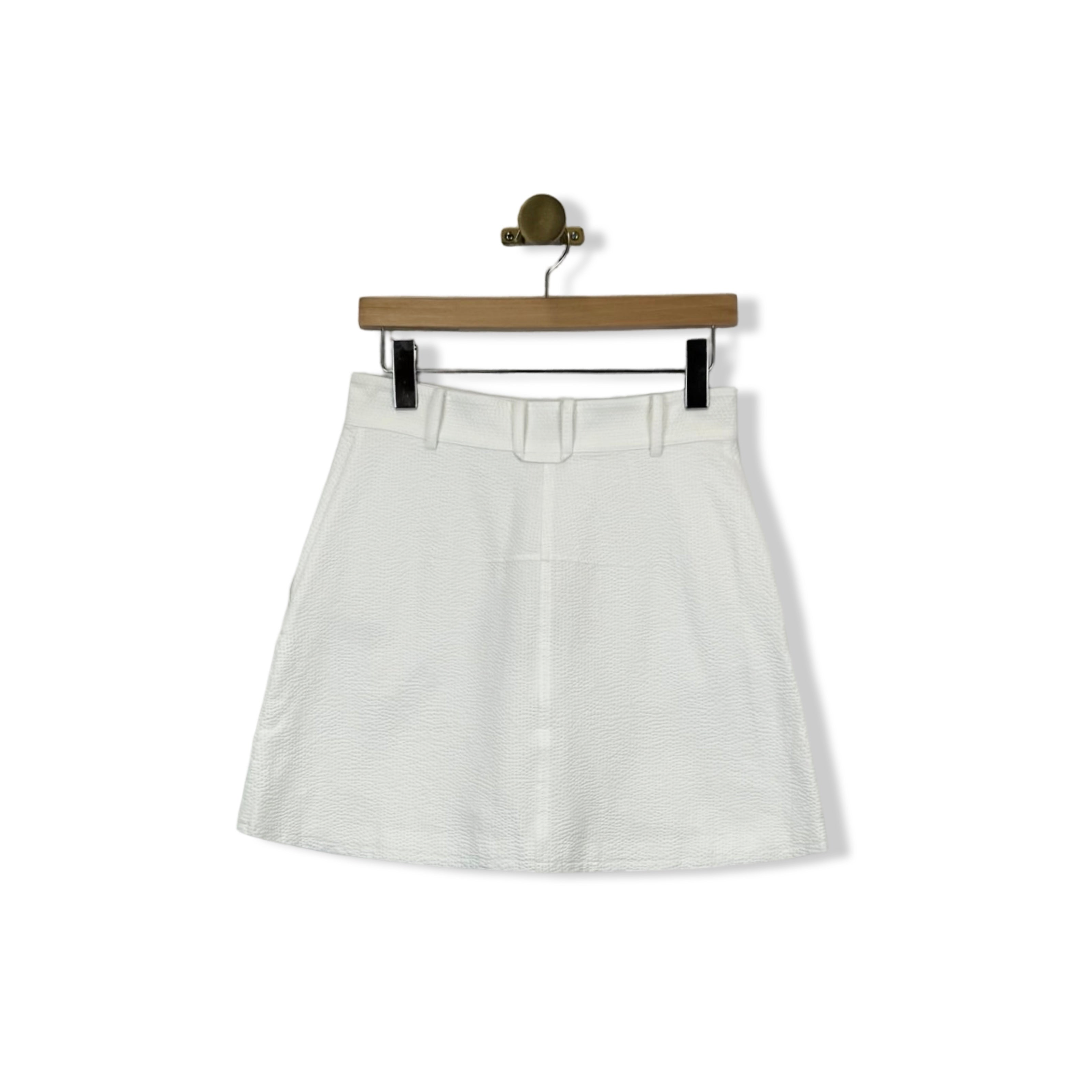 - Crafted from lightly textured stretch-cotton seersucker, this black A-line mini skirt is designed to sit at the waist. It features belt loops, front slanted slip pockets and a concealed fly. Front and back center seams