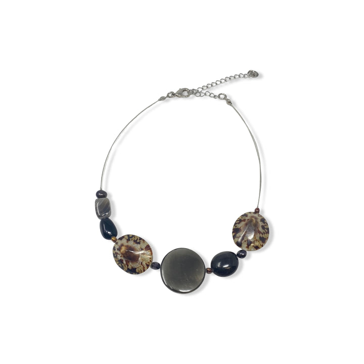 - This necklace features a beaded front design, constructed with durable wire for a unique and eye-catching statement piece.