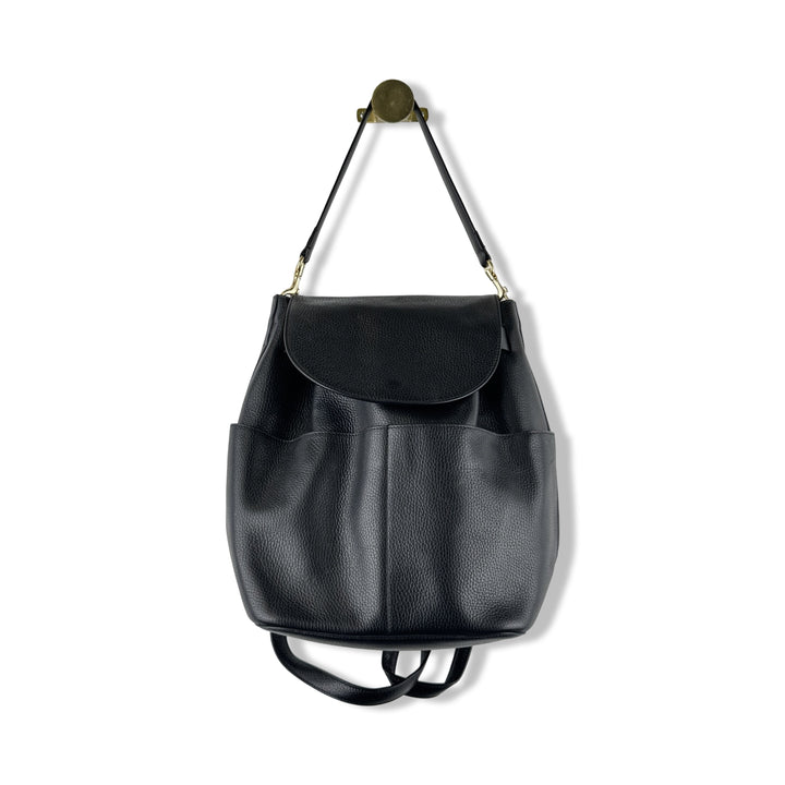 - Textured Leather backpack with snap button closure, front slip pockets and interior zip closure pockets. Adjustable straps.