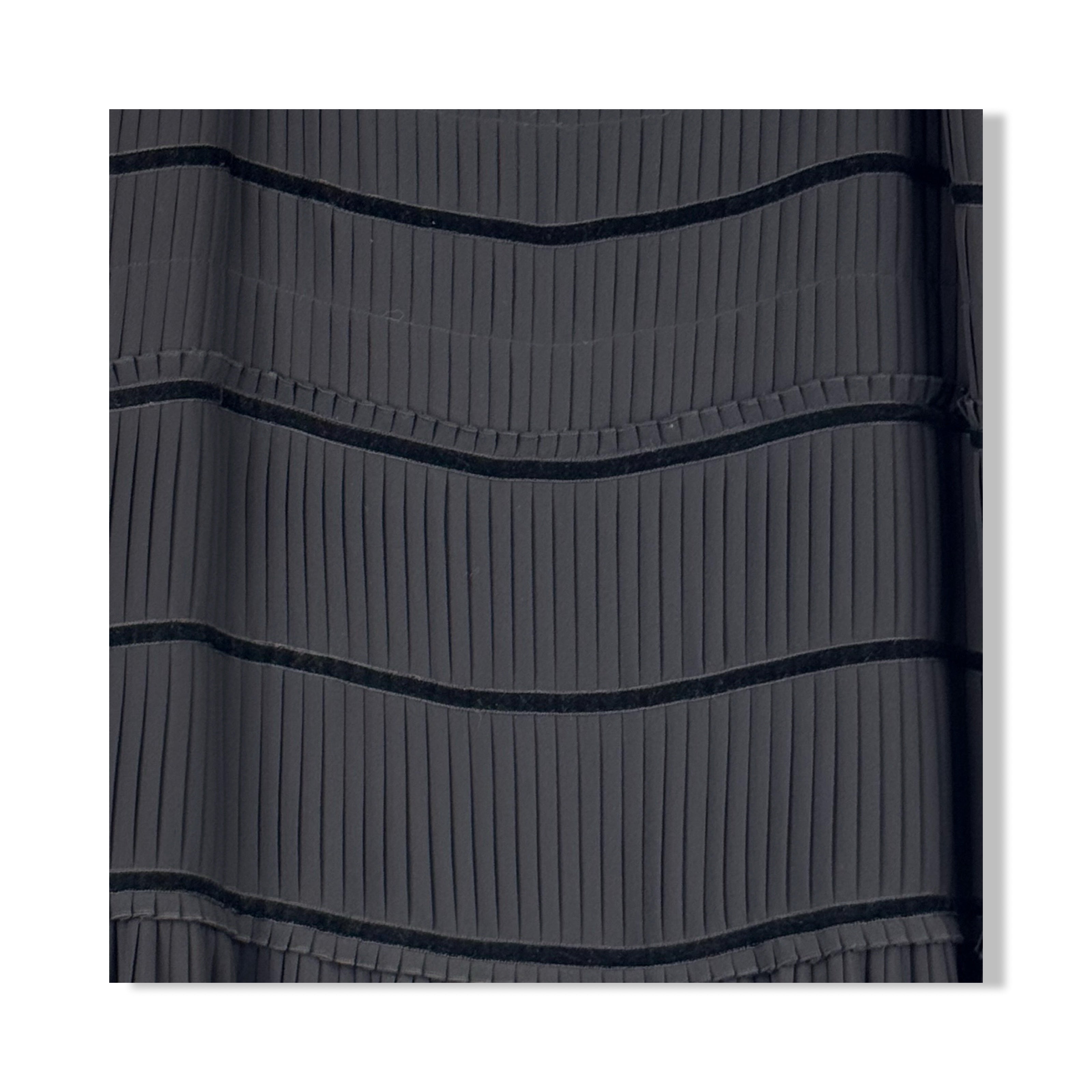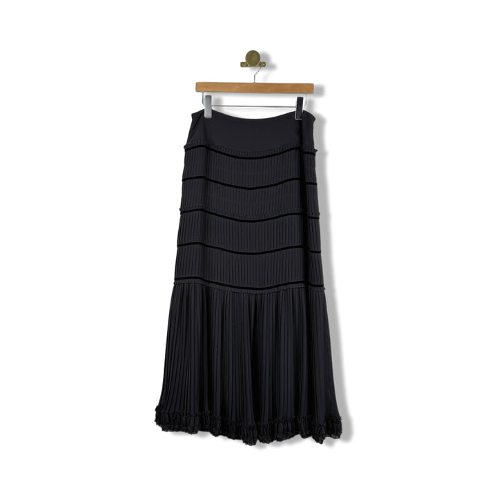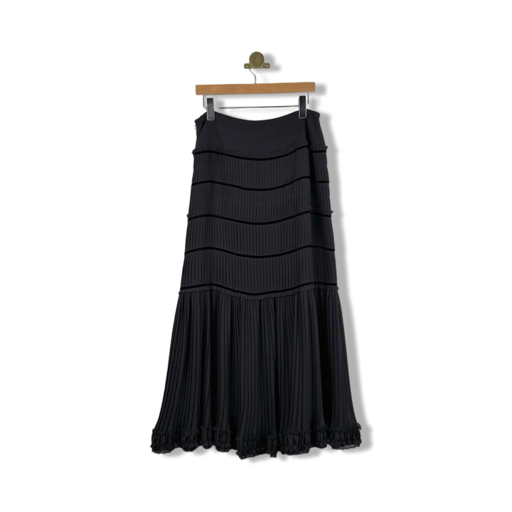 - Maxi pull on skirt with pleated detail throughout and velvet straps. Side zip closure.