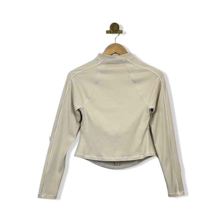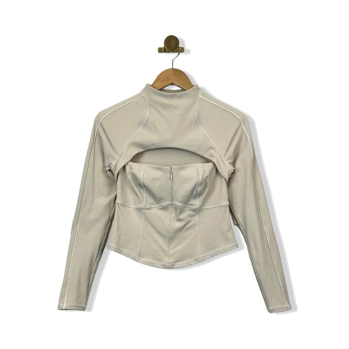 - This crop top features a front cut out and zip closure, as well as seam stitch detailing on the front. Missing size label, looks like a size small. Please check measurements for reference. Some signs of wear.