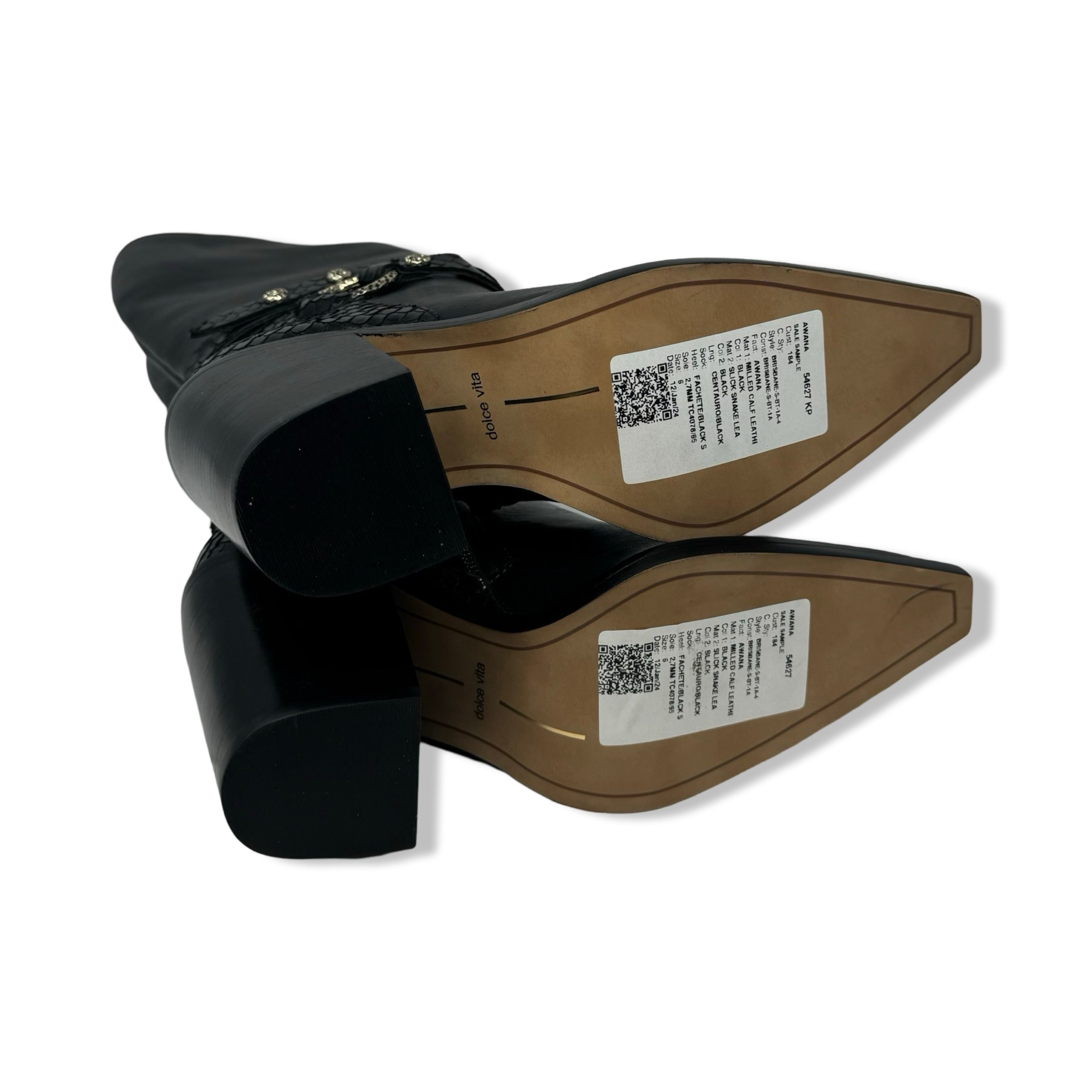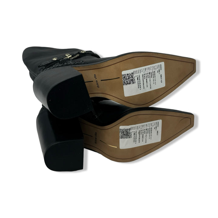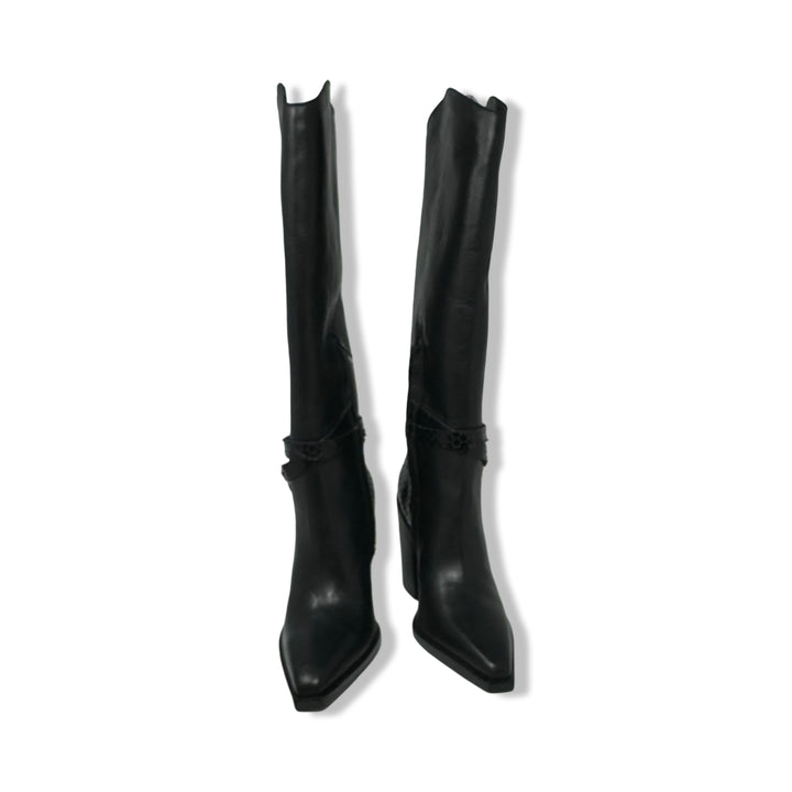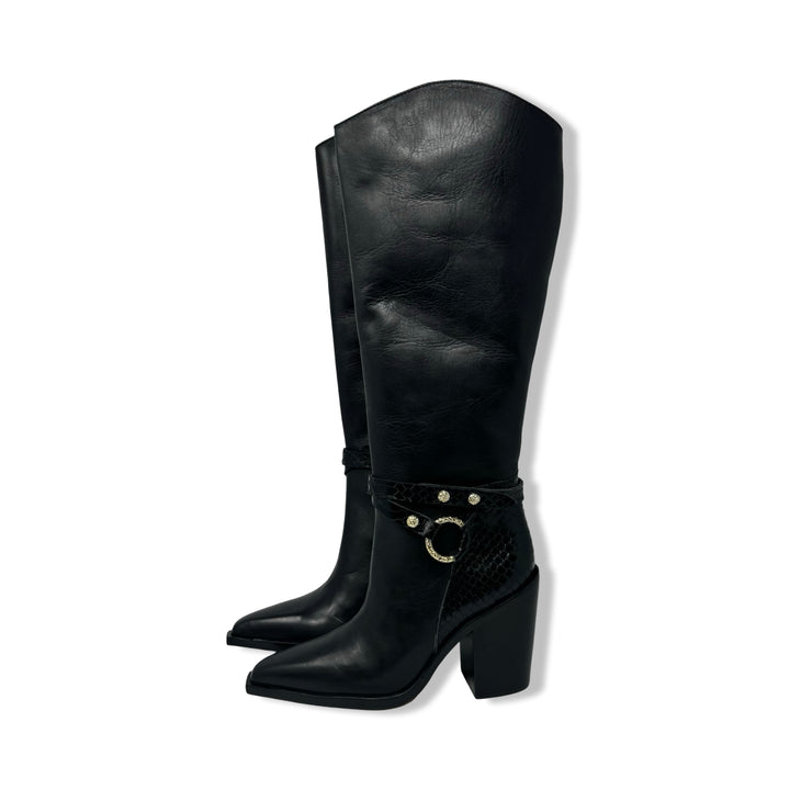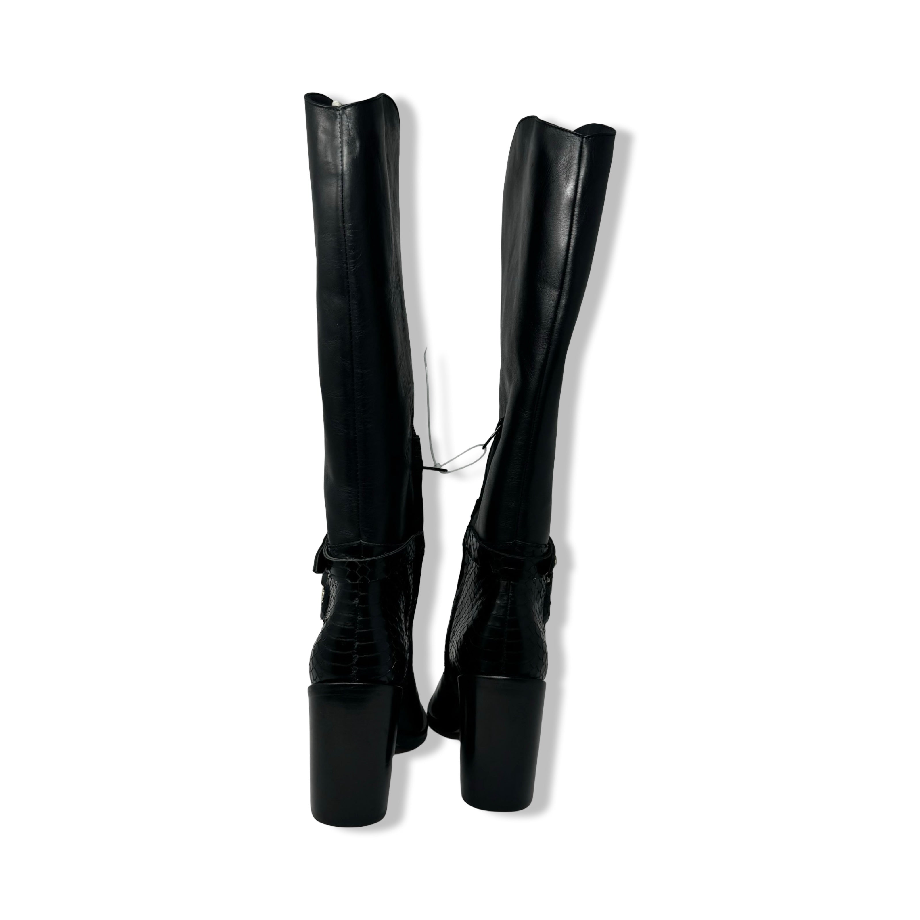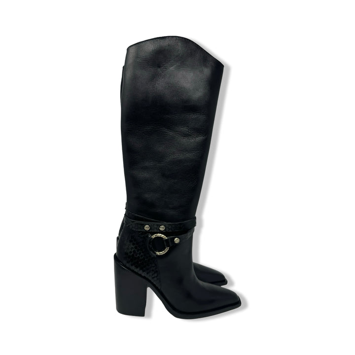 - These cowboy-inspired knee high boots are crafted from a mix of calf and snake leather and feature silver hardware details and a convenient side zip.