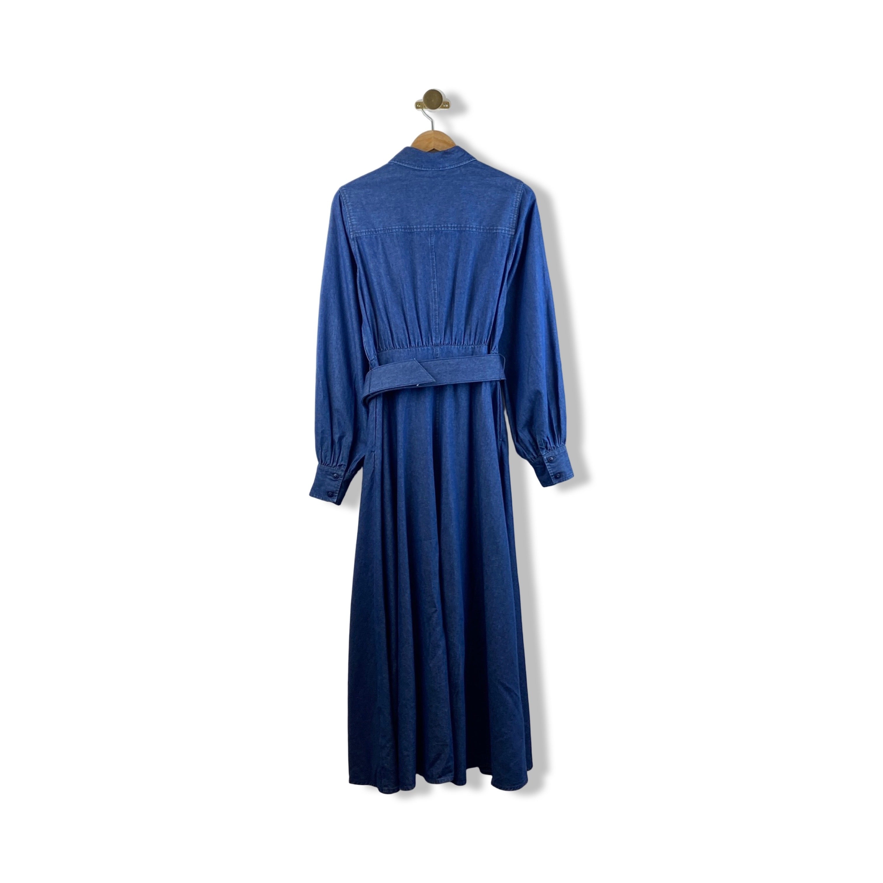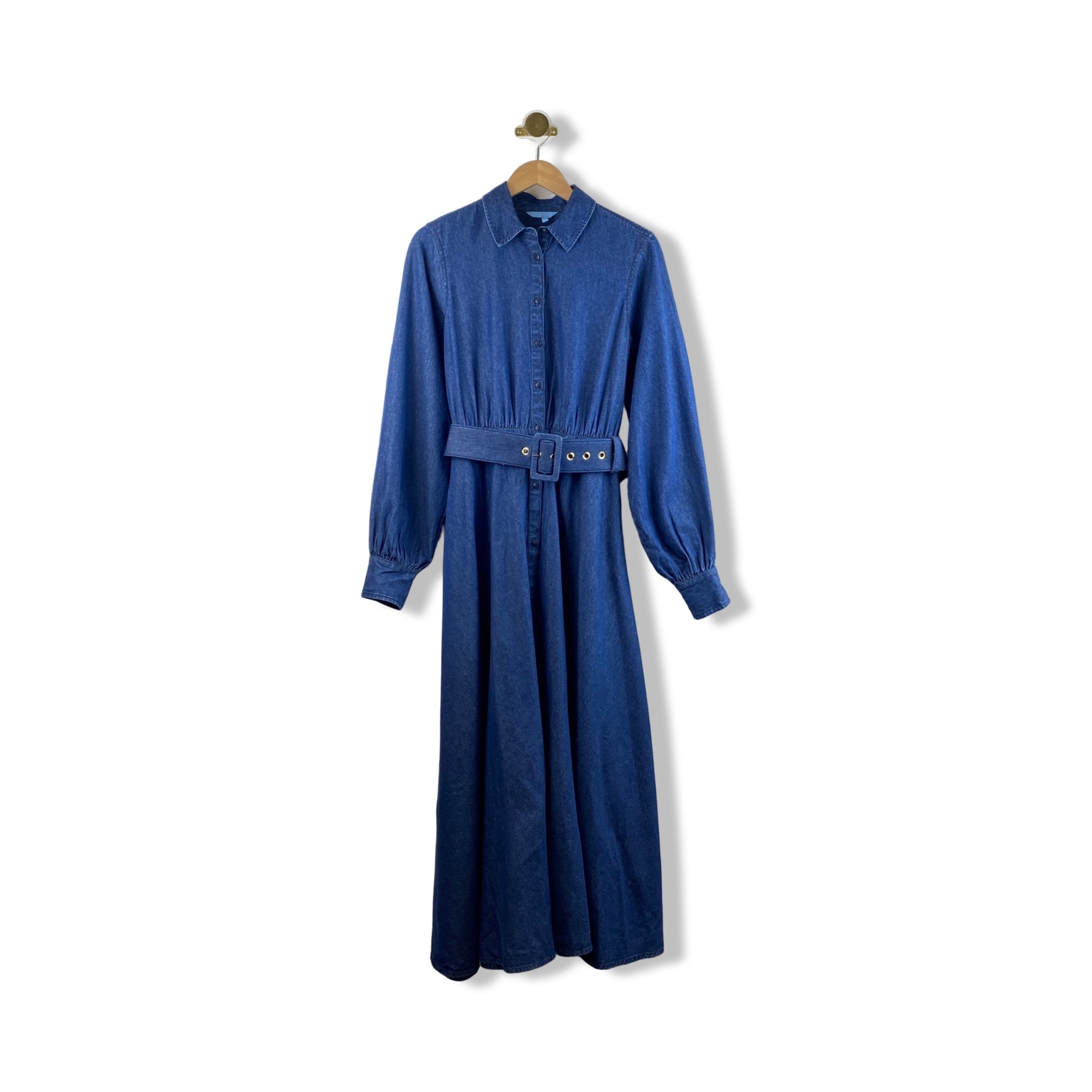 - Long sleeve belted denim shirt dress. Size label missing; Looks like size 6. Please check measurements.