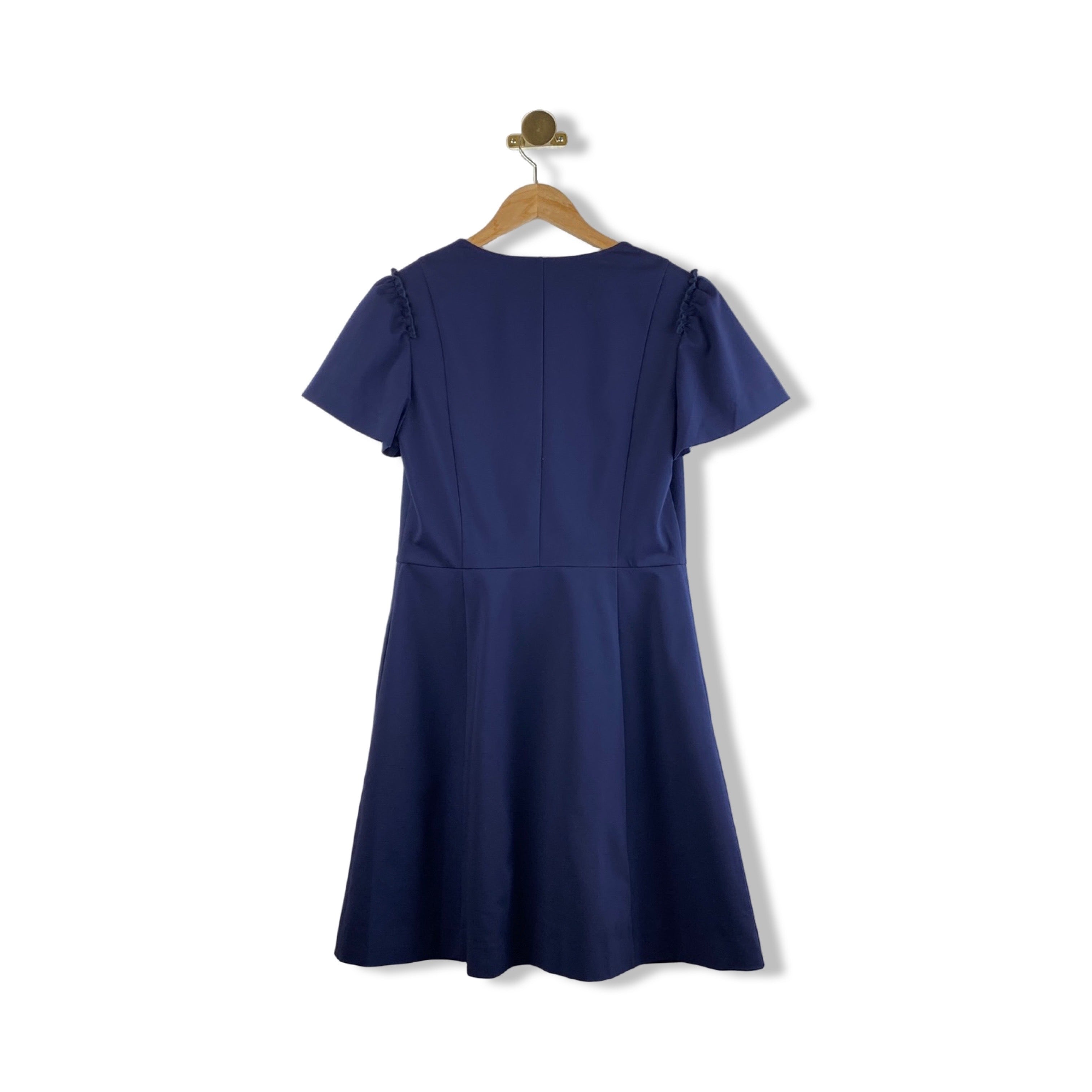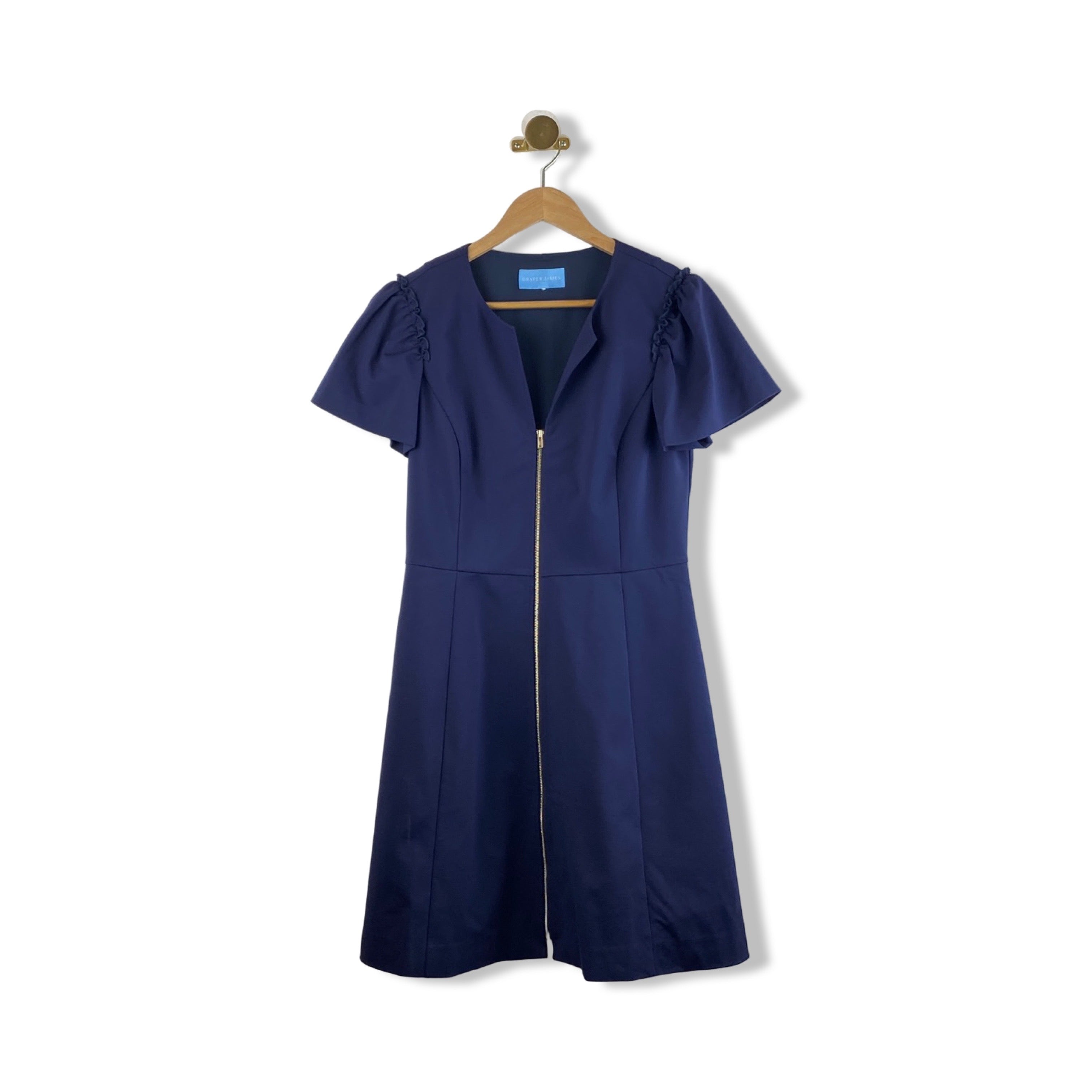 - Short sleeve V-neck midi dress with zipper front. Size label missing; Looks like size 6. Please check measurements.
