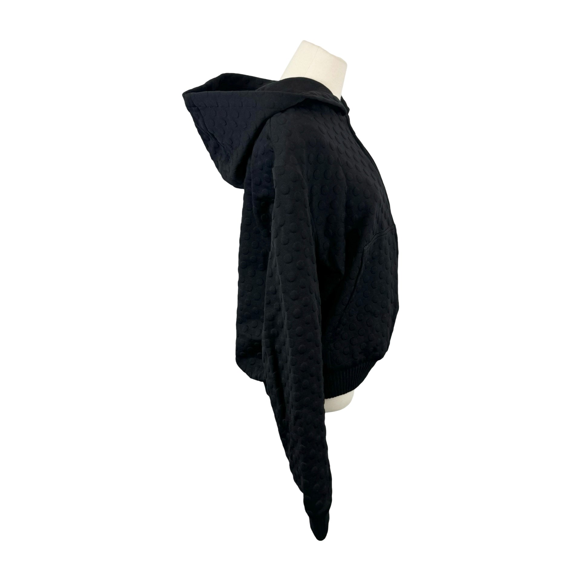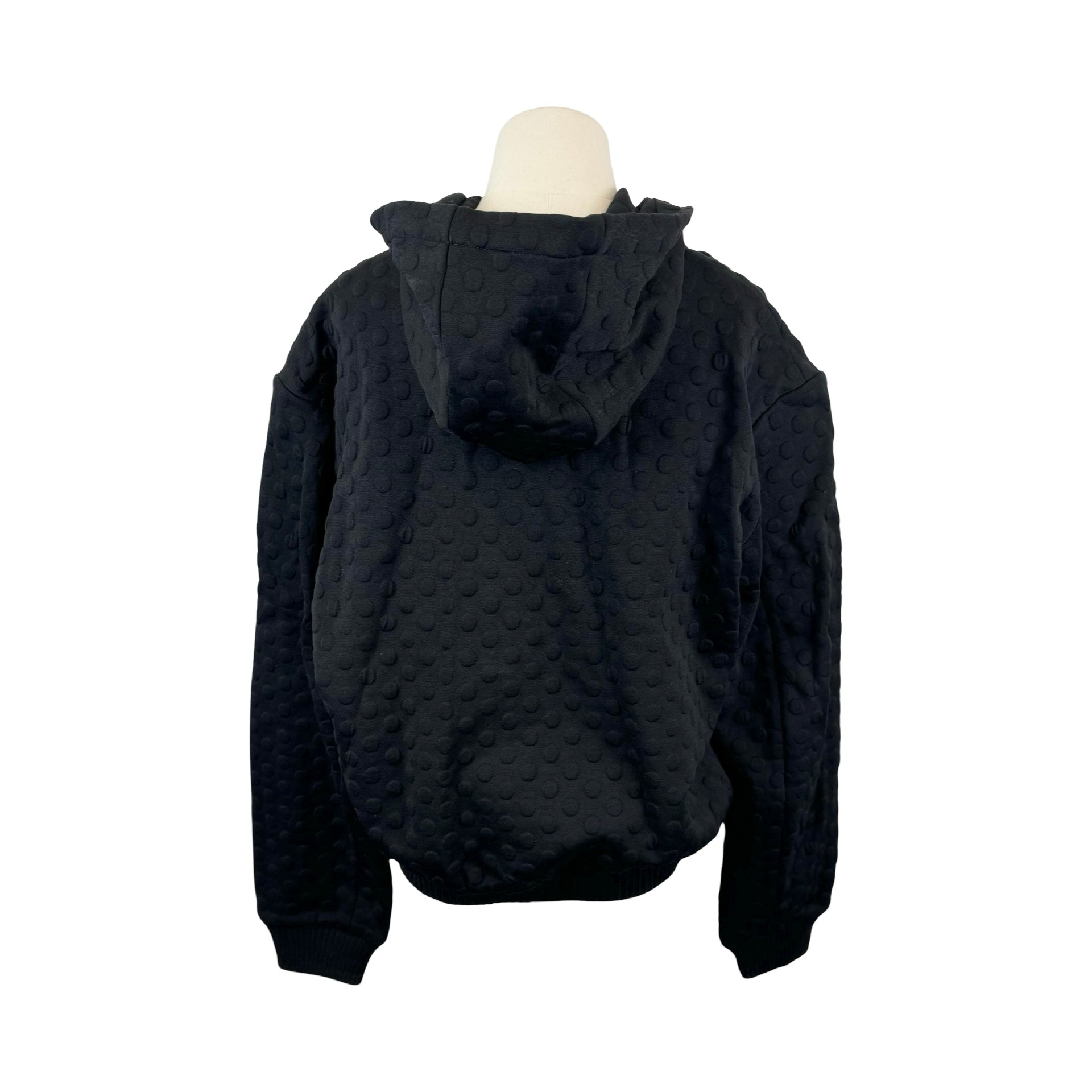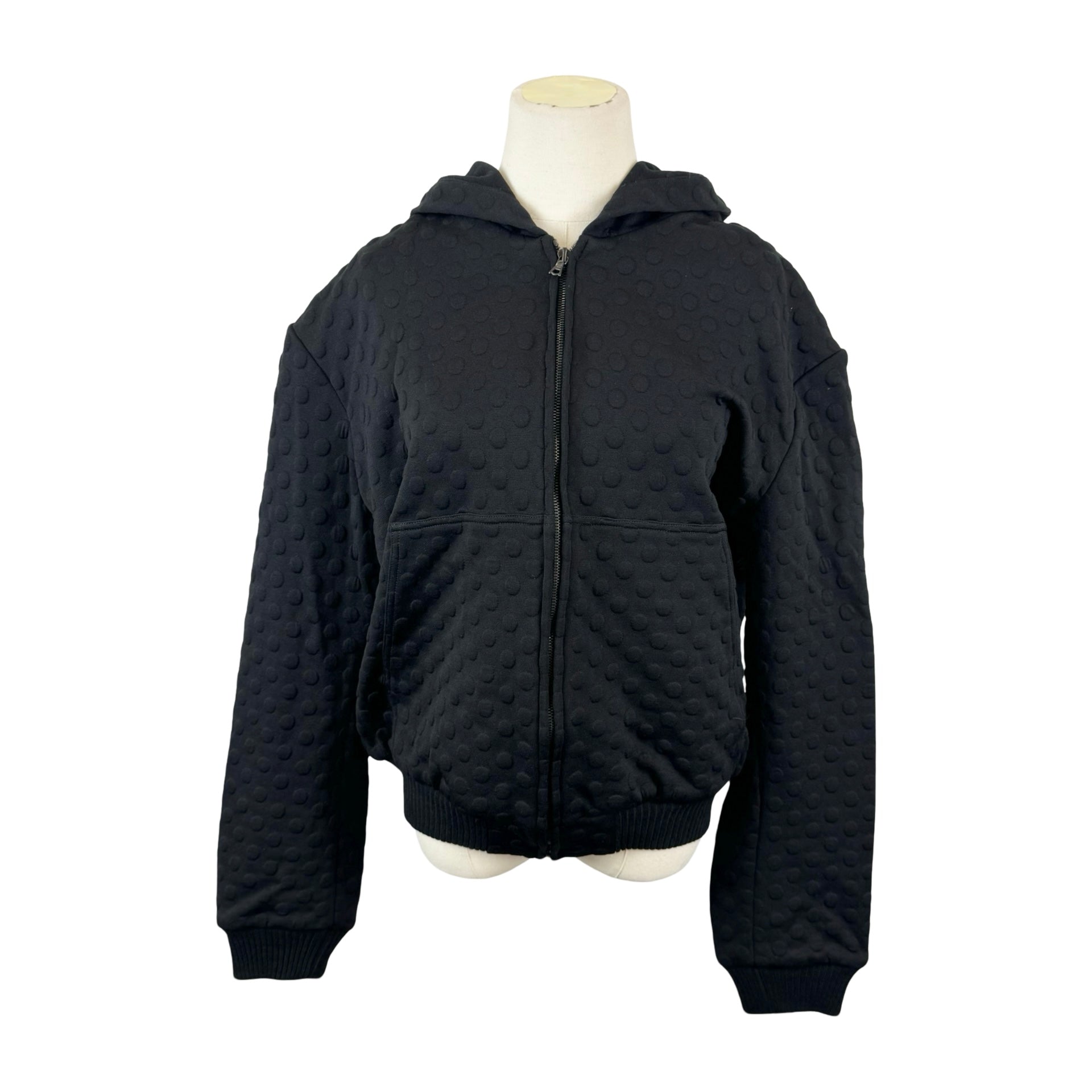 - Zip up jacket with dot pattern throughout and front pockets. Rib knit trim on cuffs and hem. Missing size label, looks like a size Medium.