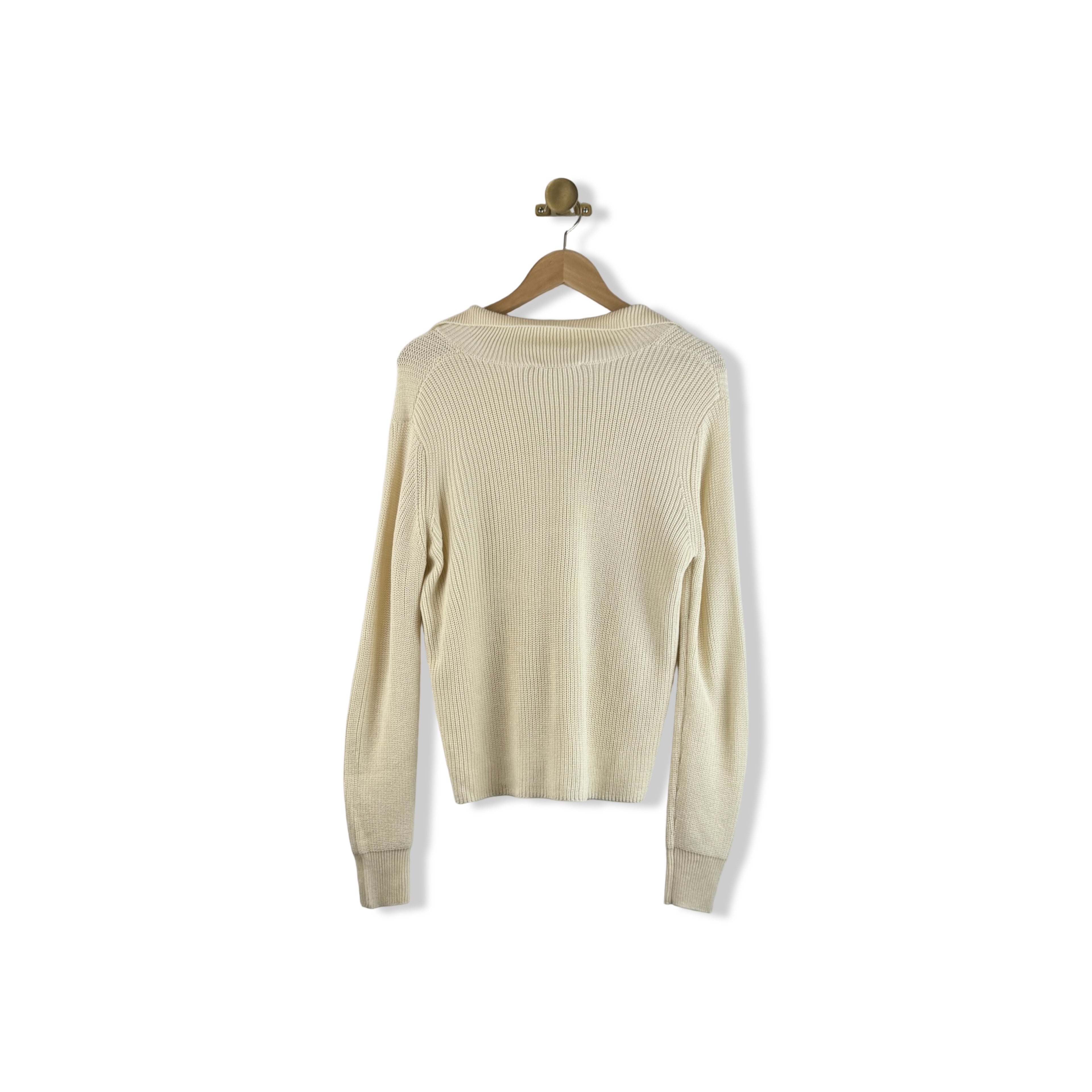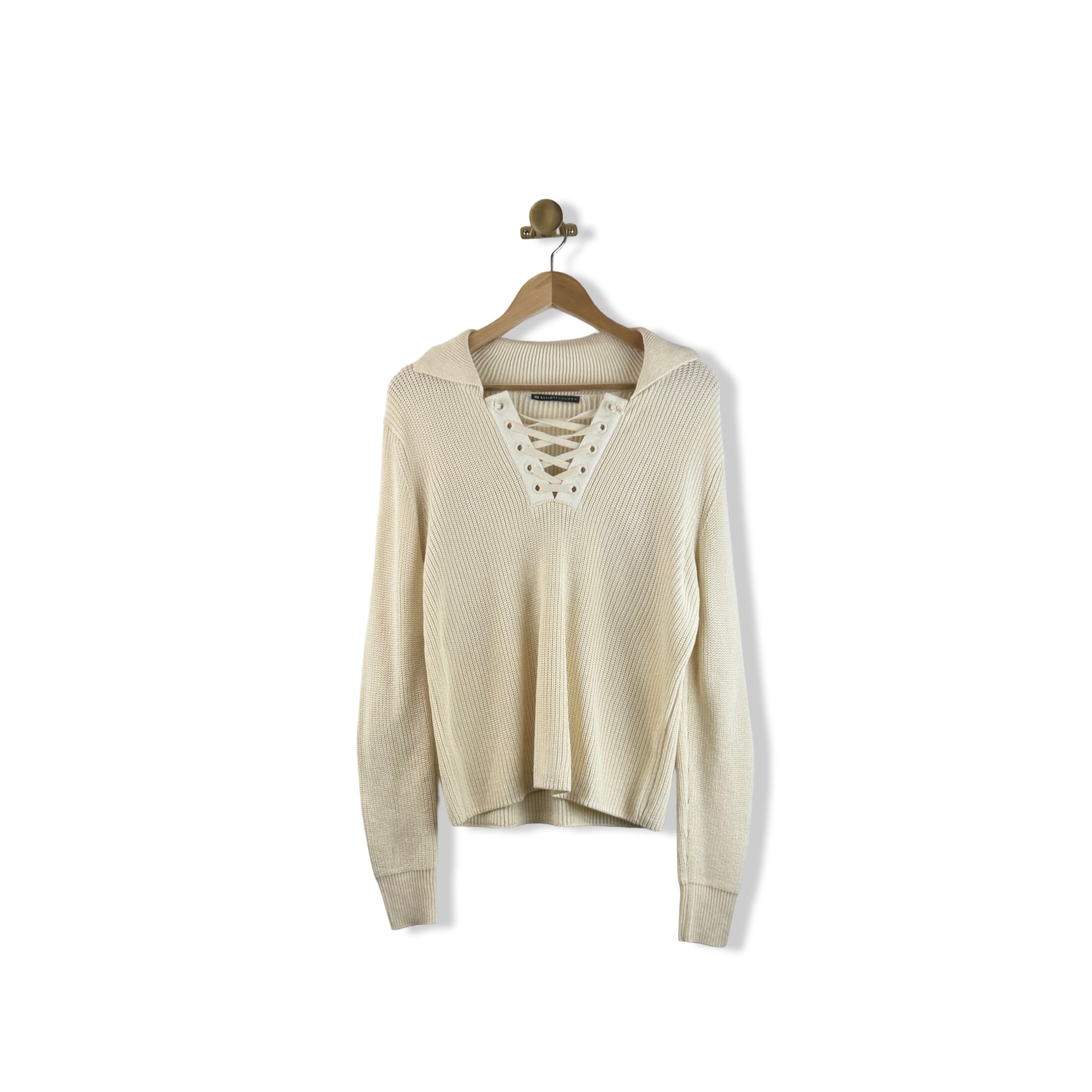 - Sweater with lace up detail on chest. Size label missing, looks like a Small