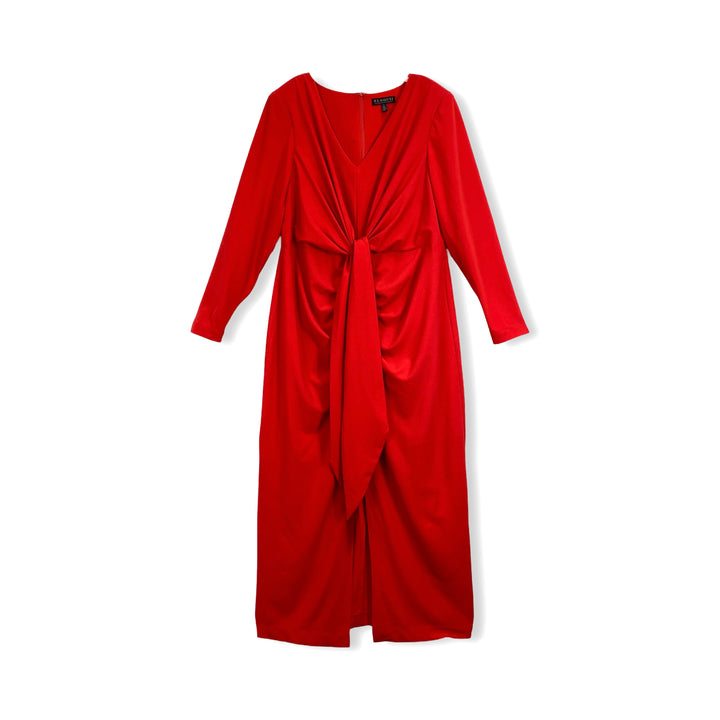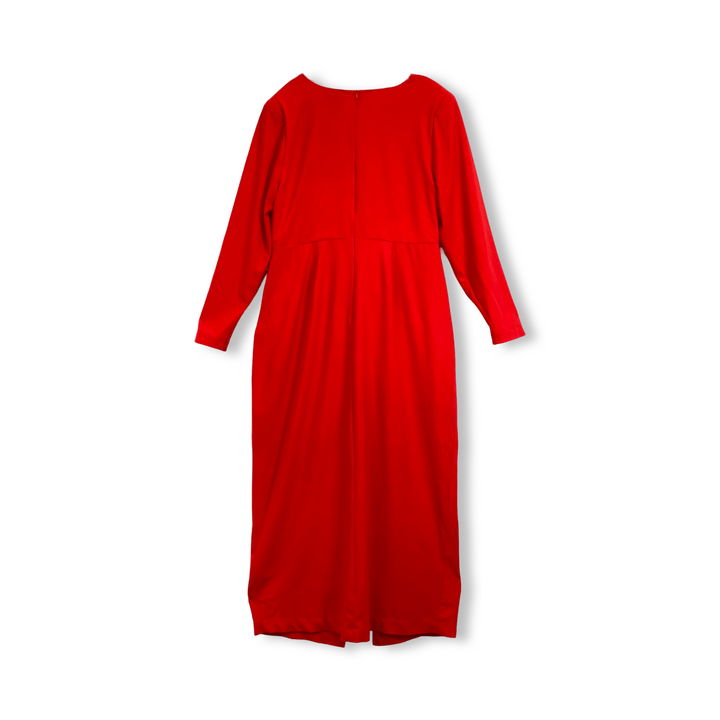 - Long sleeve dress with tie detail at front, shoulder pads and zip closure on back.