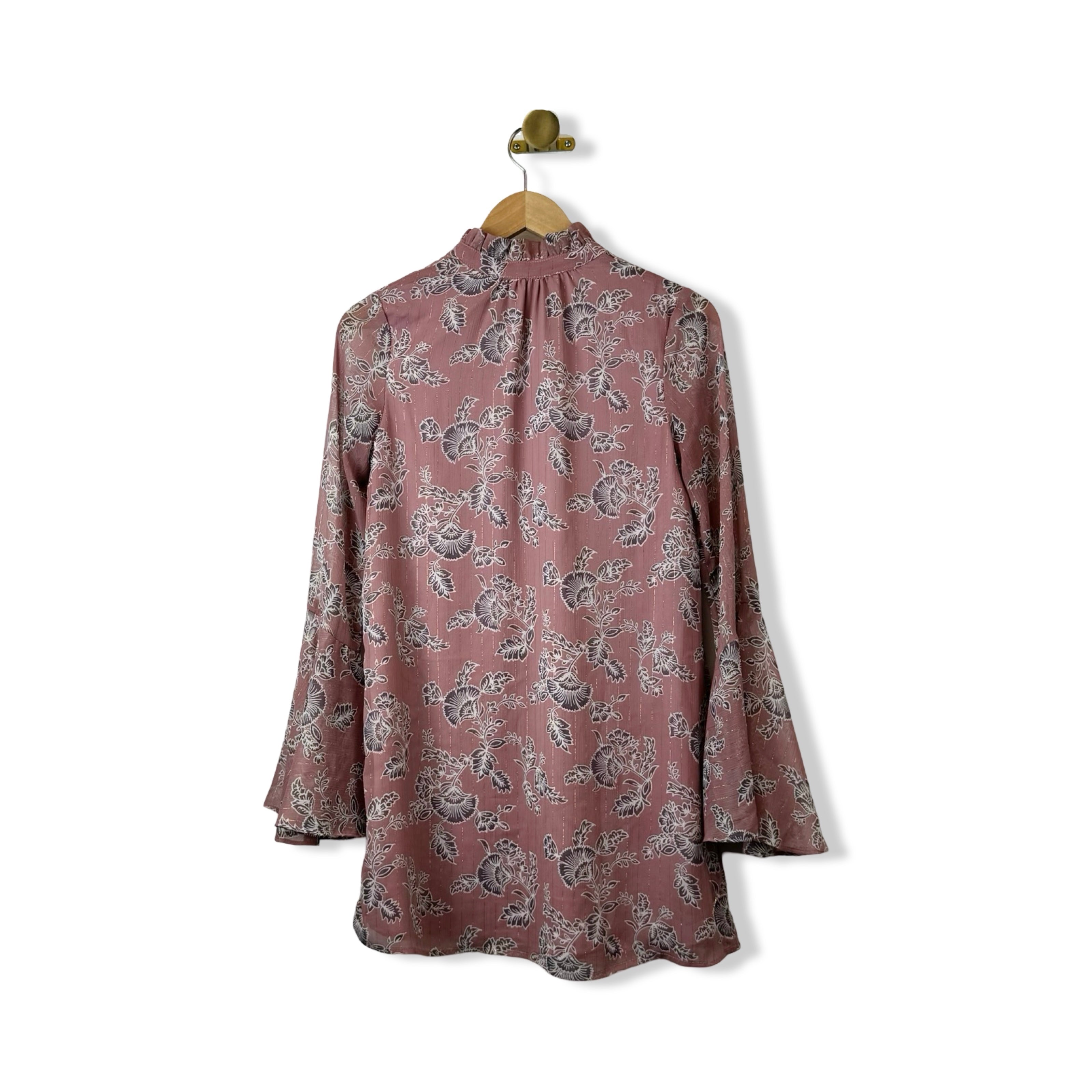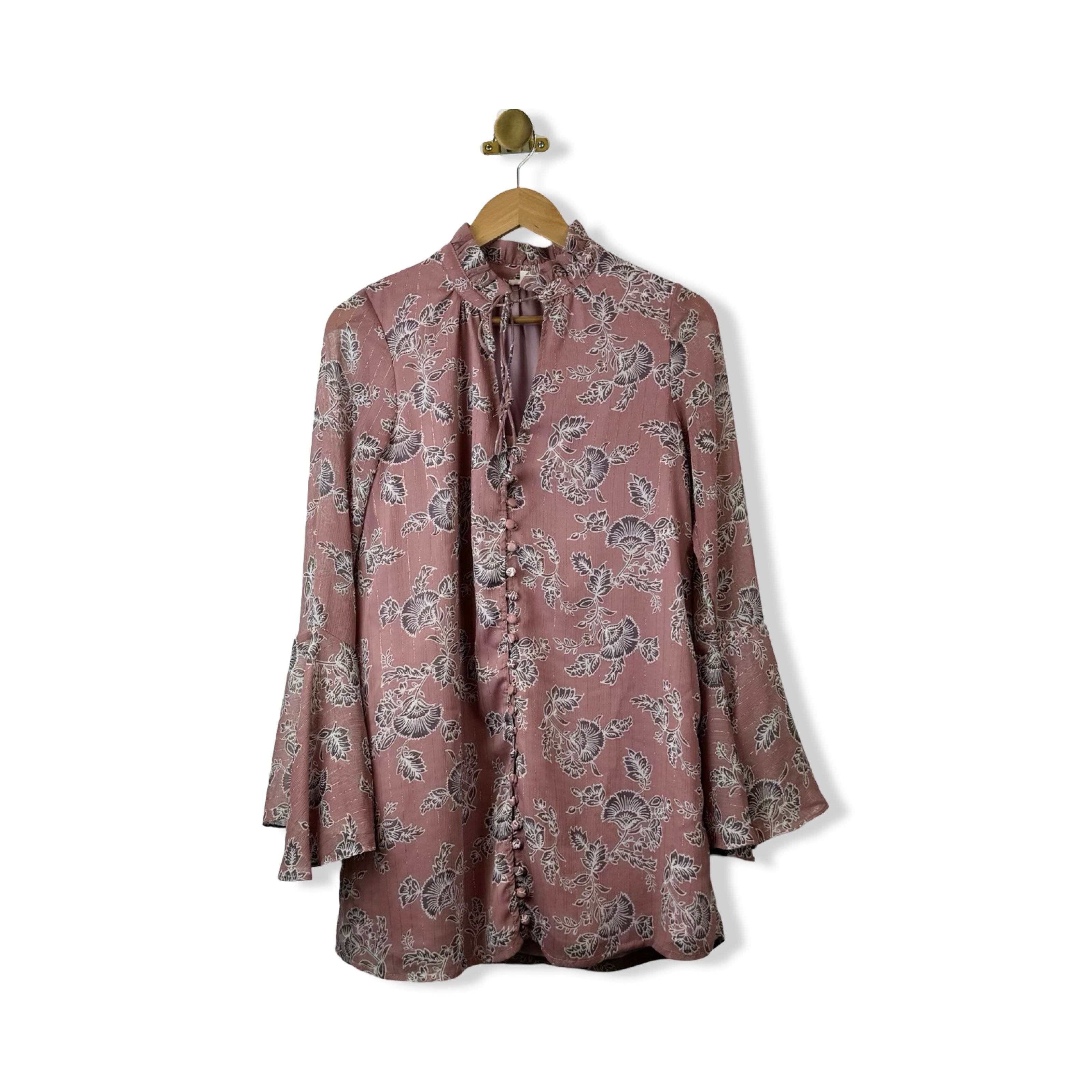 - Floral top with button up closure, drawstring cords and metallic detail throughout