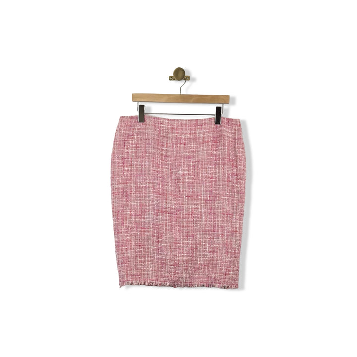 - Experience the effortless elegance of our knit tweed midi skirt, designed with a convenient back zip closure for a comfortable and stylish fit. Labeled size DE 42; approx. size US 12.