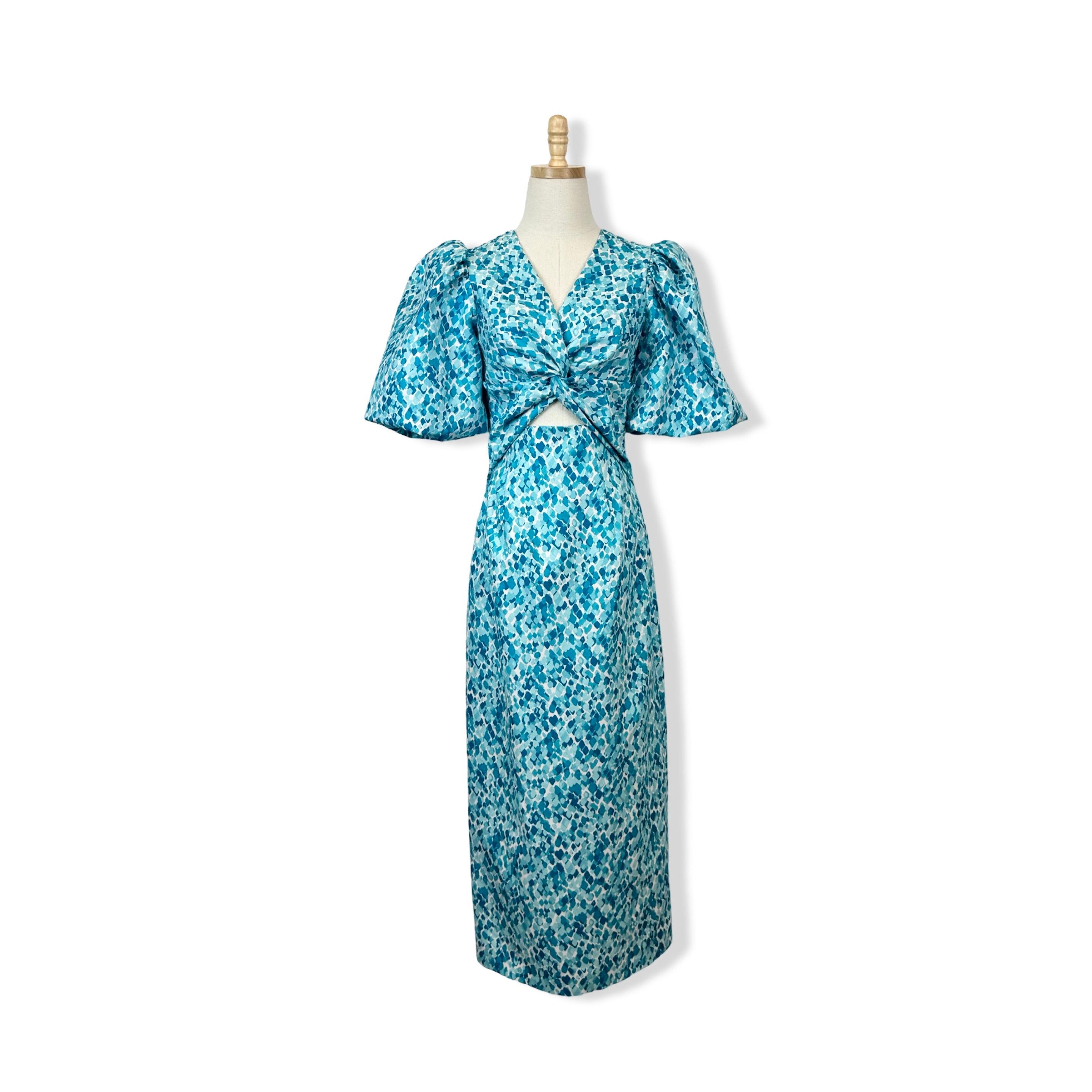 - Patterned puff sleeve maxi dress with cut out on midriff. Back zip closure.