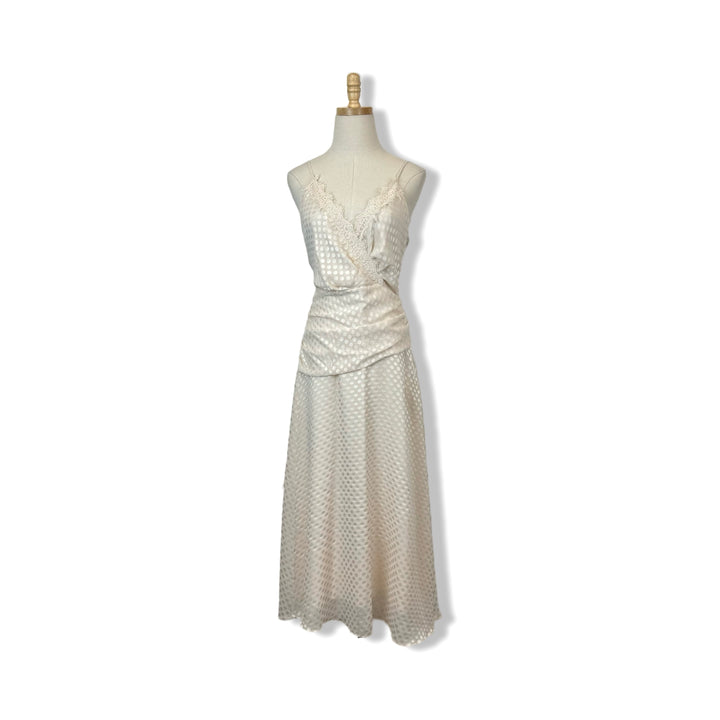 - Unleash your inner elegance in the Claire Dress, featuring a faux wrap design with delicate lace accents and a convenient side zip closure.