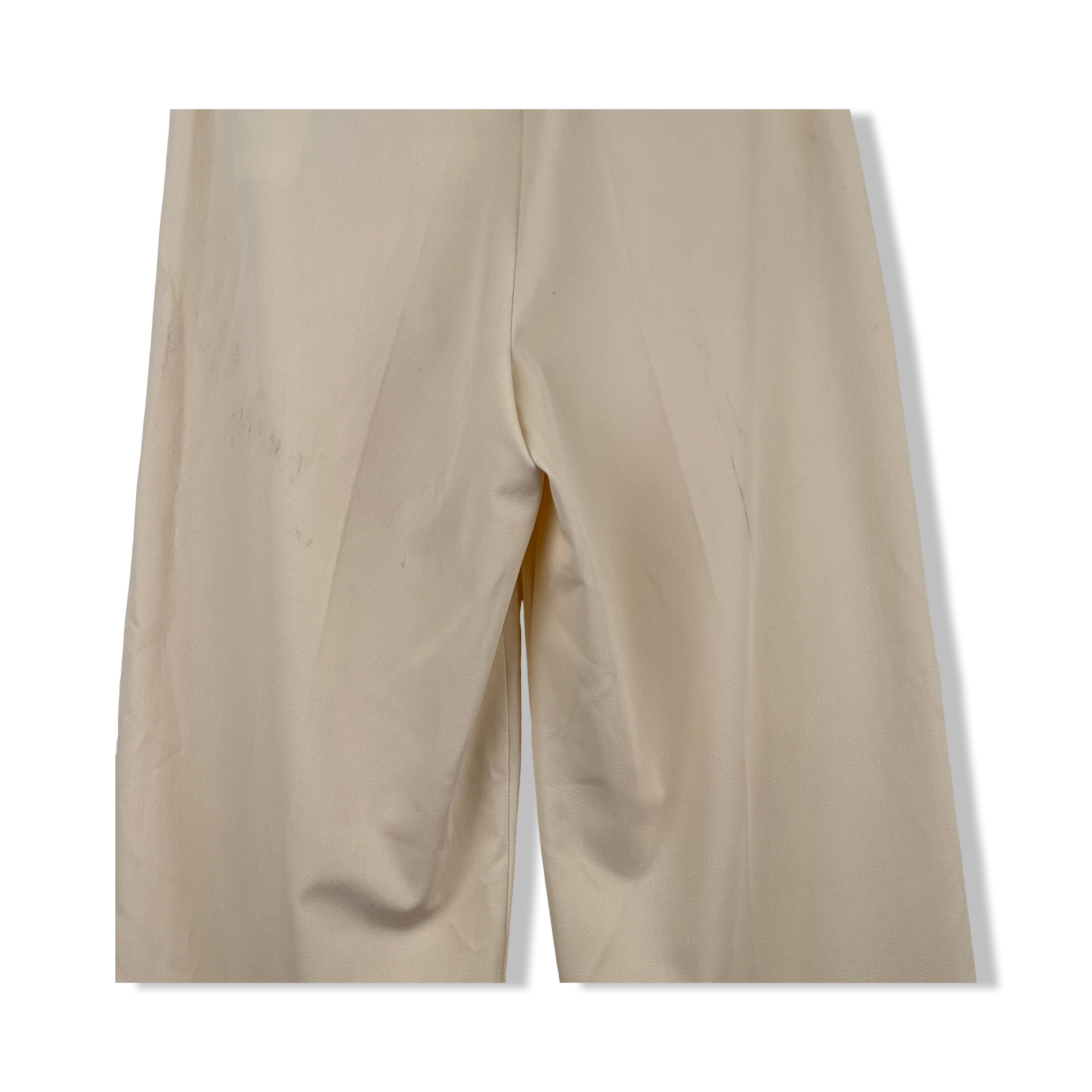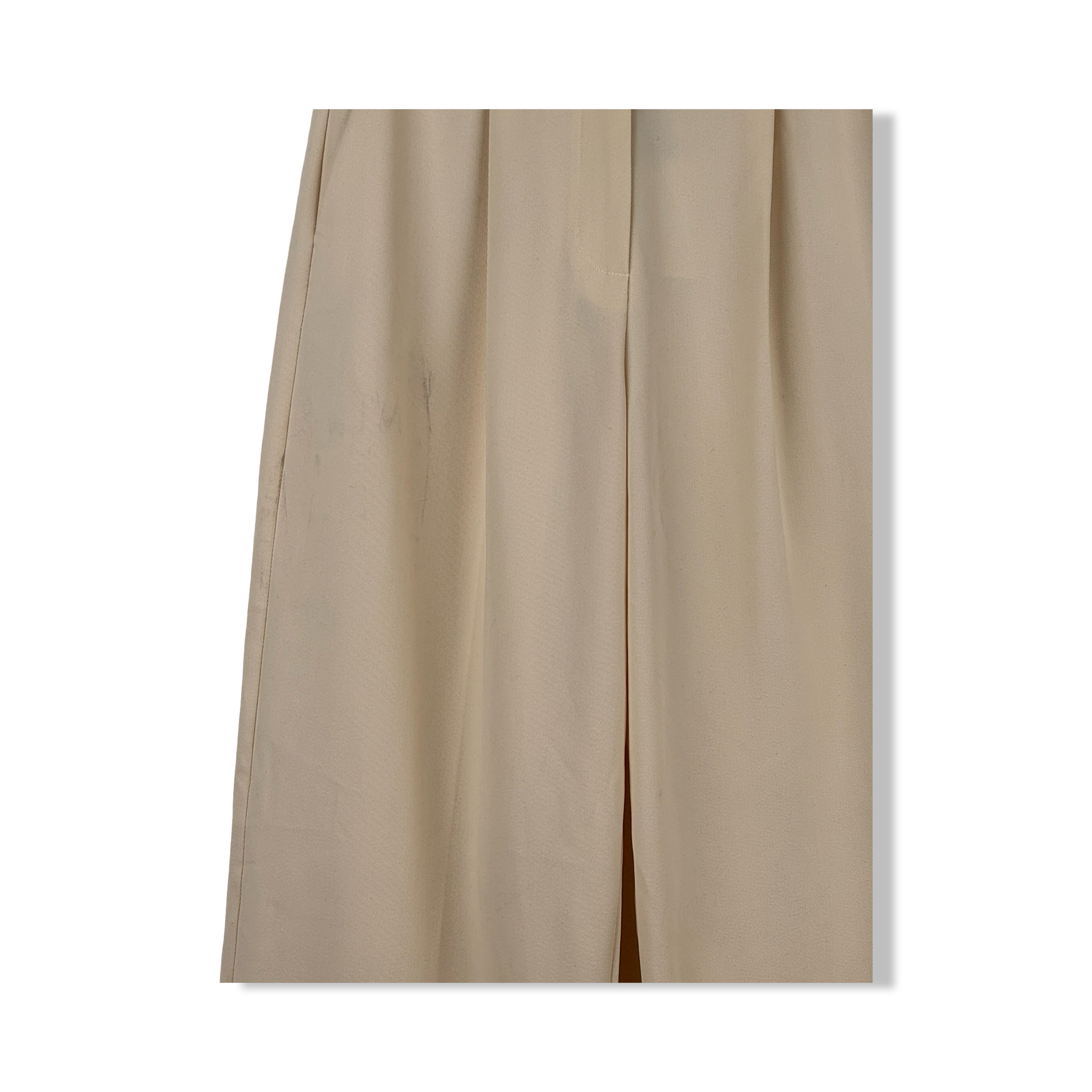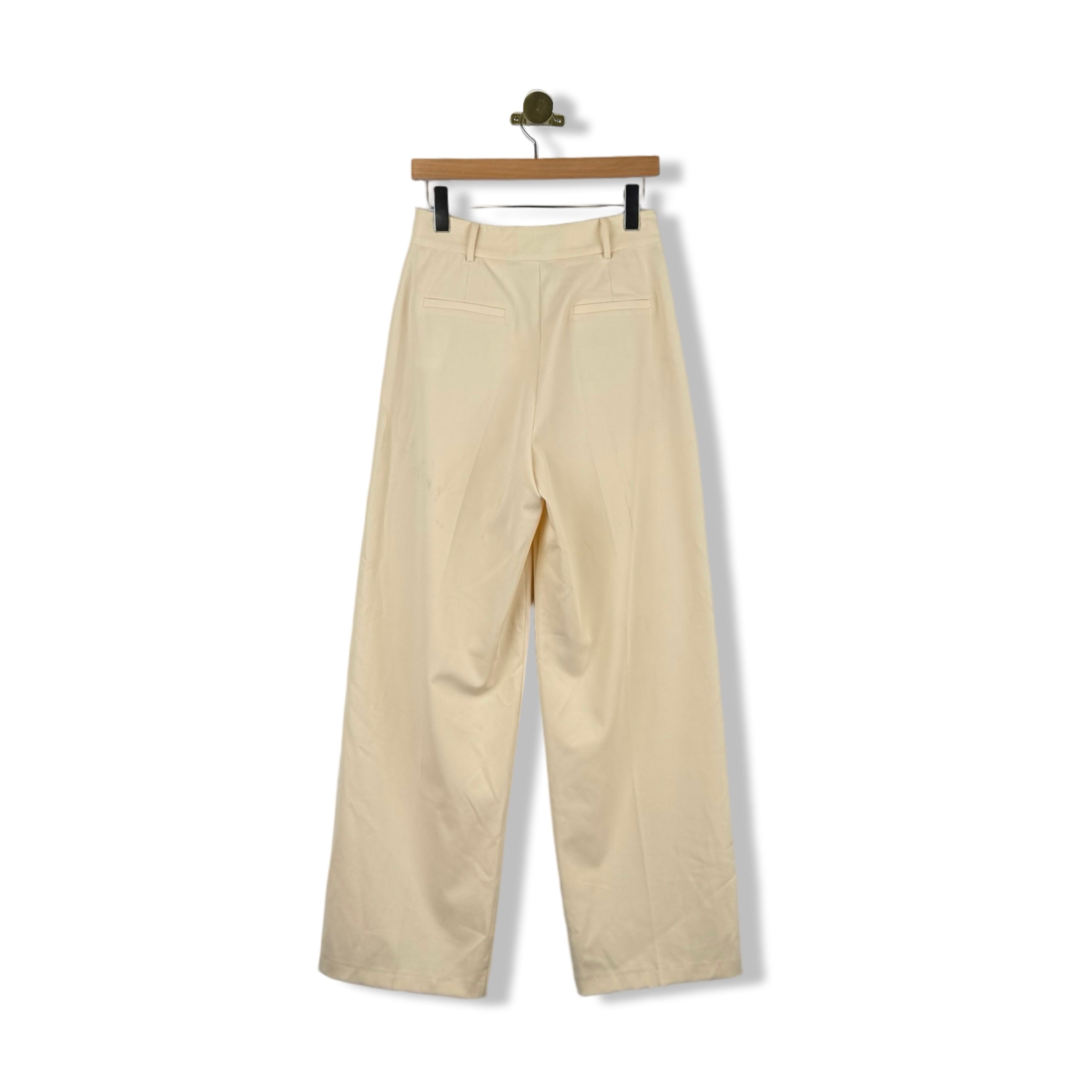 - Straight leg pants with pleated front, front/back pockets and zip fly with hook-and-bar closure. Signs of wear (pictured)