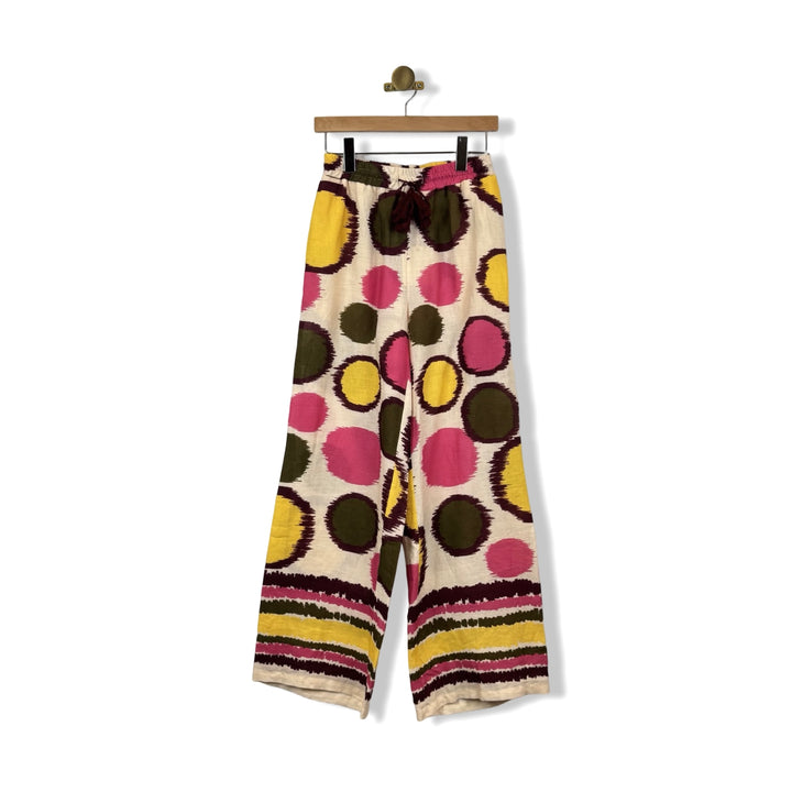 - Lightweight pull on pants with abstract print throughout, side seam pockets, elastic waistband and drawstring tassels.