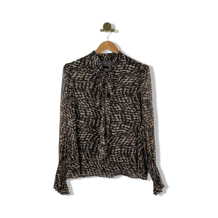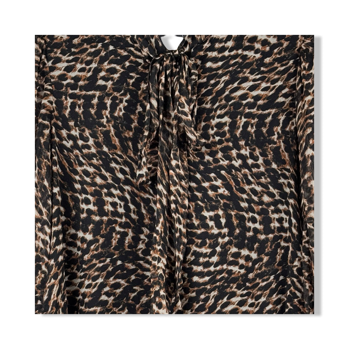 - Animal print blouse with smocked cuffs, self tie at neckline and curved hem.