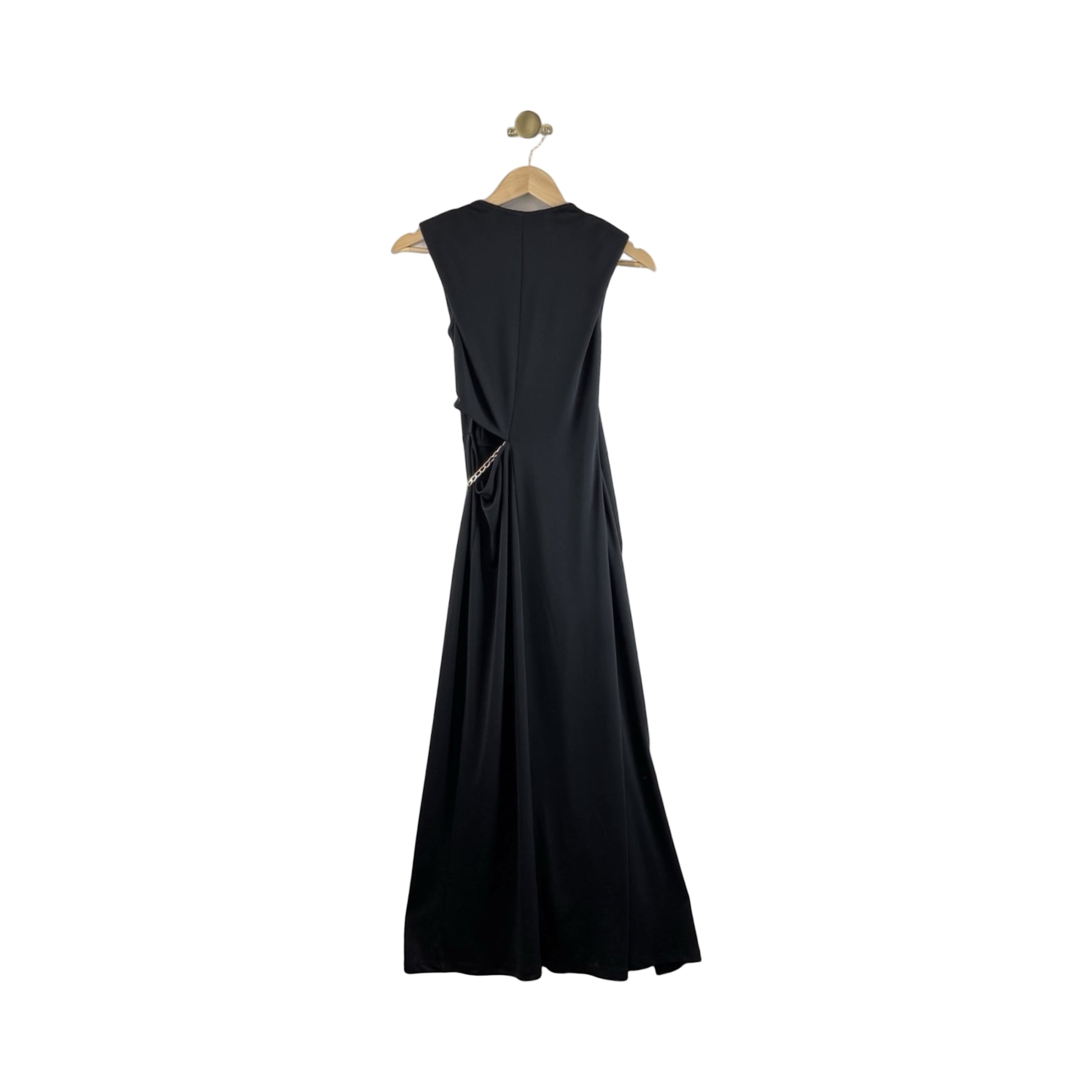- Plunge neck maxi dress with hardware chain detail and side zip closure
