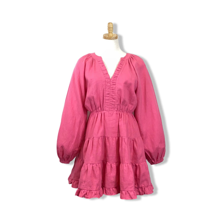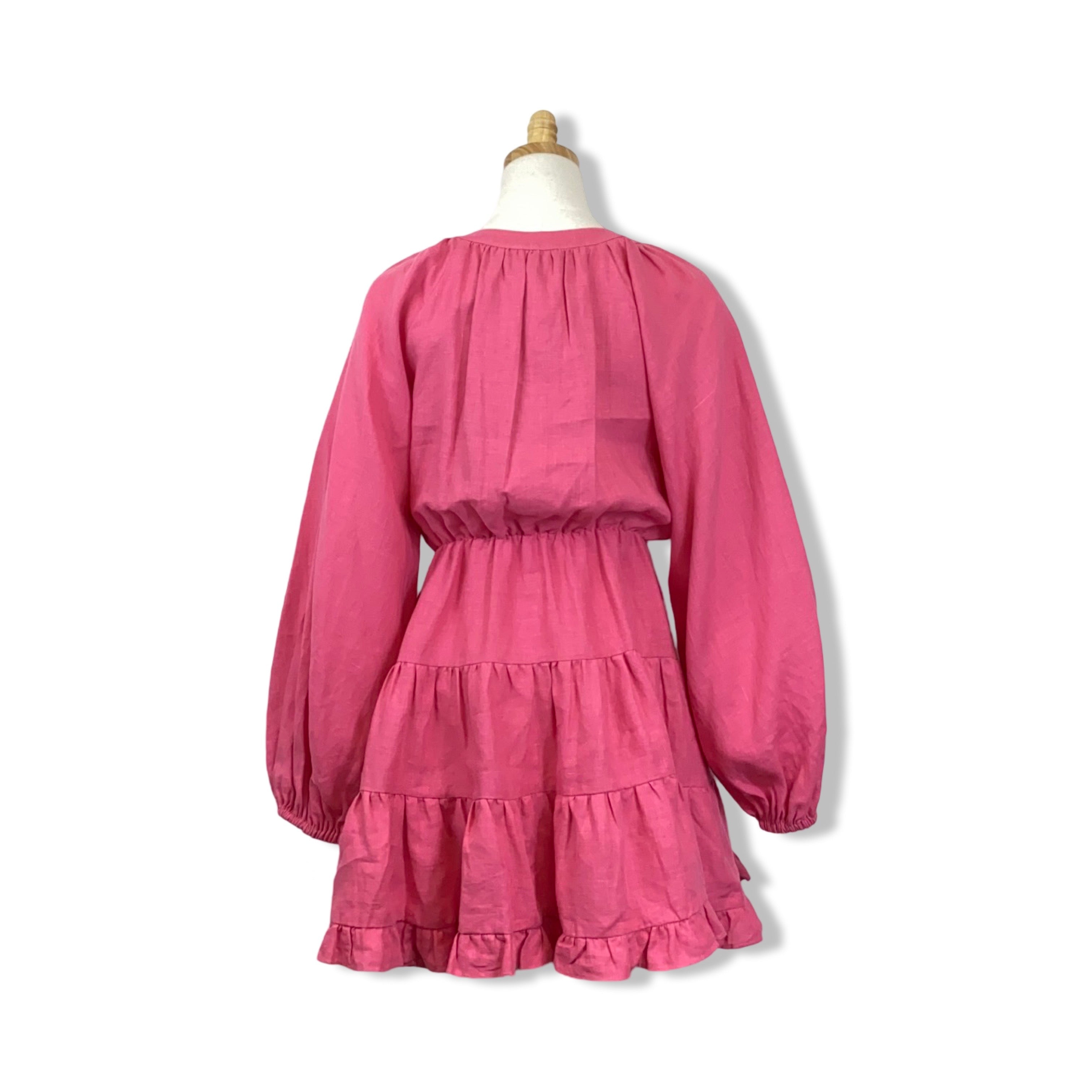 - V-neck mini dress with ruffle hem and balloon sleeves.