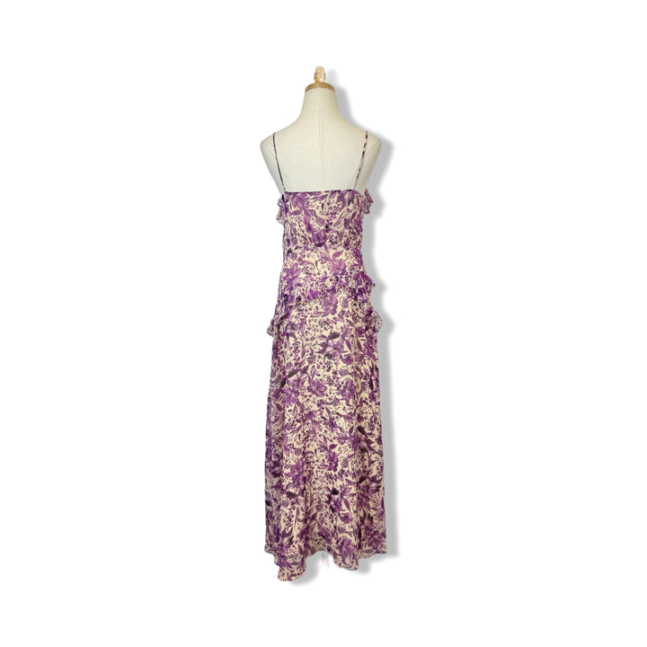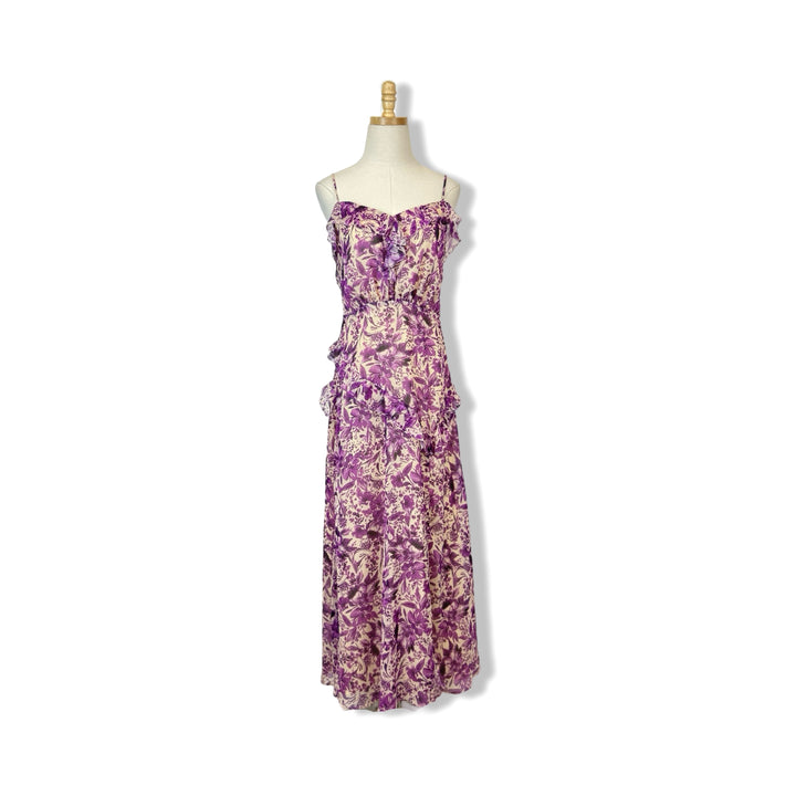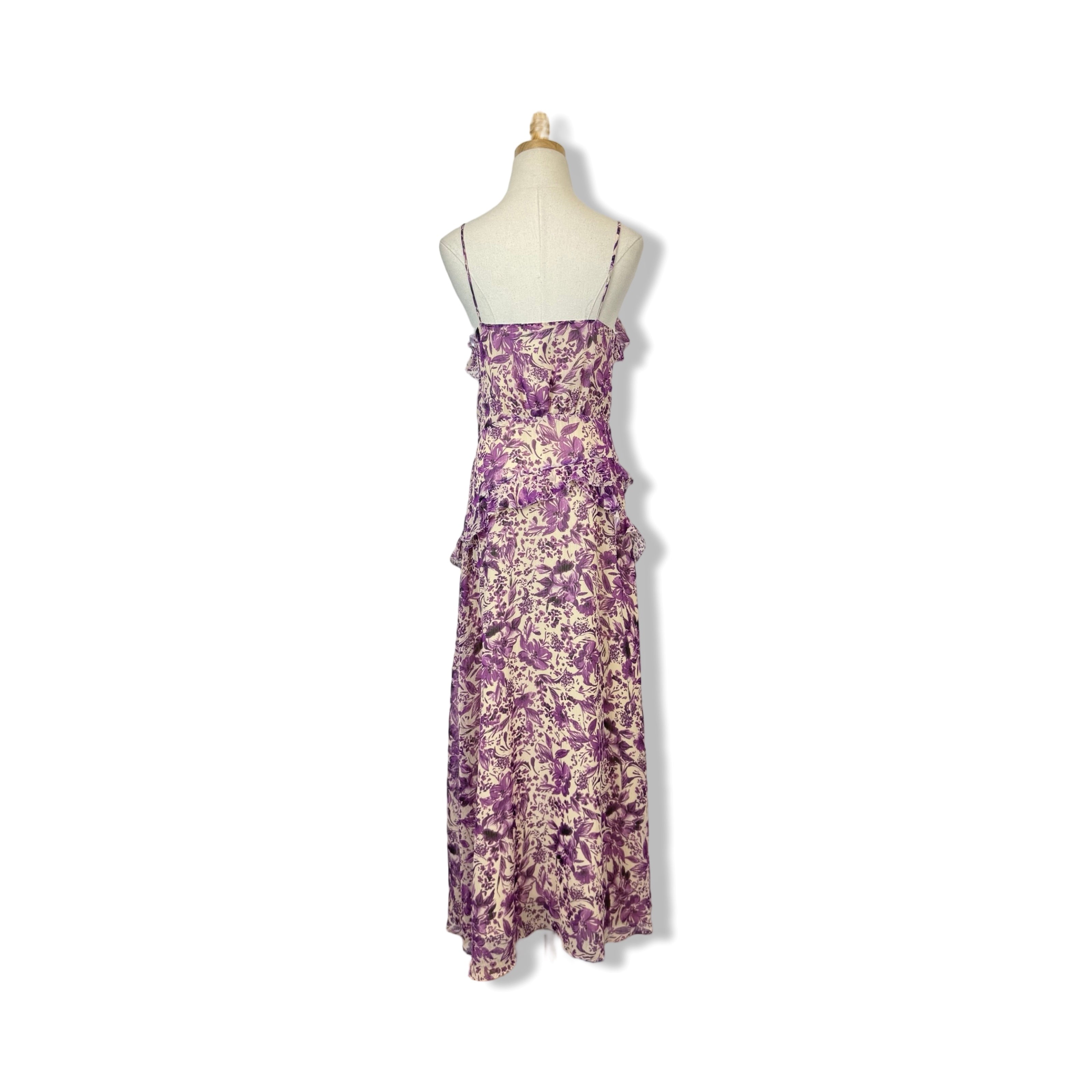 - This stunning maxi dress features delicate ruffles, a sultry slit on the skirt, and a convenient side zip closure. Don't miss out on this must-have addition to your wardrobe!