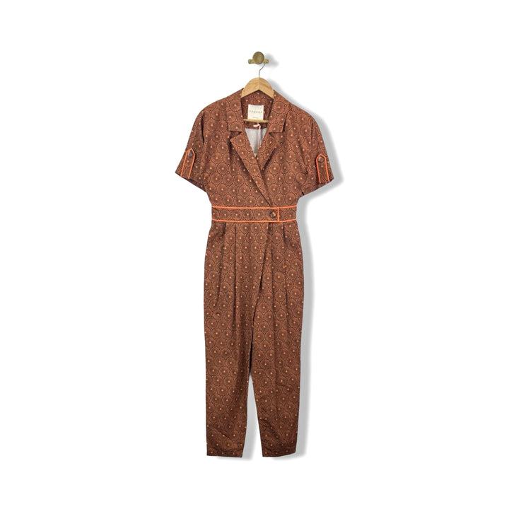 - Short sleeve jumpsuit with geometric print throughout, front pockets, pleated detail on waist, and a zip fly with button closure.
