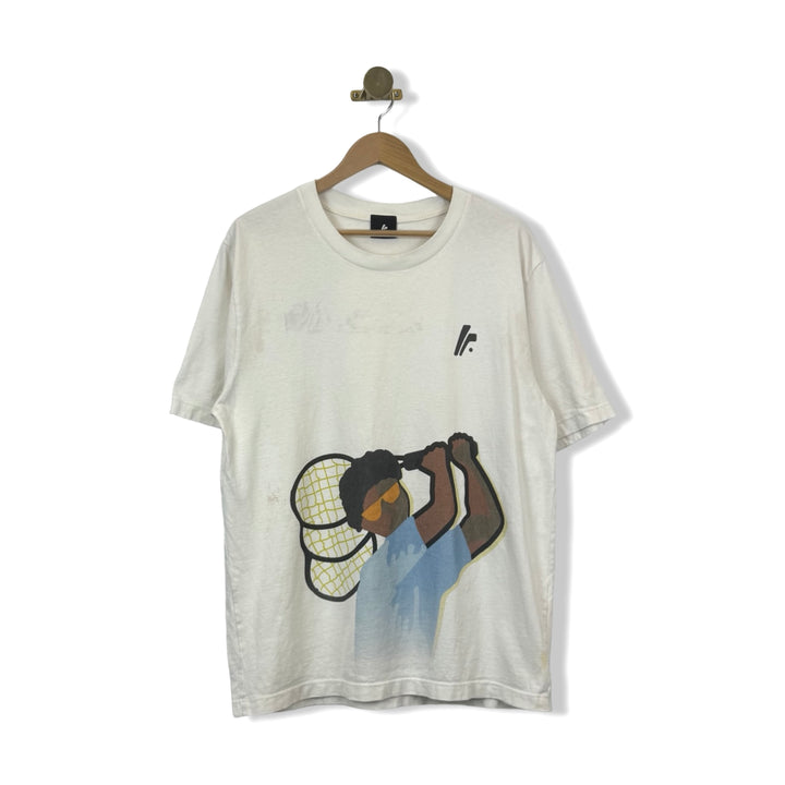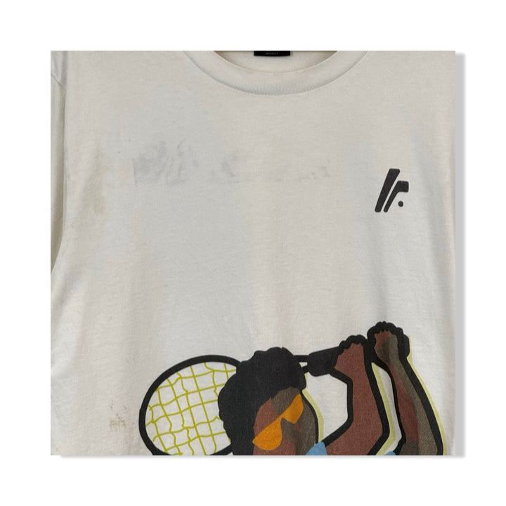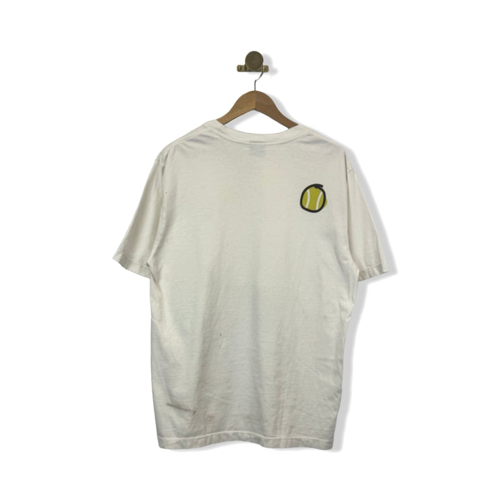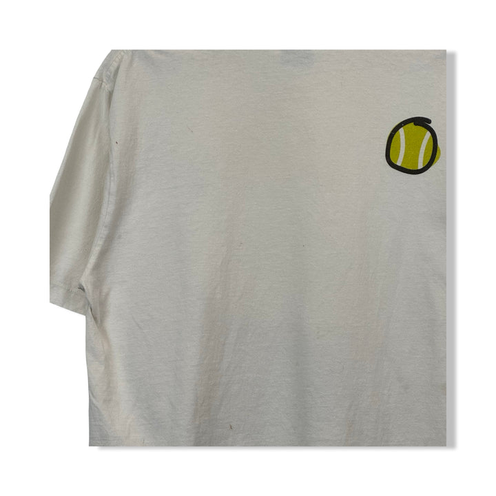 - This short sleeve t-shirt features a playful print of tennis rackets and balls, making it a must-have for any tennis enthusiast. Stay comfortable and stylish on and off the court with this quirky and fun shirt. Game, set, match! Signs of wear (Pictured)