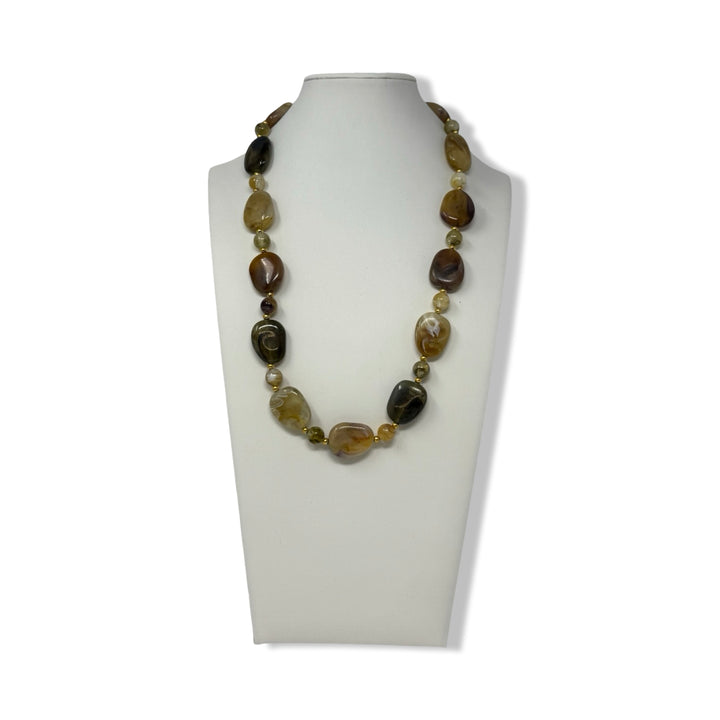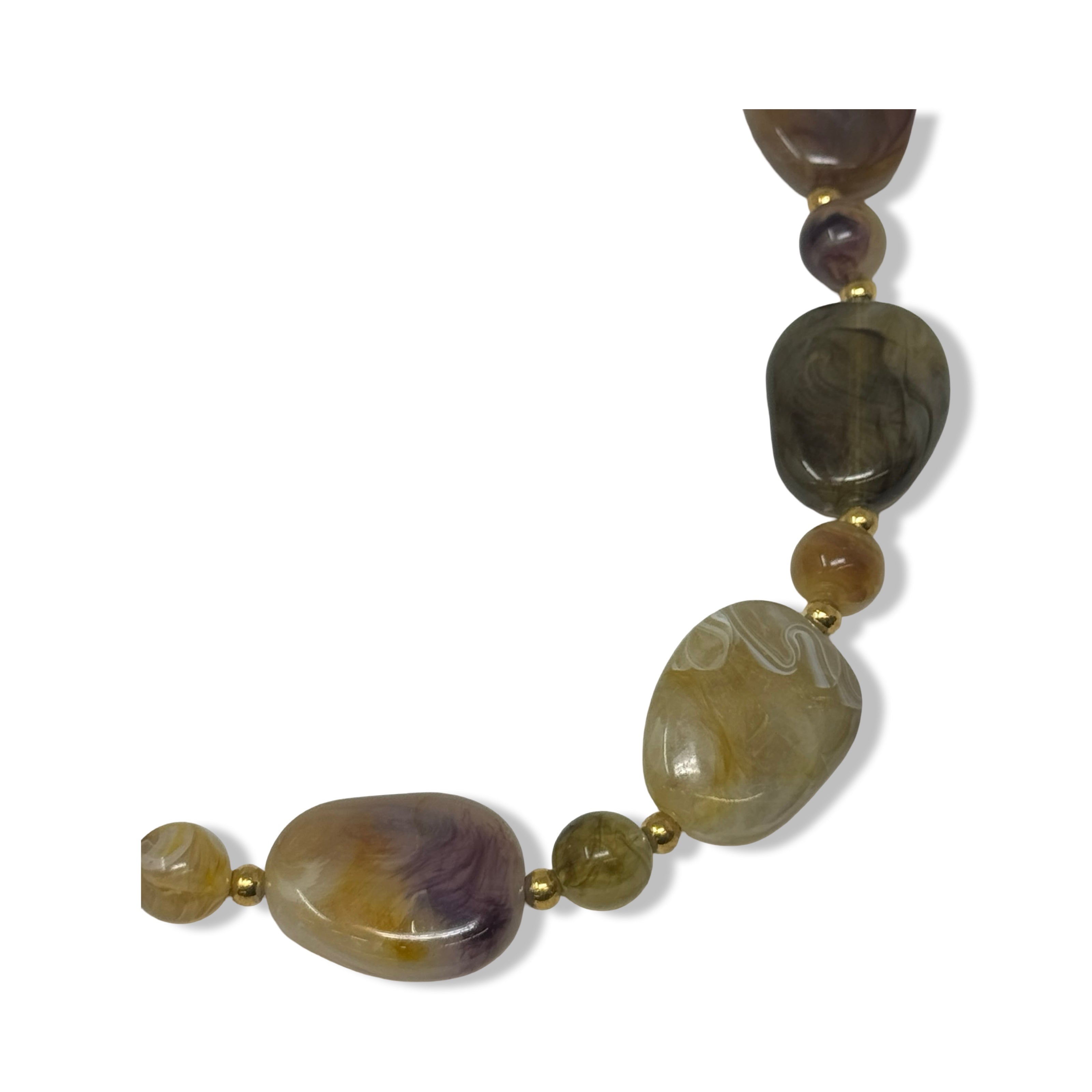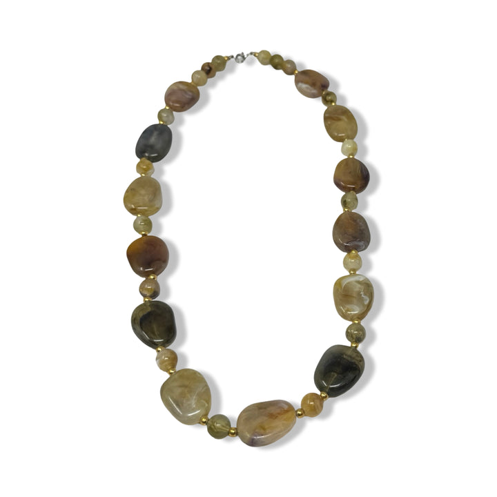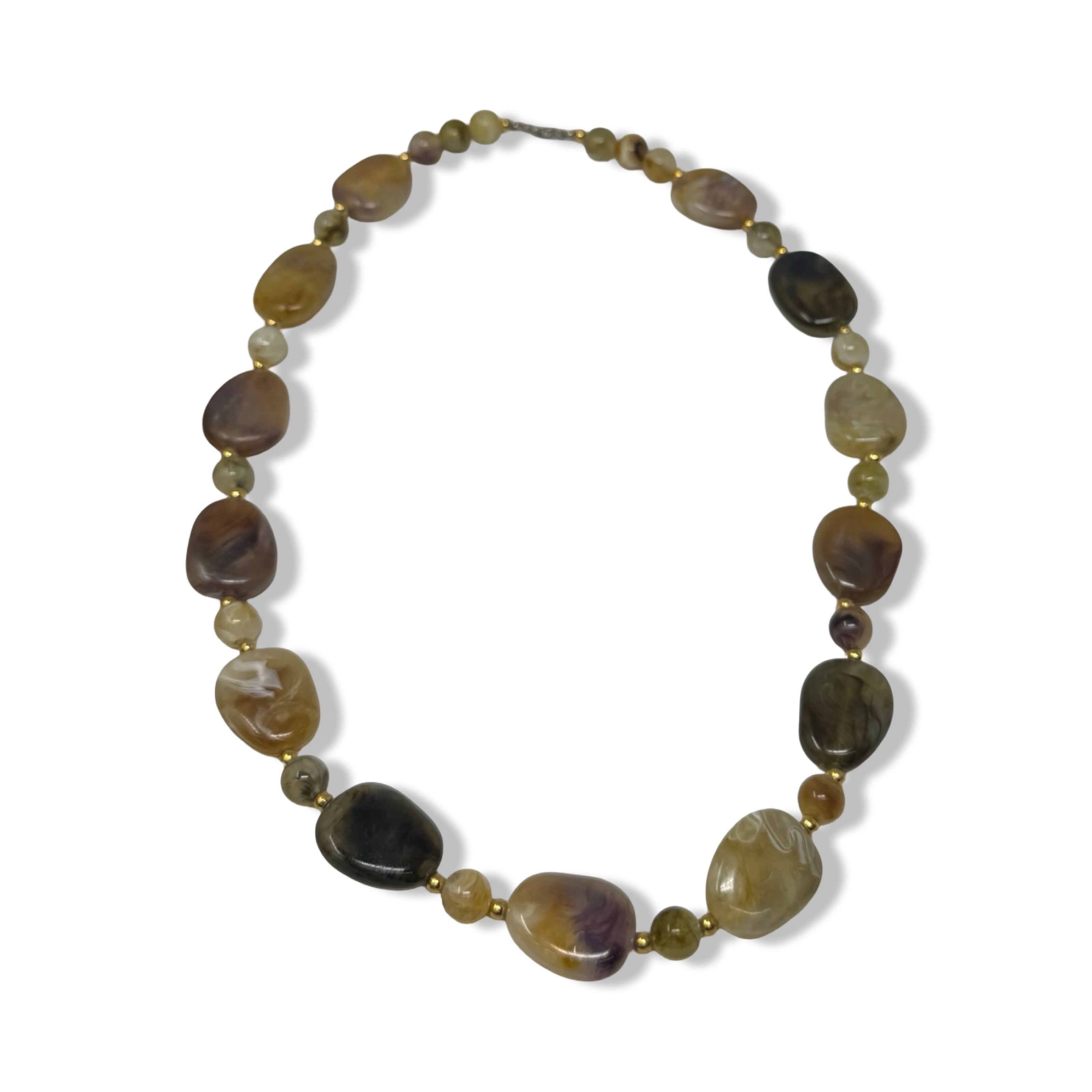 - Flat bead necklace with gold accents throughout. Spring clasp closure.