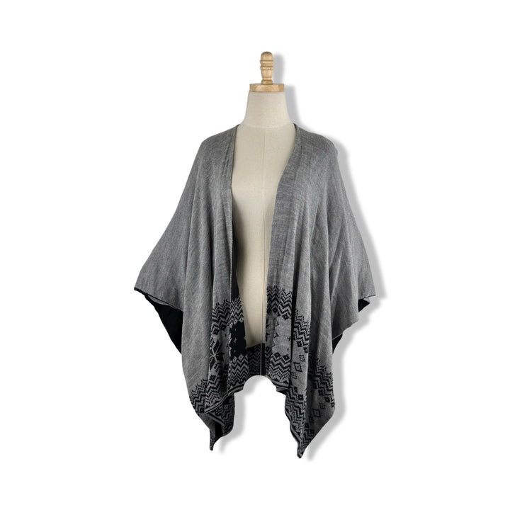 - Double-sided poncho with open sides and a fair isle pattern on hem. Some signs of wear.