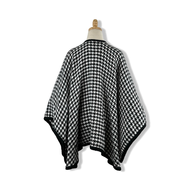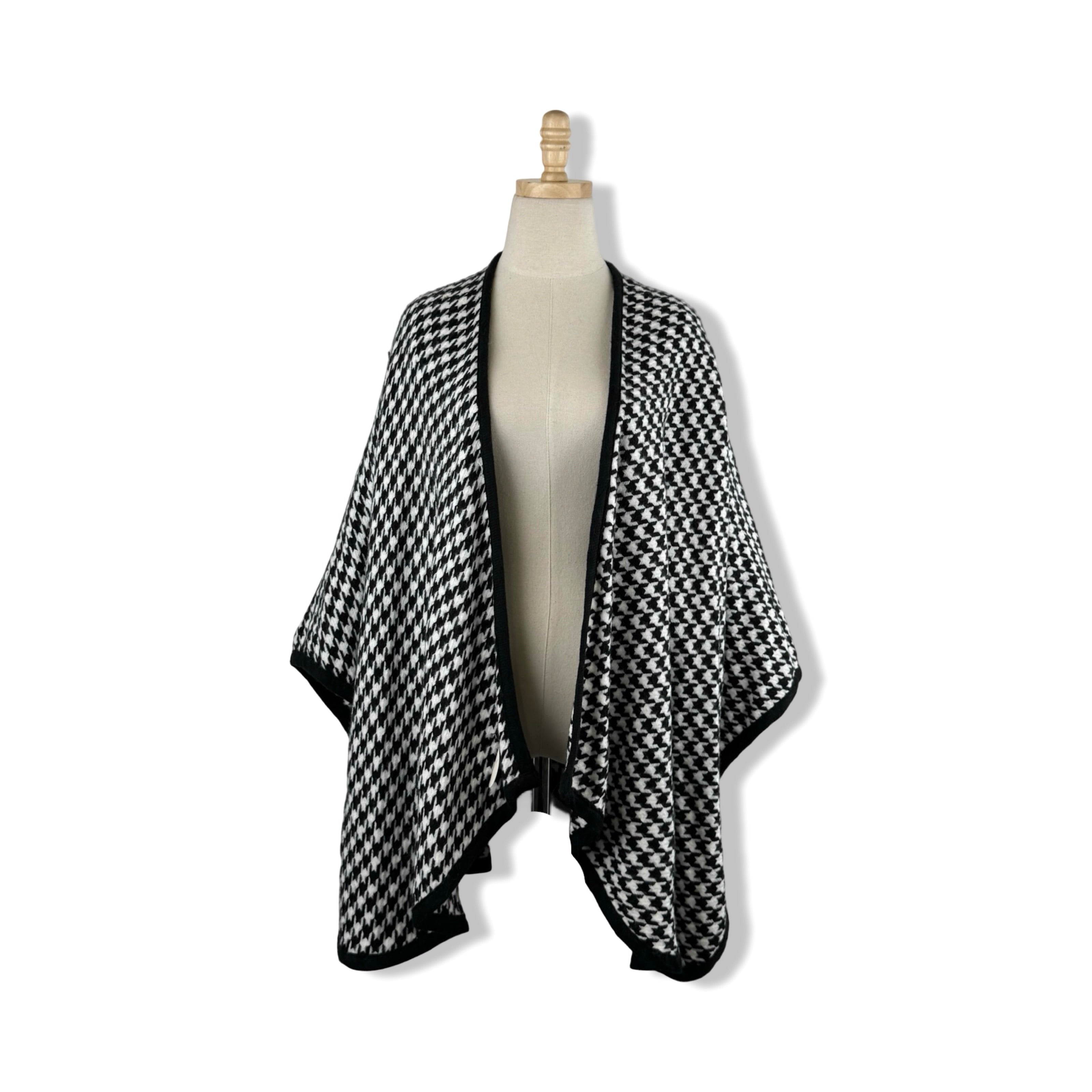 - Open front poncho with open sides, black trim detail and houndstooth pattern throughout.