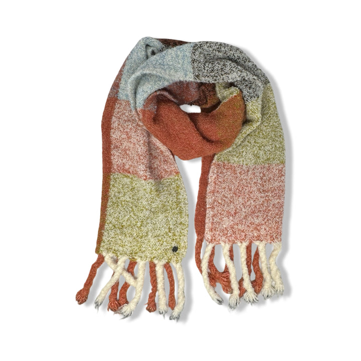 - Chunky scarf with fringe ends and color block pattern