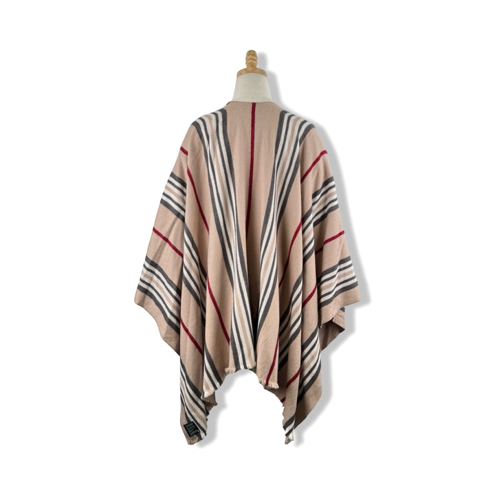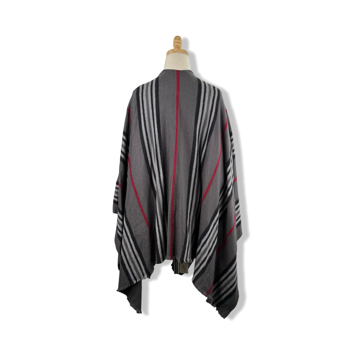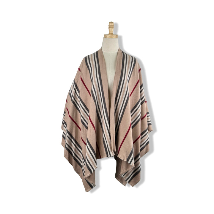 - Open front poncho with frayed trim on hem and striped pattern throughout.