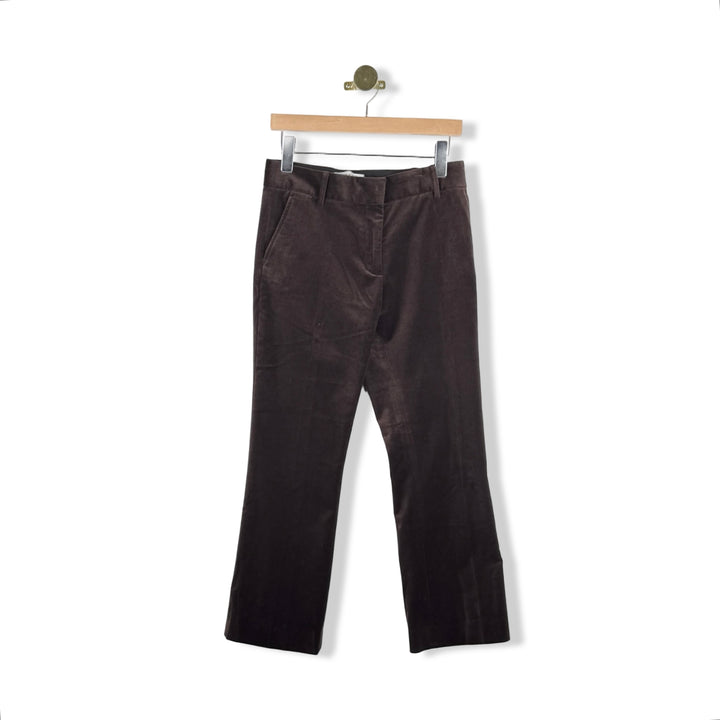 - Velvet pants with dual front pockets, faux back pockets, and hook and bar zip fly