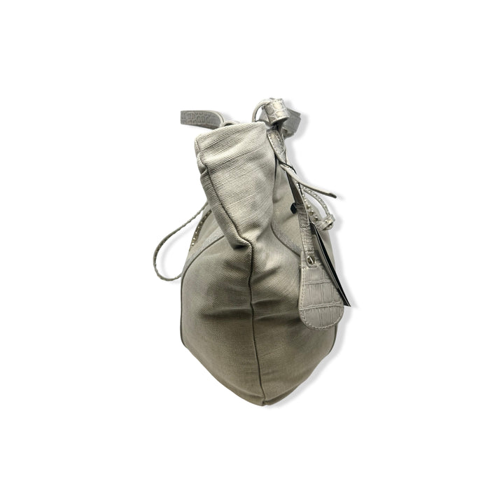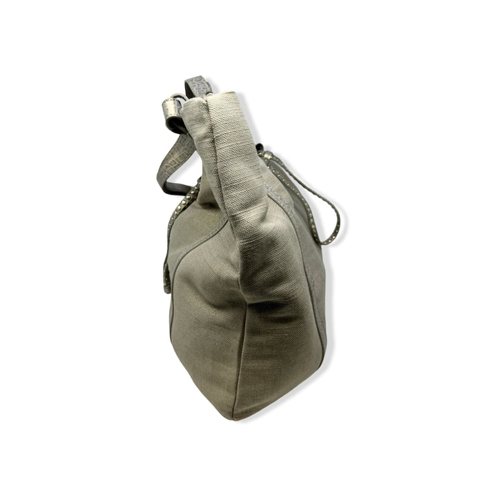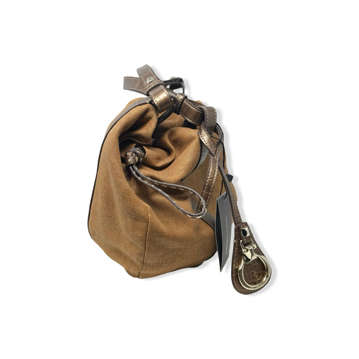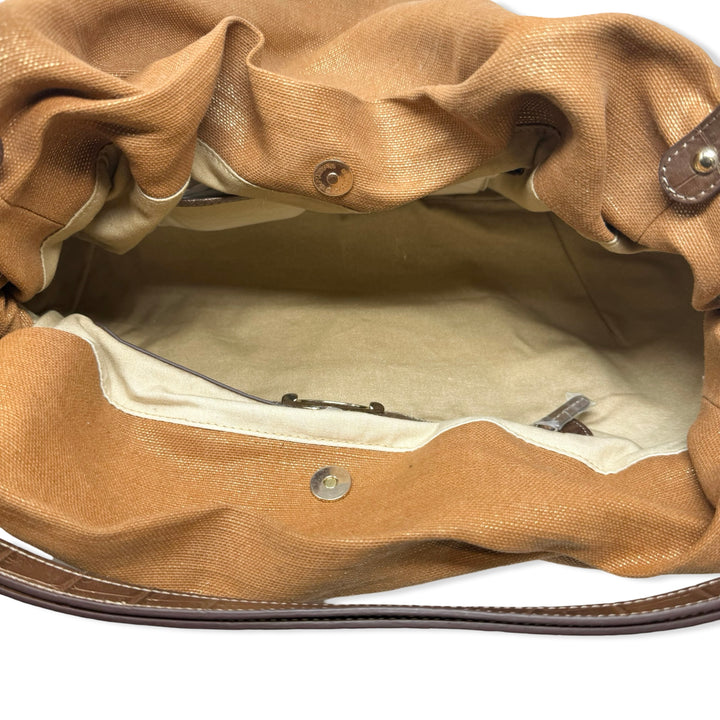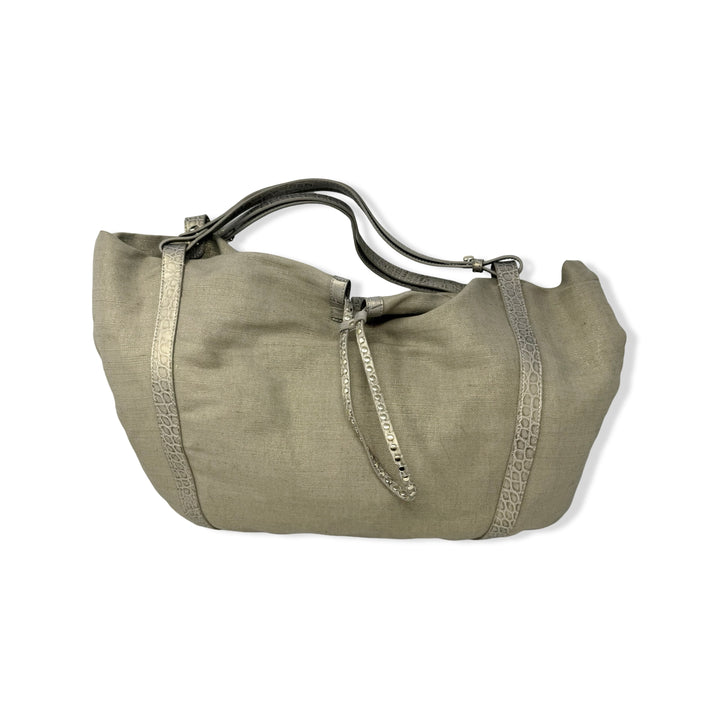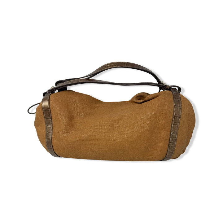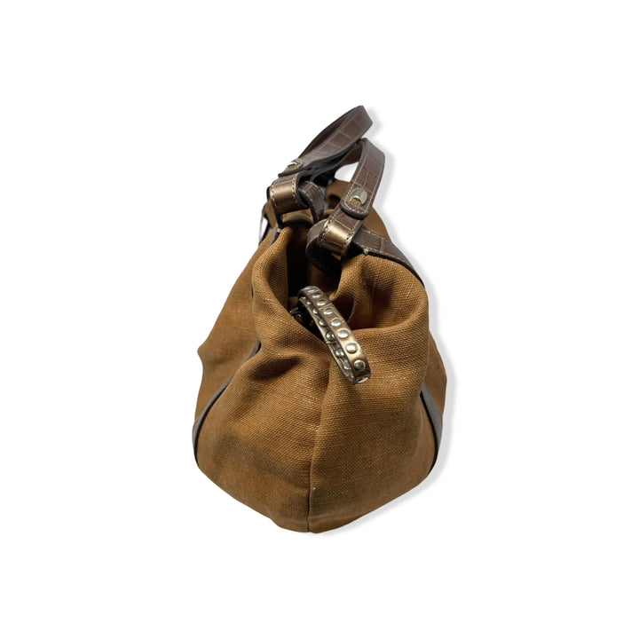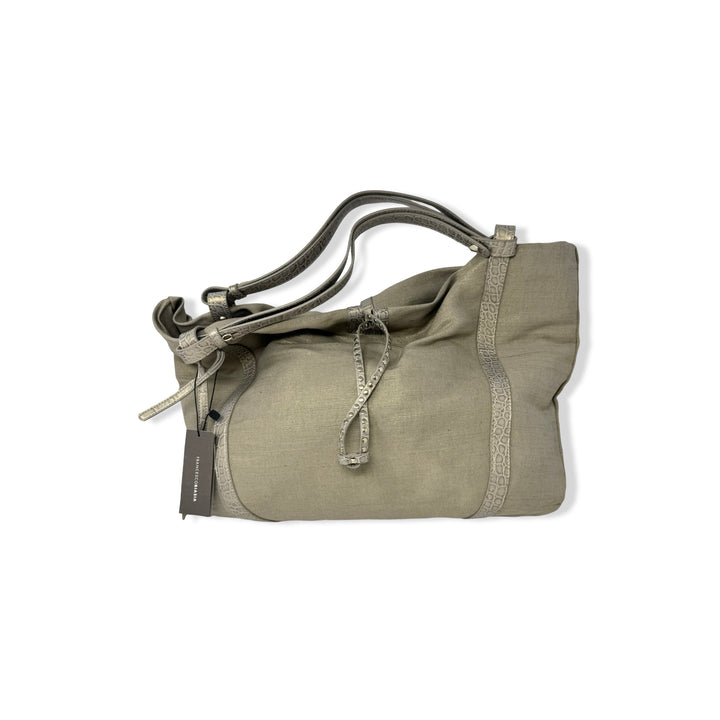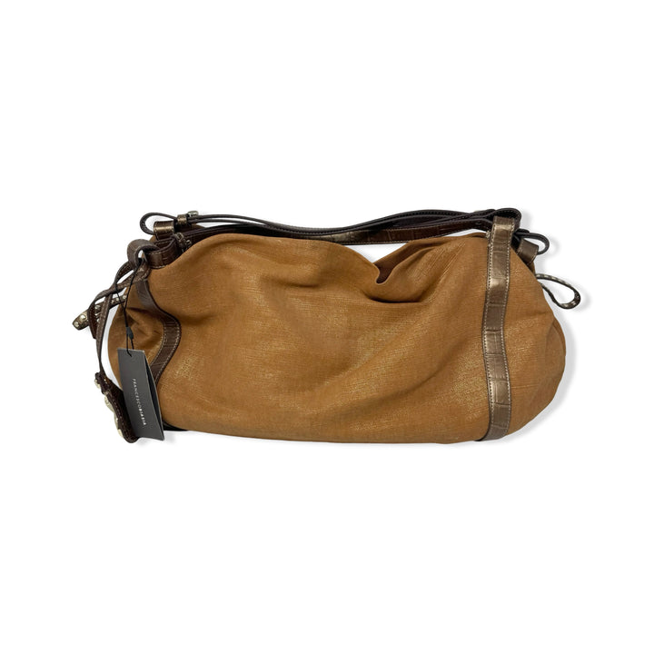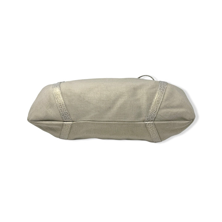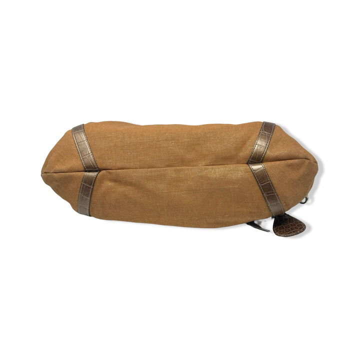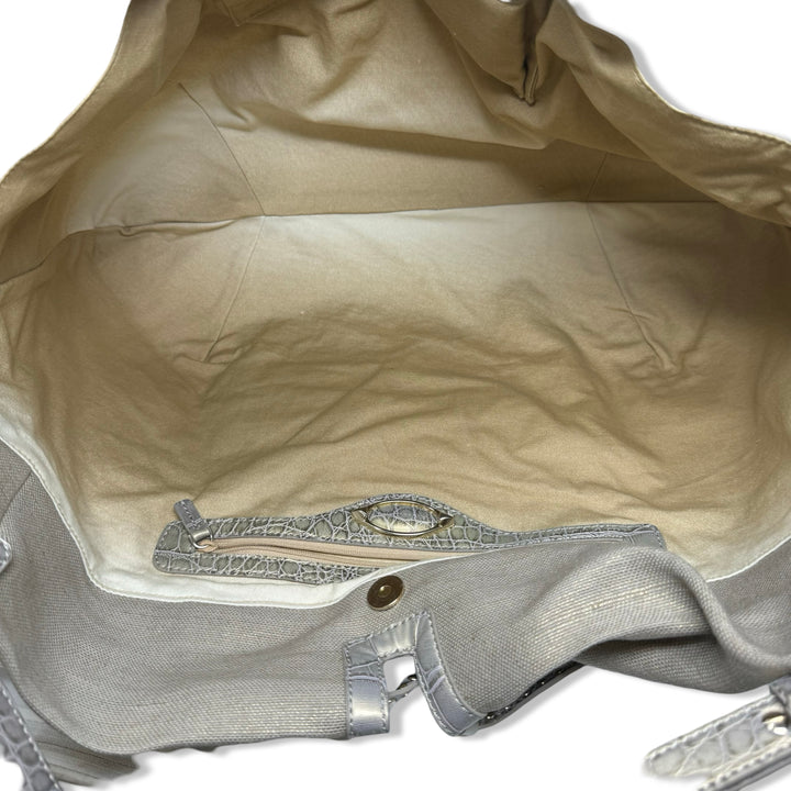 - Oversized tote handbag with metallic fiber textile exterior. Includes one main inner compartment and multiple smaller inner pockets. Magnetic closure.