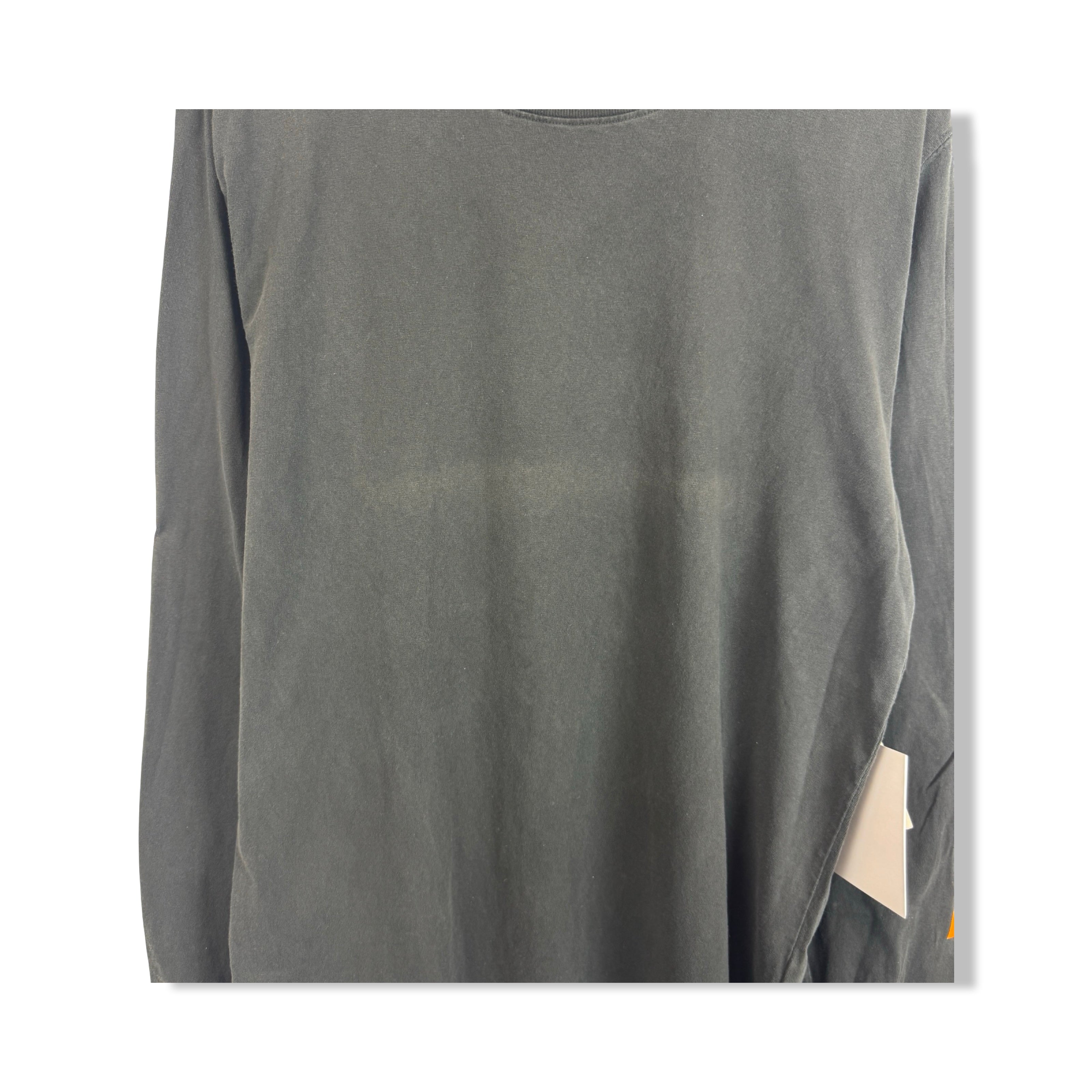 - Long sleeve tee with logo on sleeve. Labeled size 0 and 3; approx. size X-Small and Large. Some dye transfer throughout shirt.