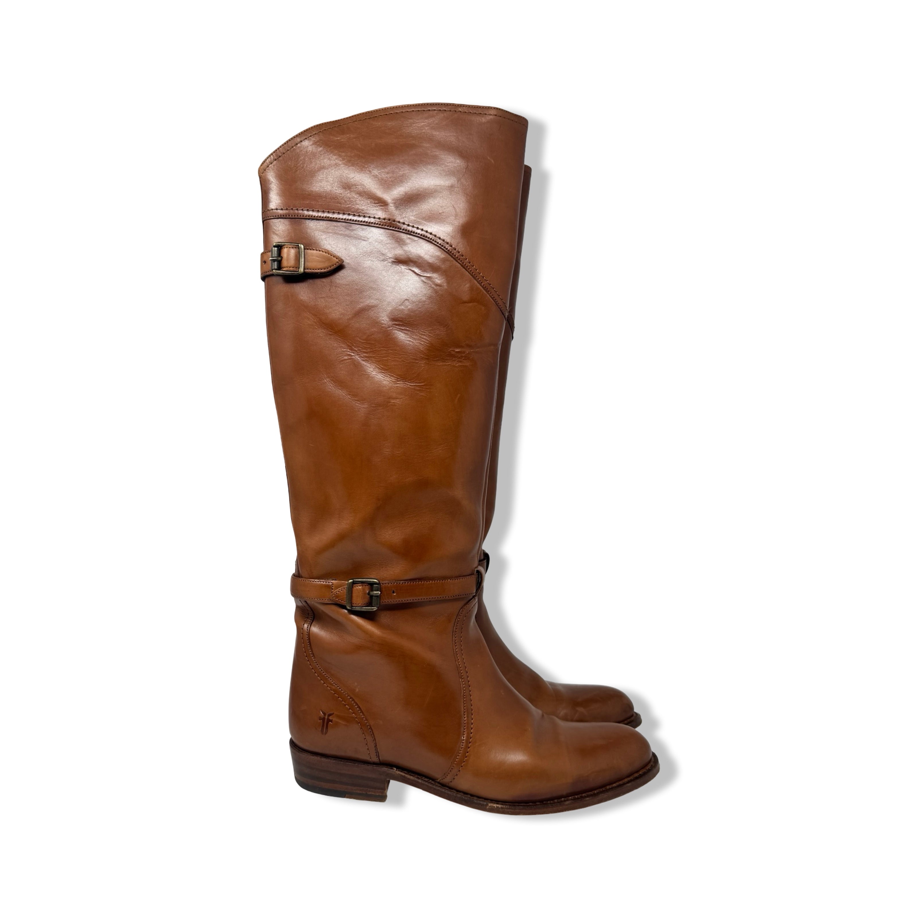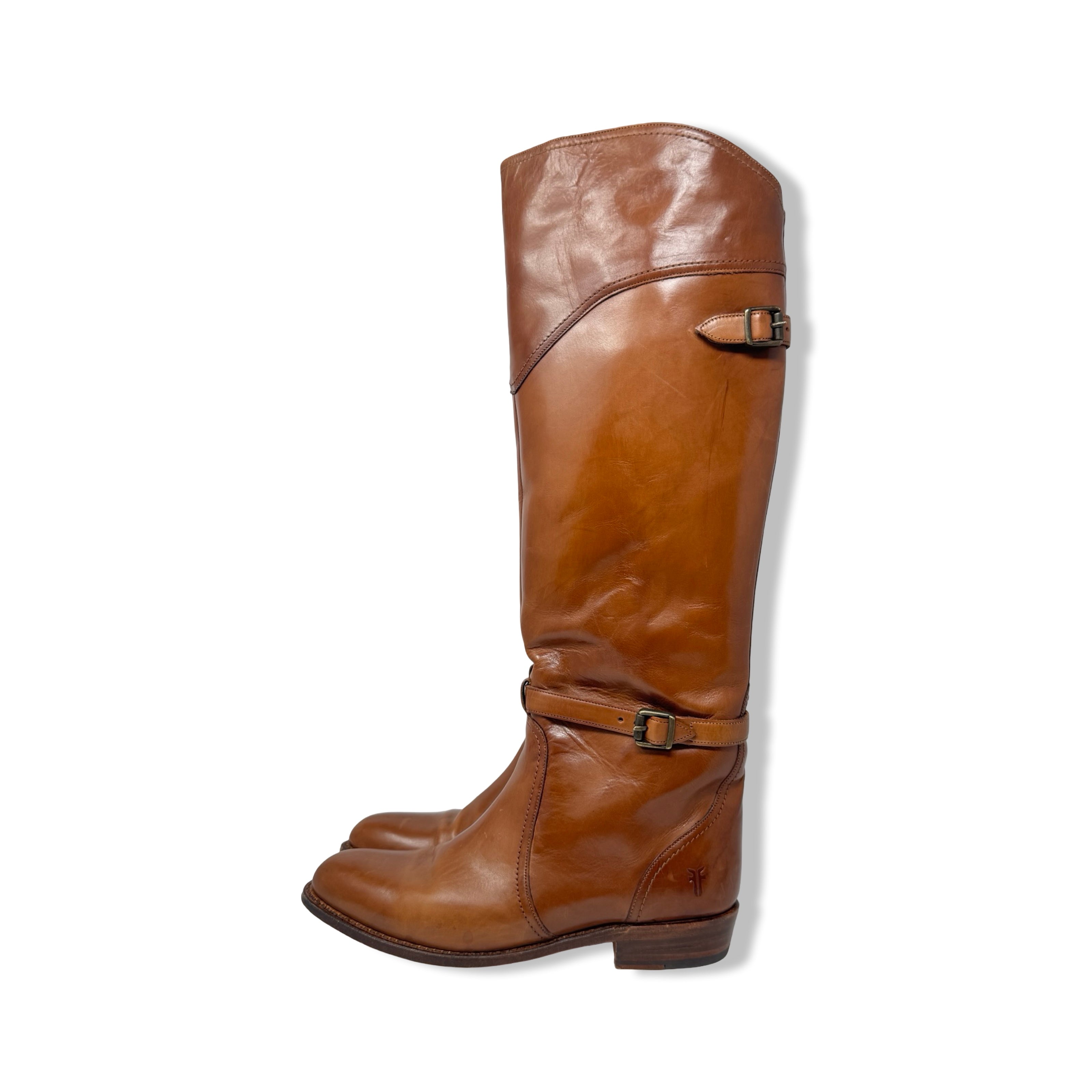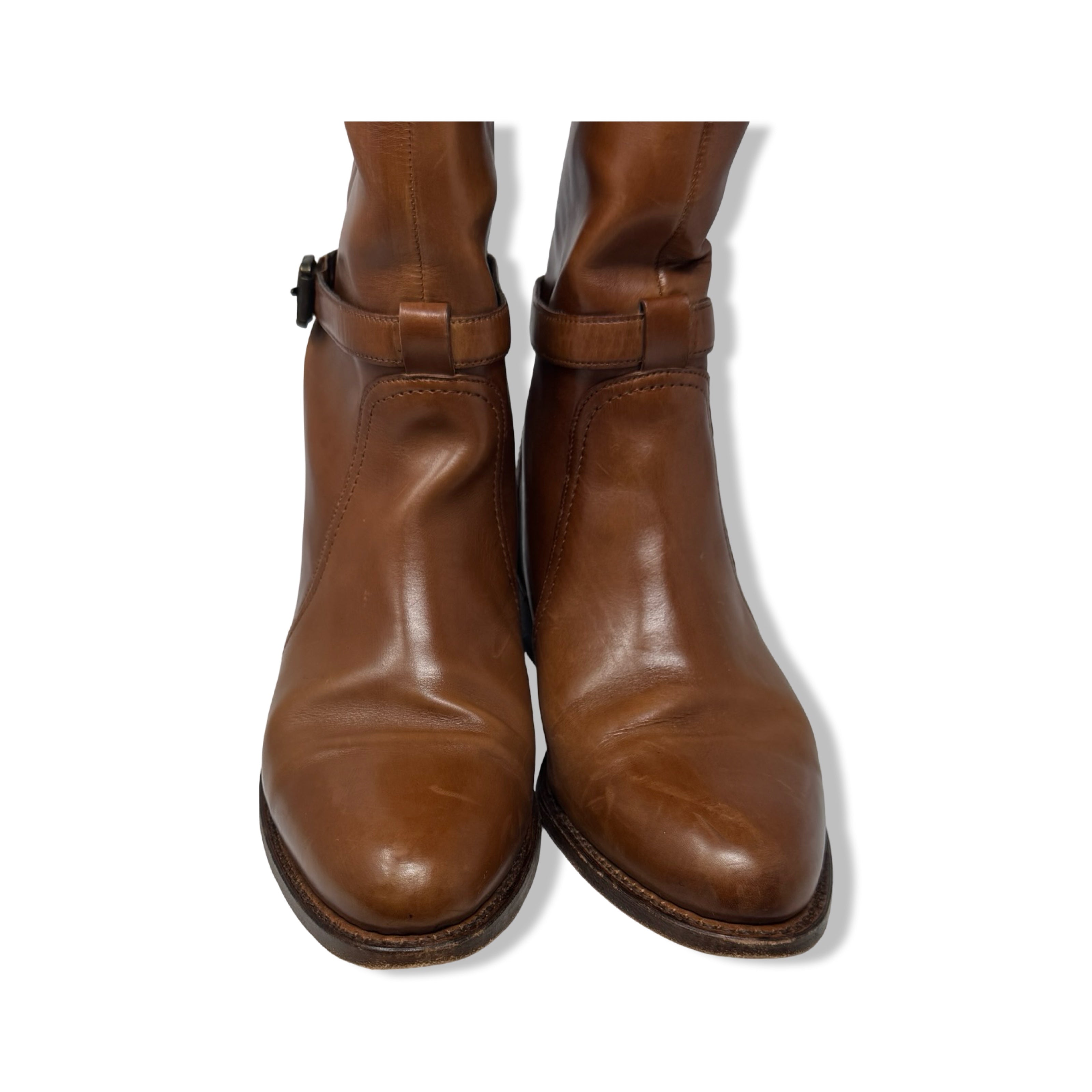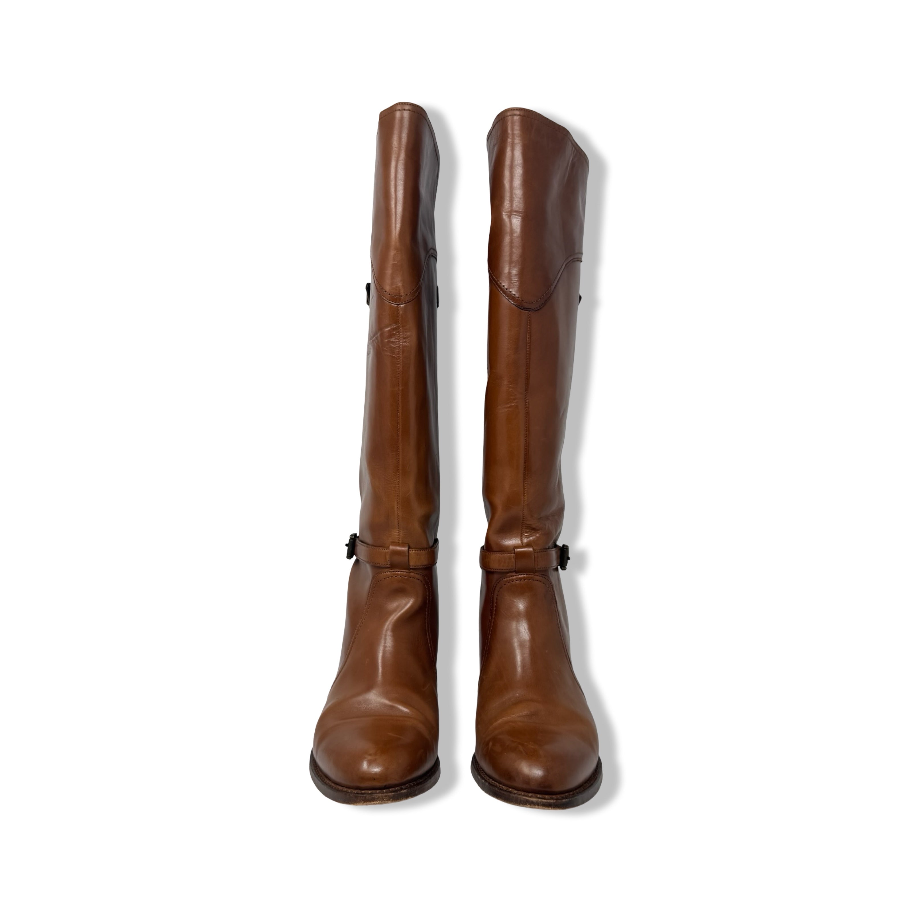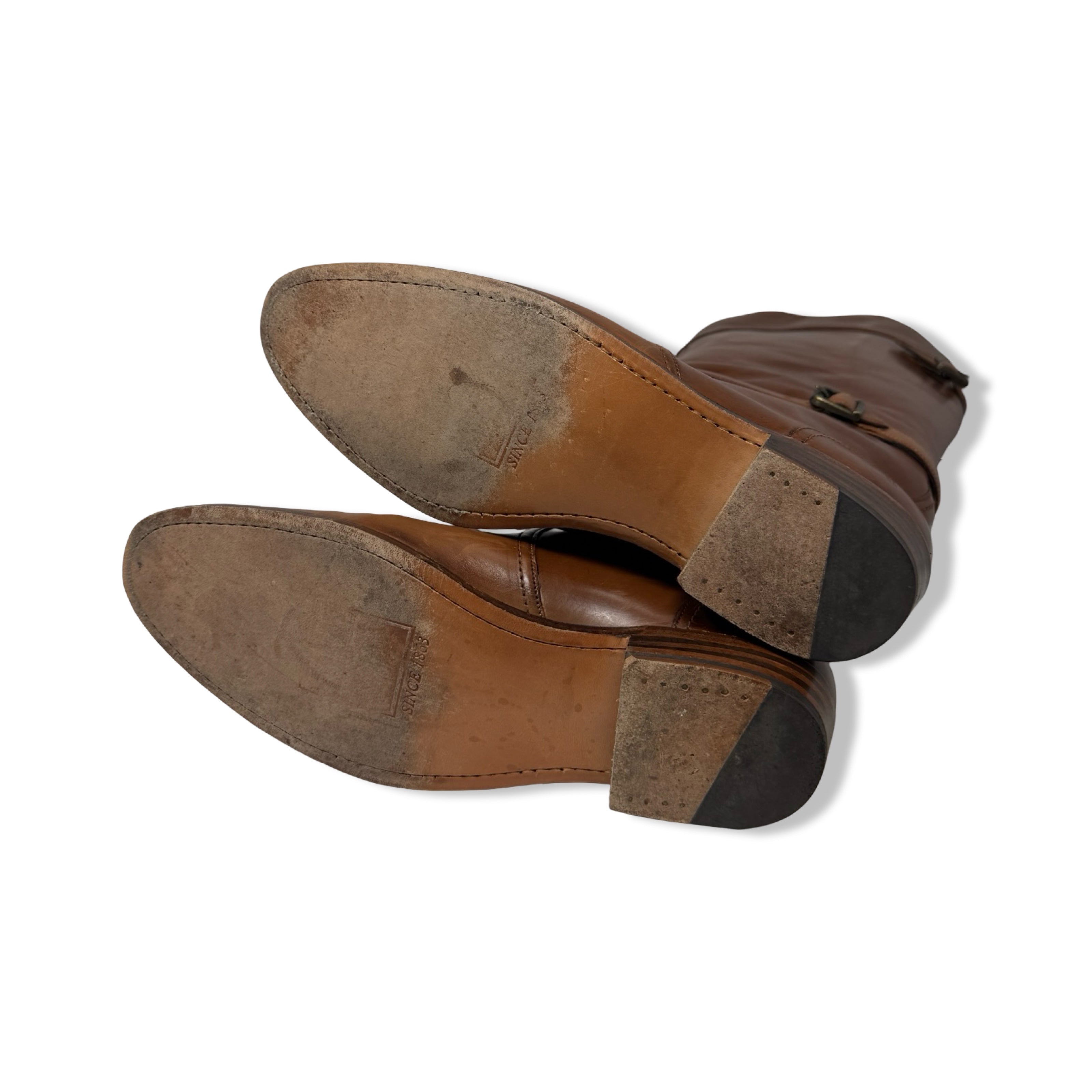 - Pull on riding boots with belt buckle strap closure on ankle and top of boot. Contrast stitching and logo on side.