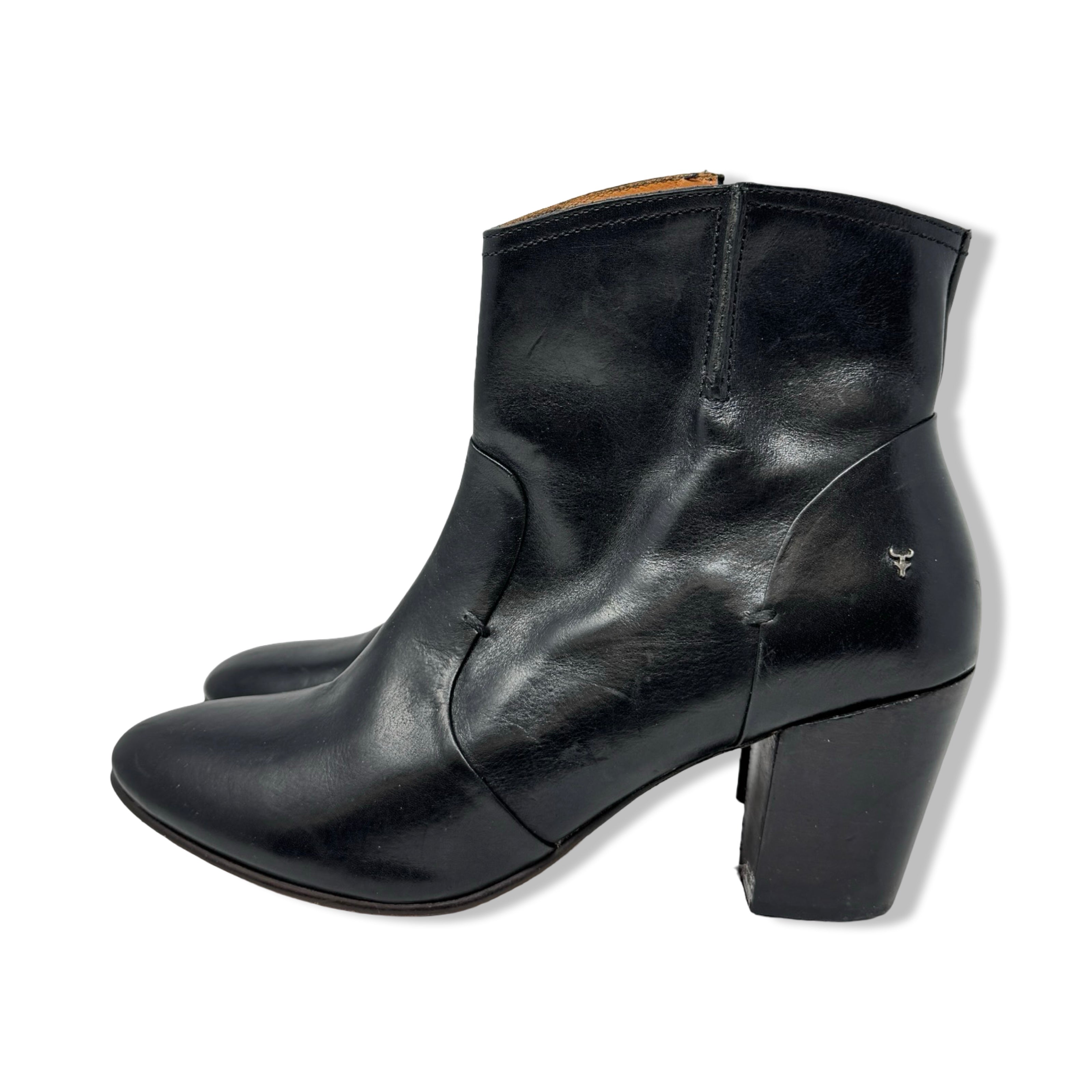 - Smooth leather boots with side zip closure and pointed toe. Silver logo hardware detail on side and block heel.