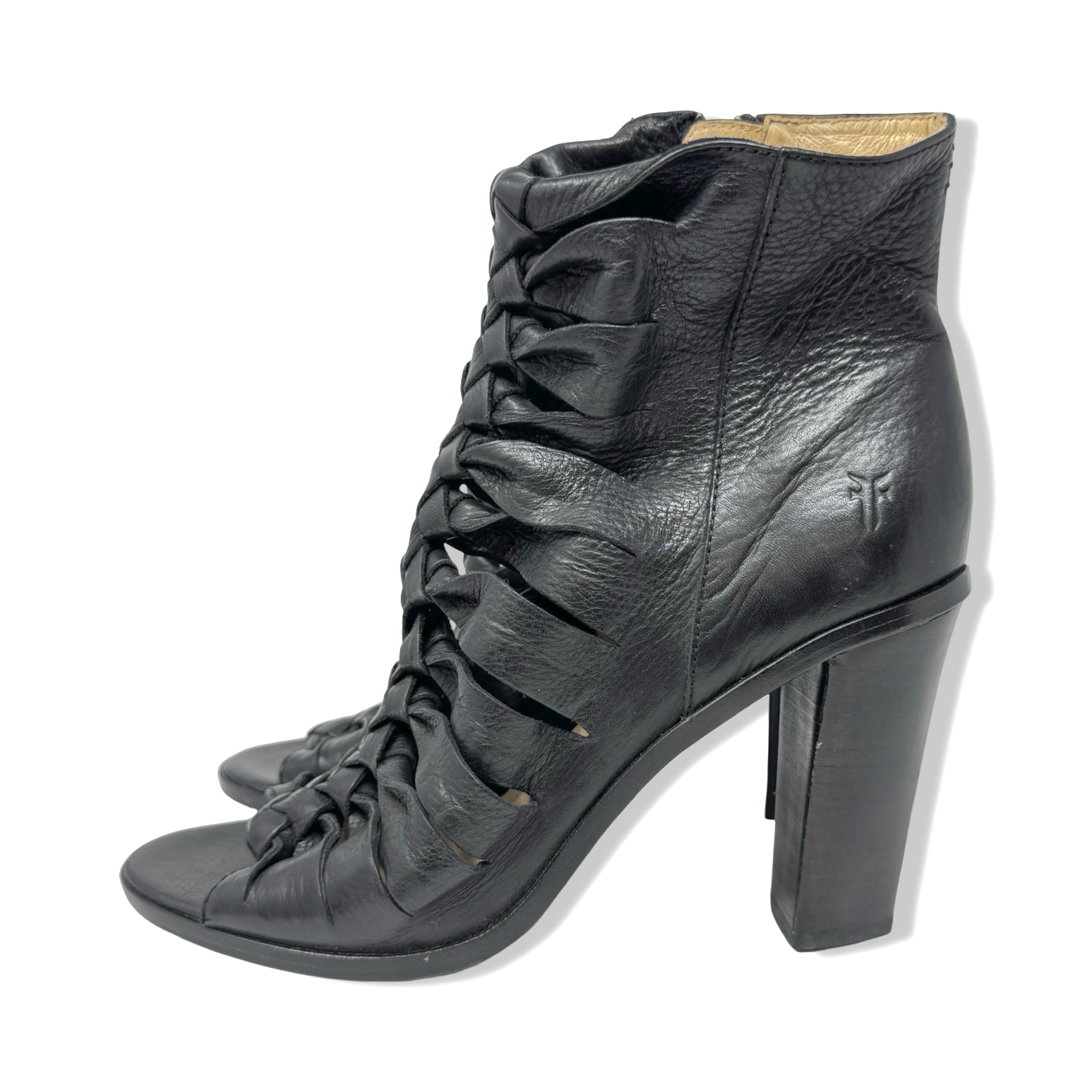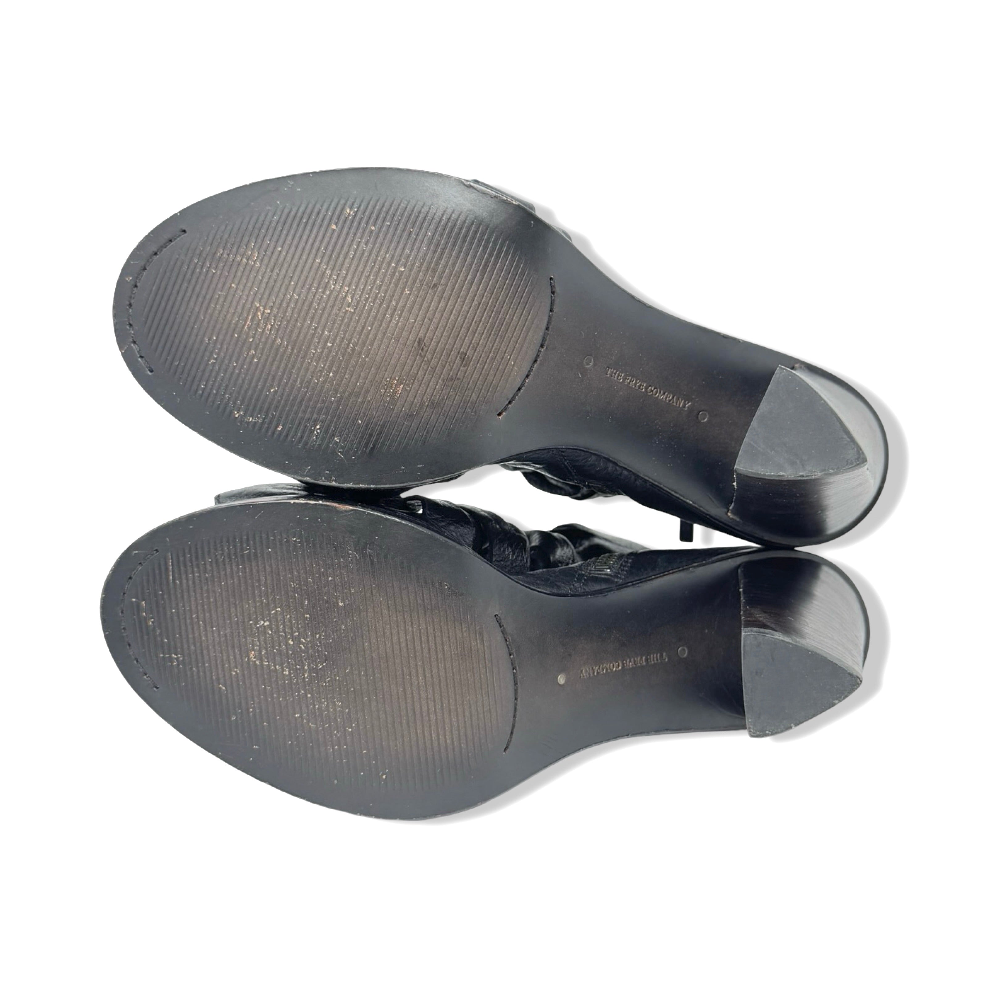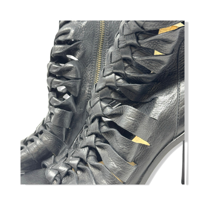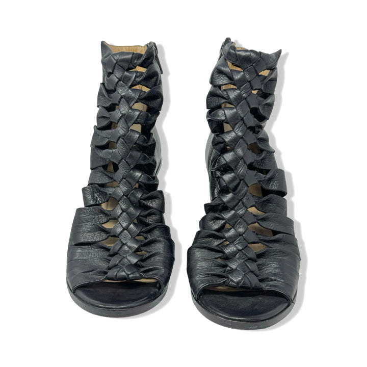- Peep-toe heels with braided detail and side zip closure. Some signs of wear
