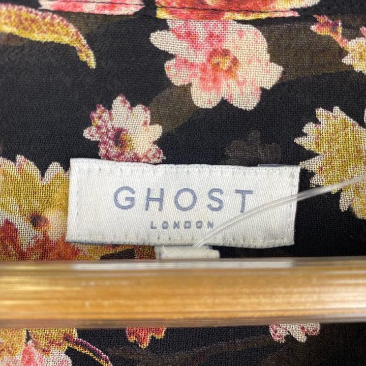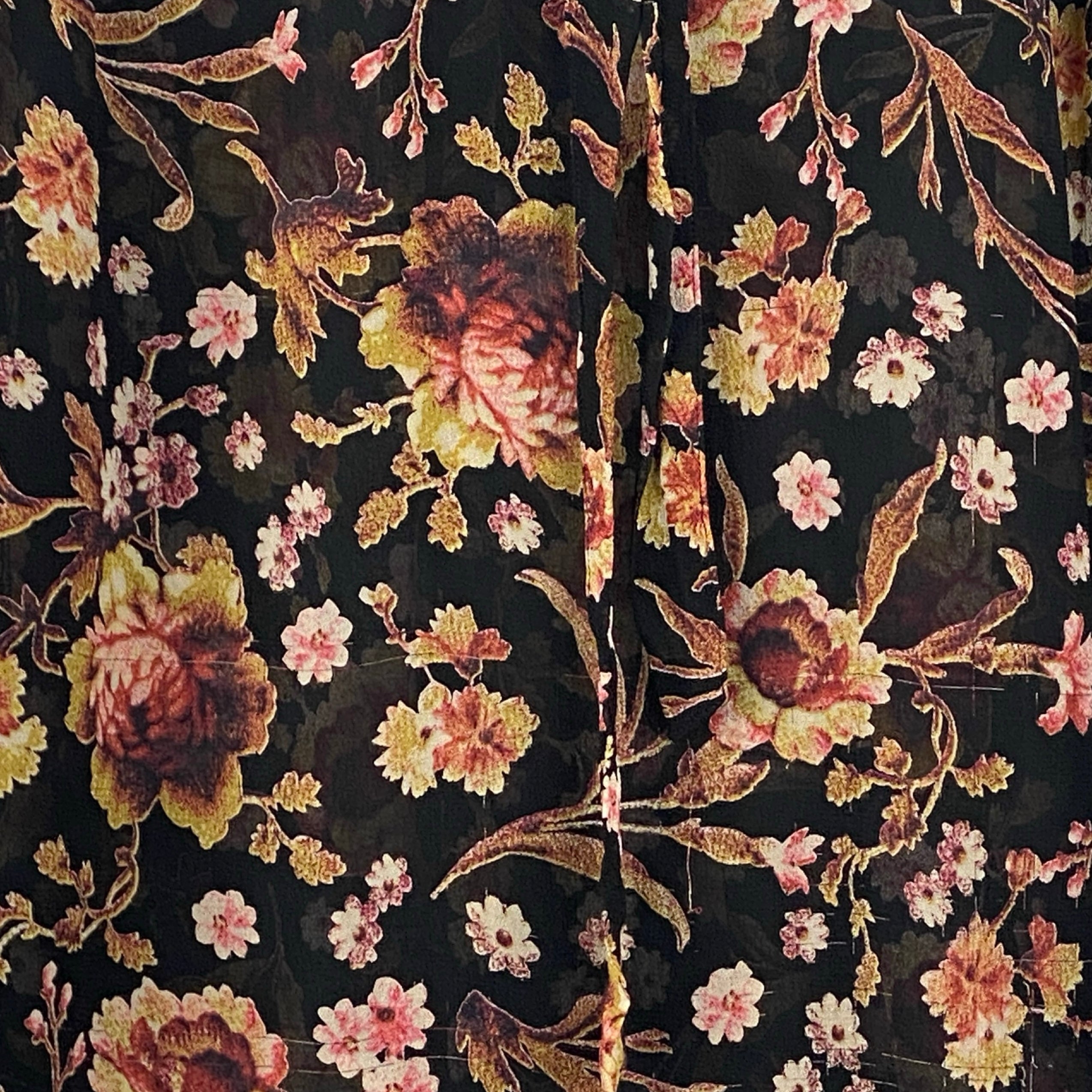 - Long sleeve sheer top with self tie at neckline, and curved hem. Signs of wear