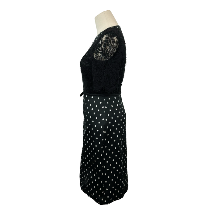 - Midi dress with embroidered polka dots, lace sleeves, and a faux tie cinched waist.