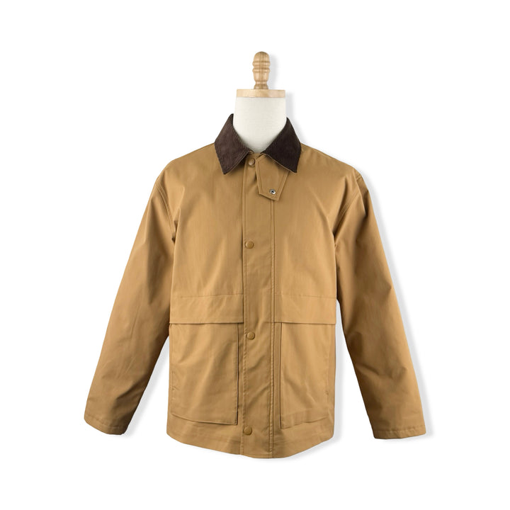 - Jacket with corduroy collar, dual front pockets, and snap button zip closure