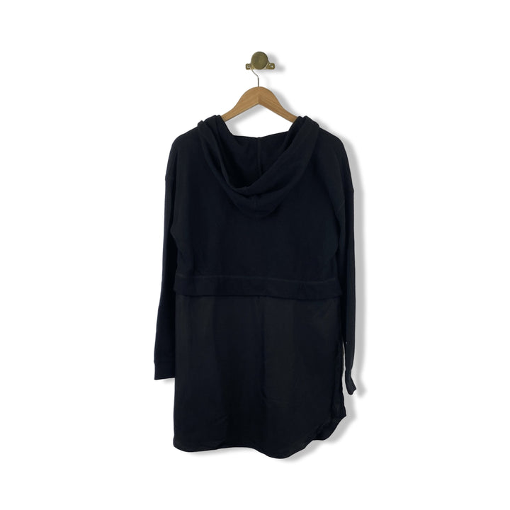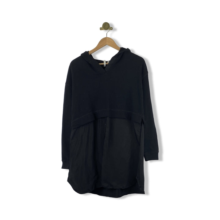 - Layered woven button up and knit hooded top