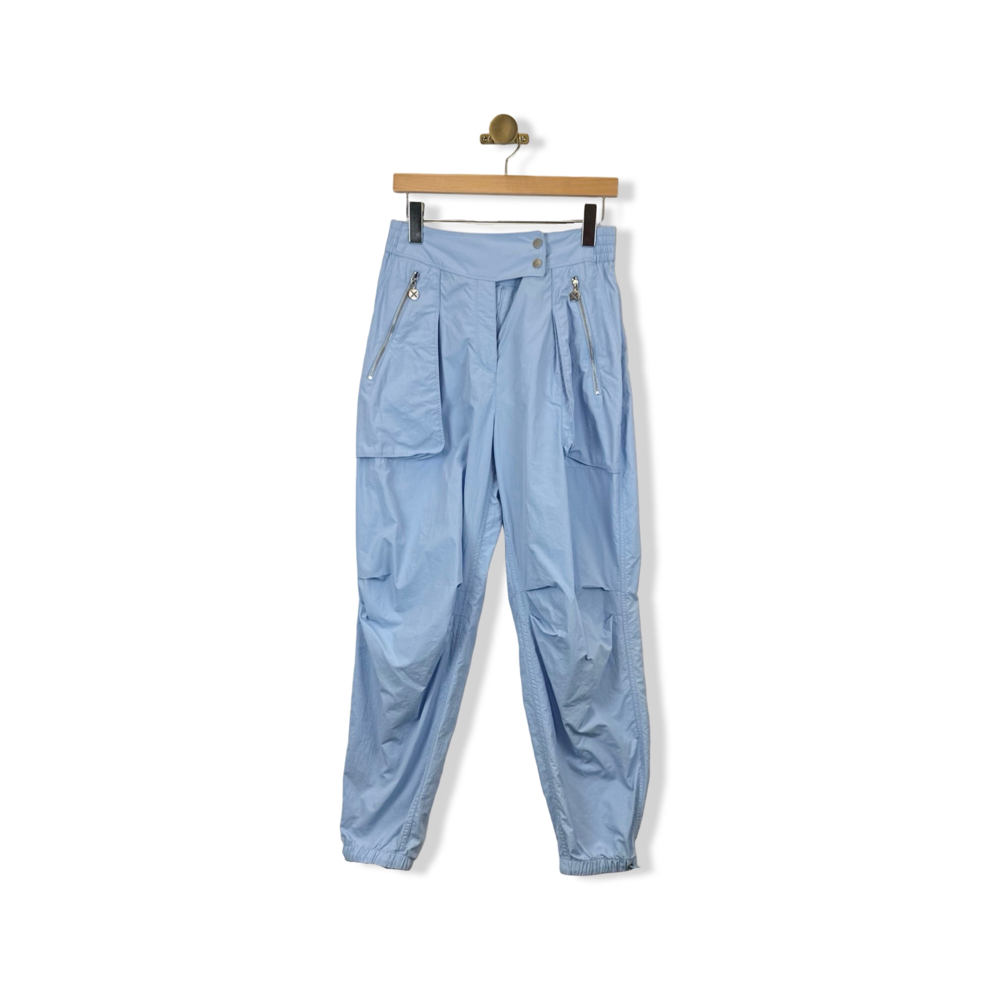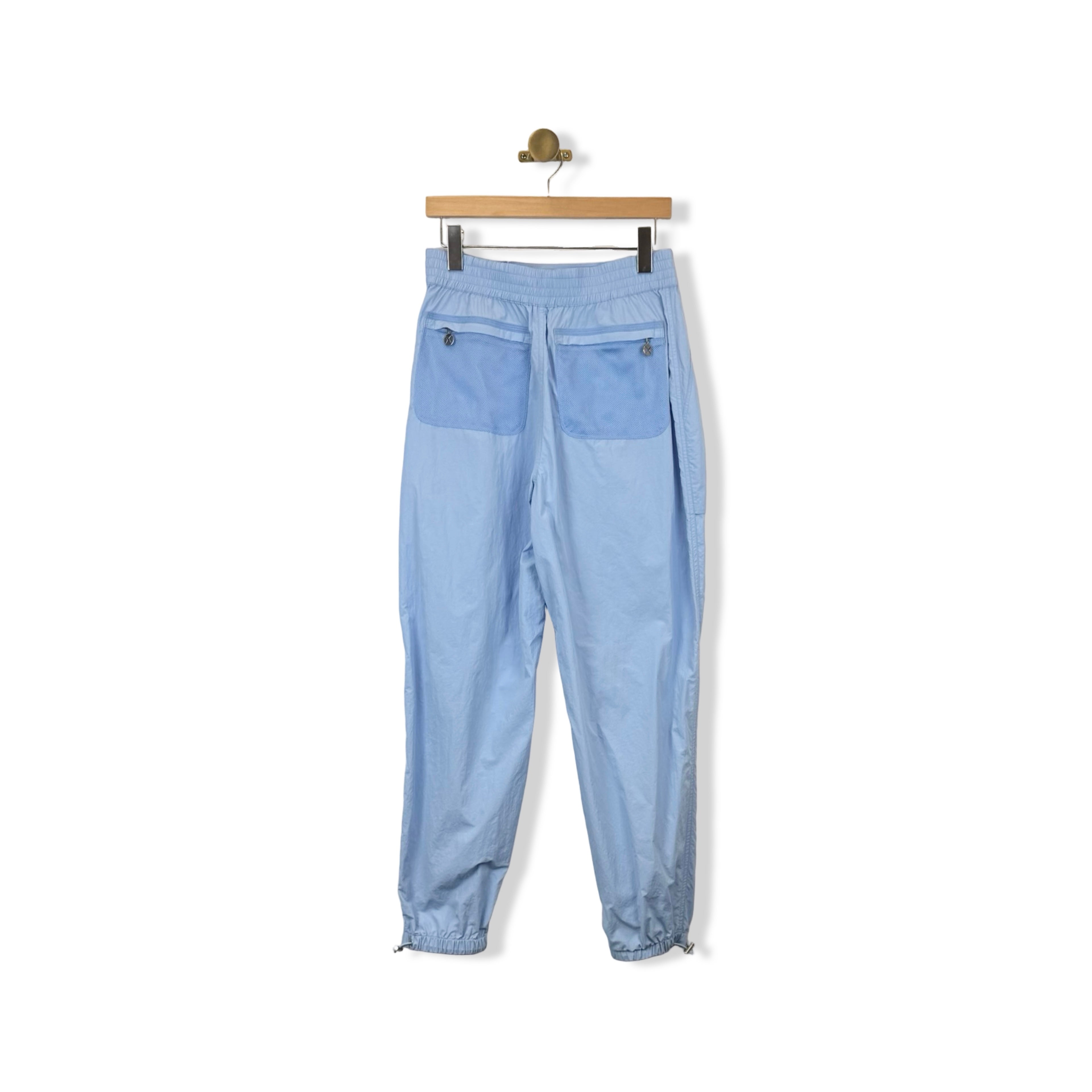 - Parachute pants with mesh details, silver tone hardware, and button zip fly.