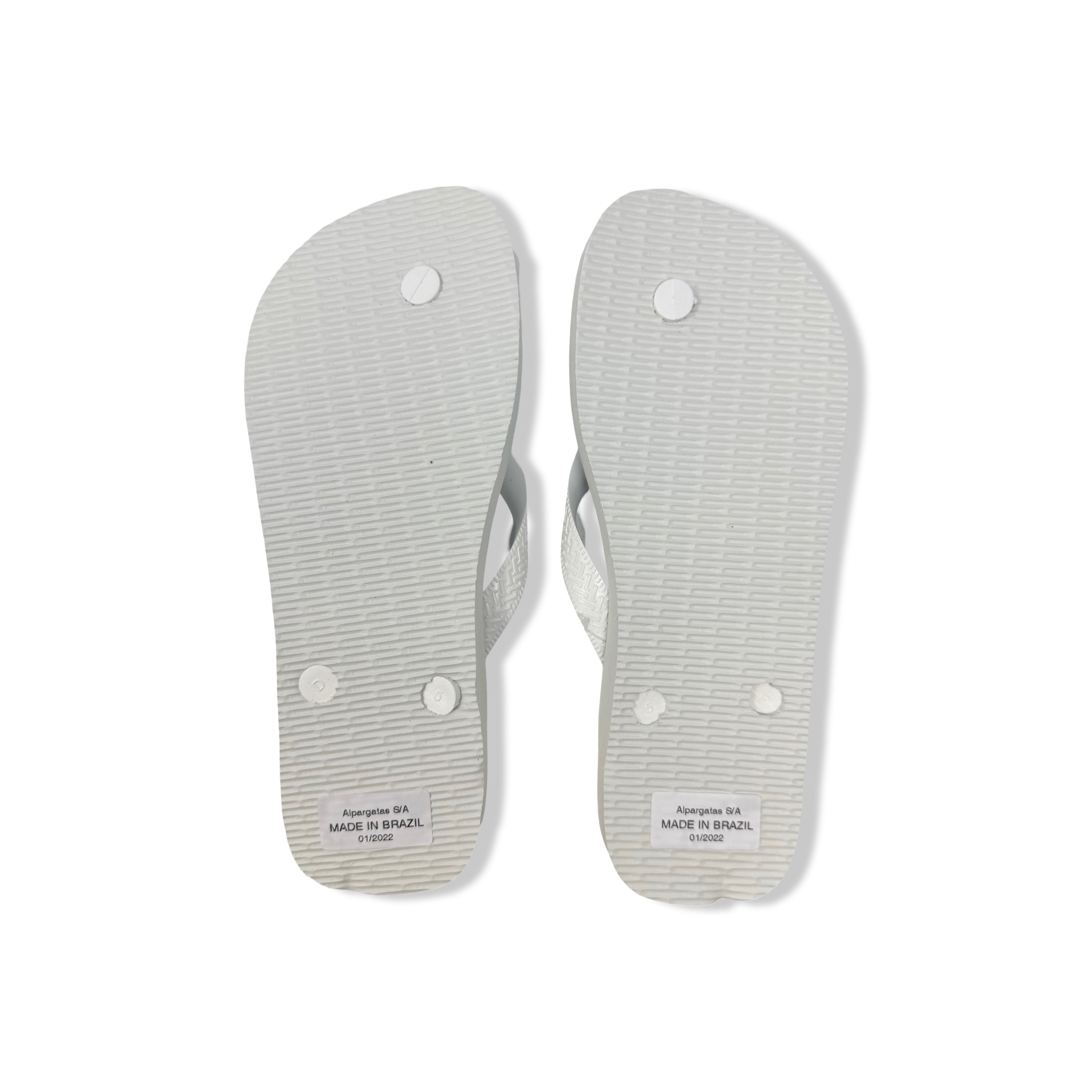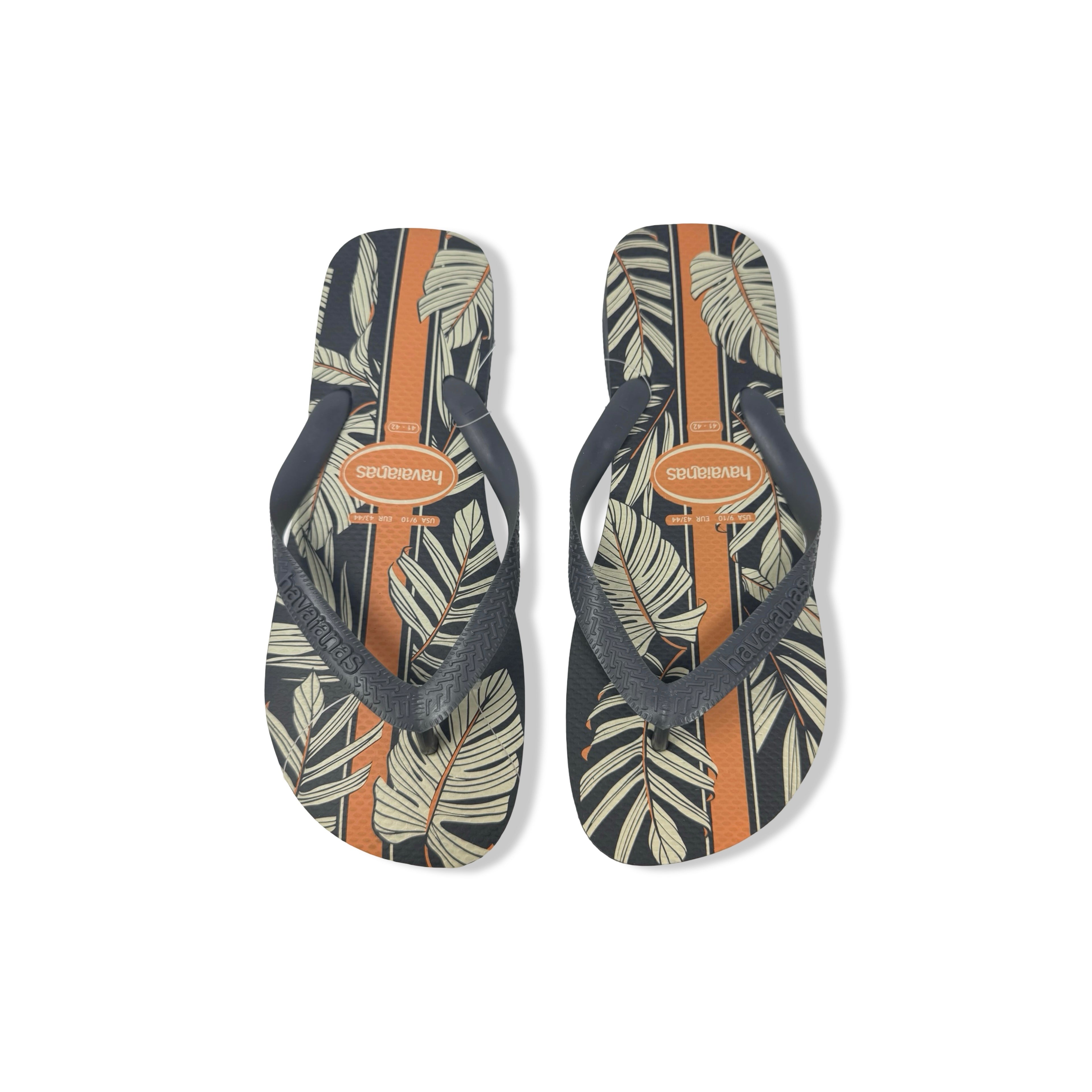 - Palm leaf patterned flip flops. Marked size 9/10 and 11/12