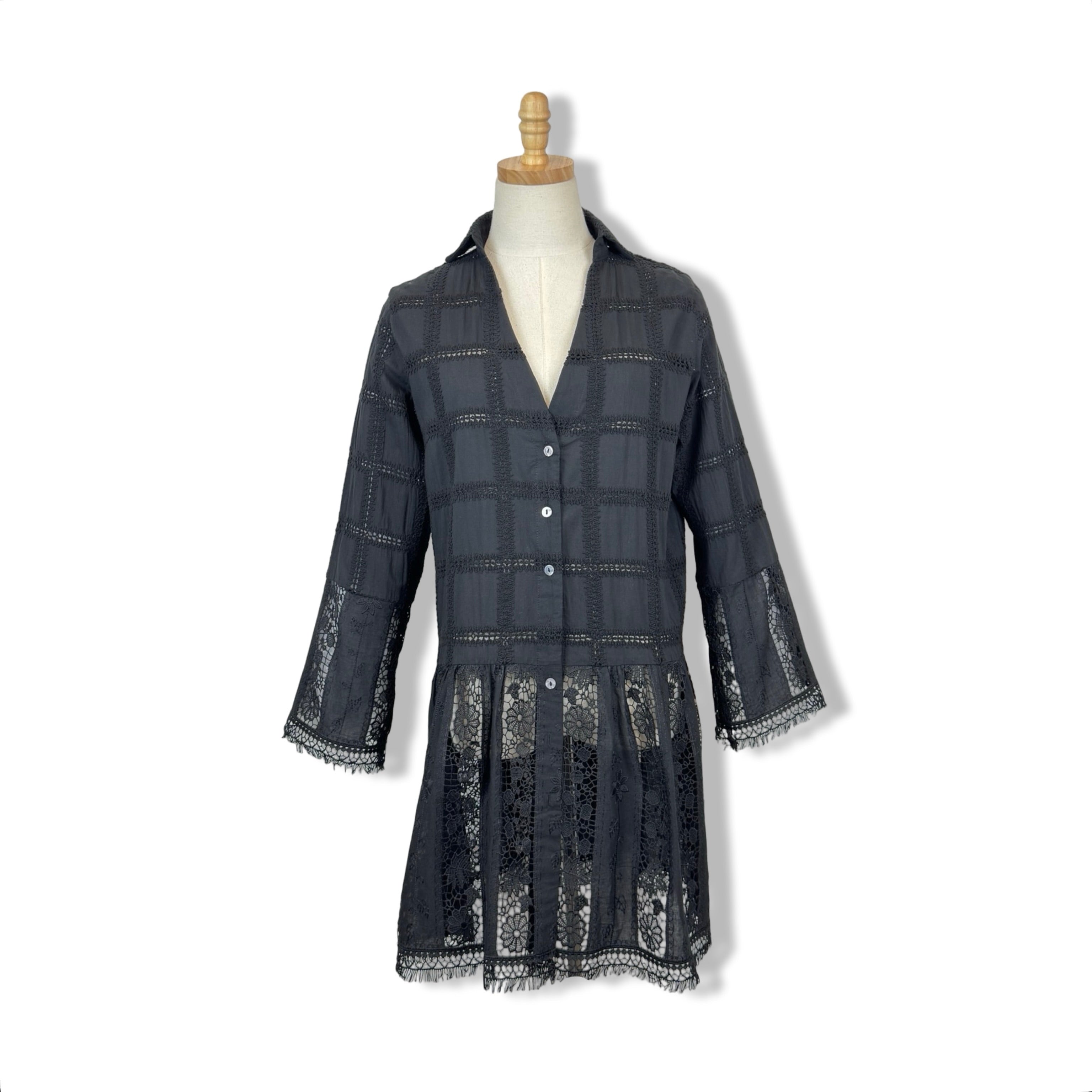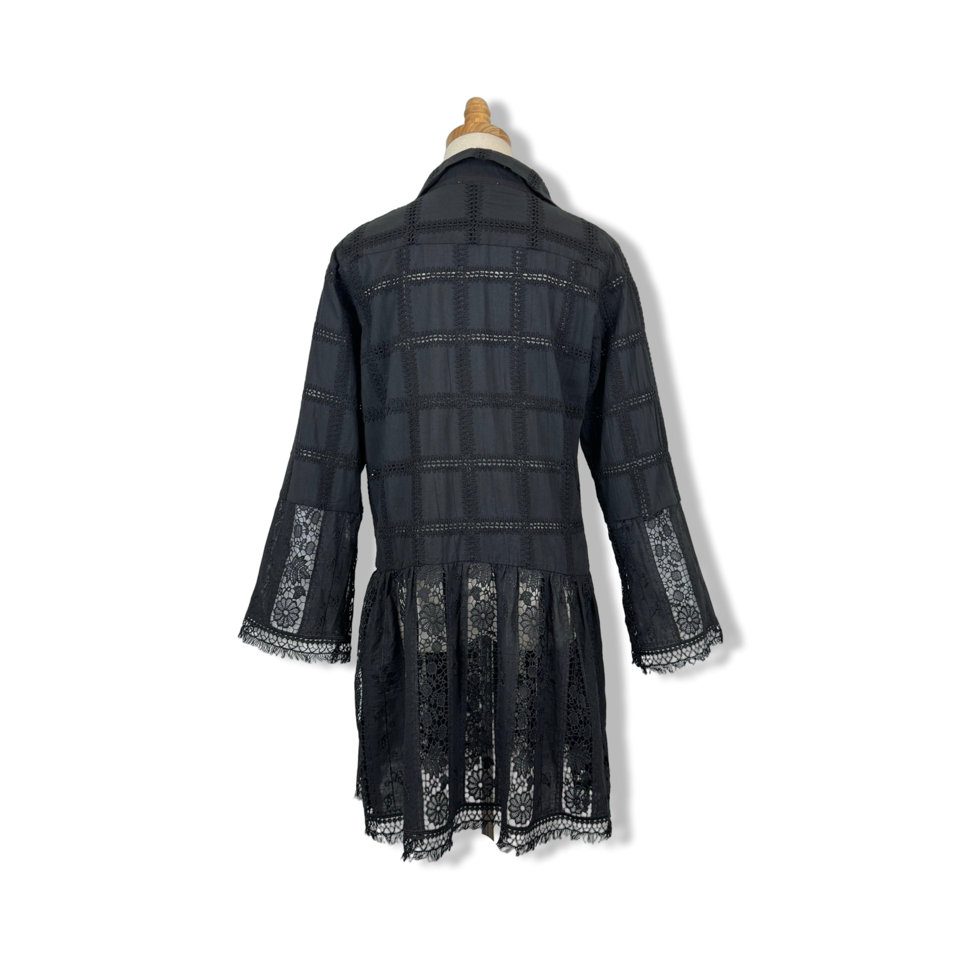 - Long sleeve button up dress with eyelet and floral lace detail. Missing lining.
