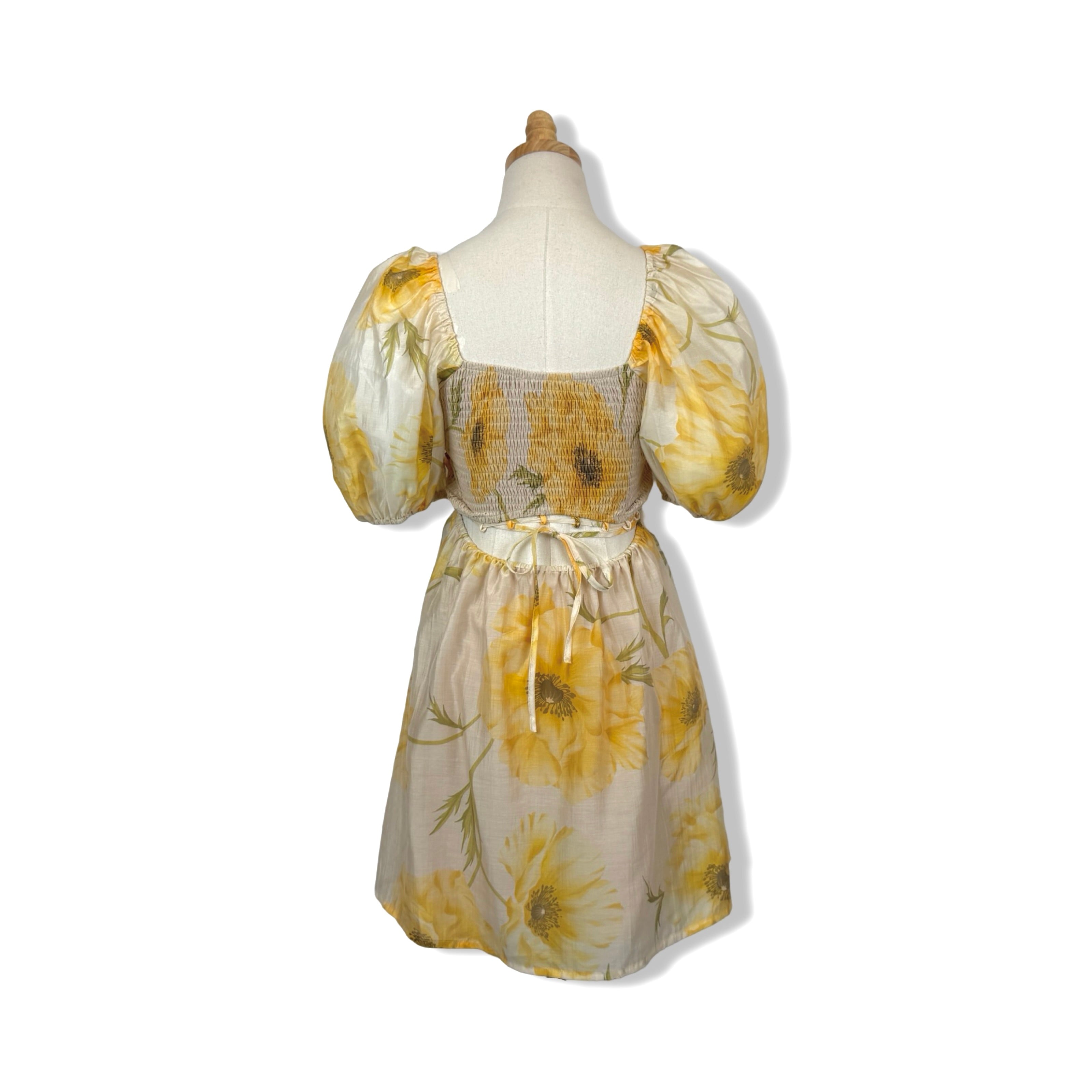 - Puff sleeve mini dress with pleated chest, smocked panel on back with self tie open back.