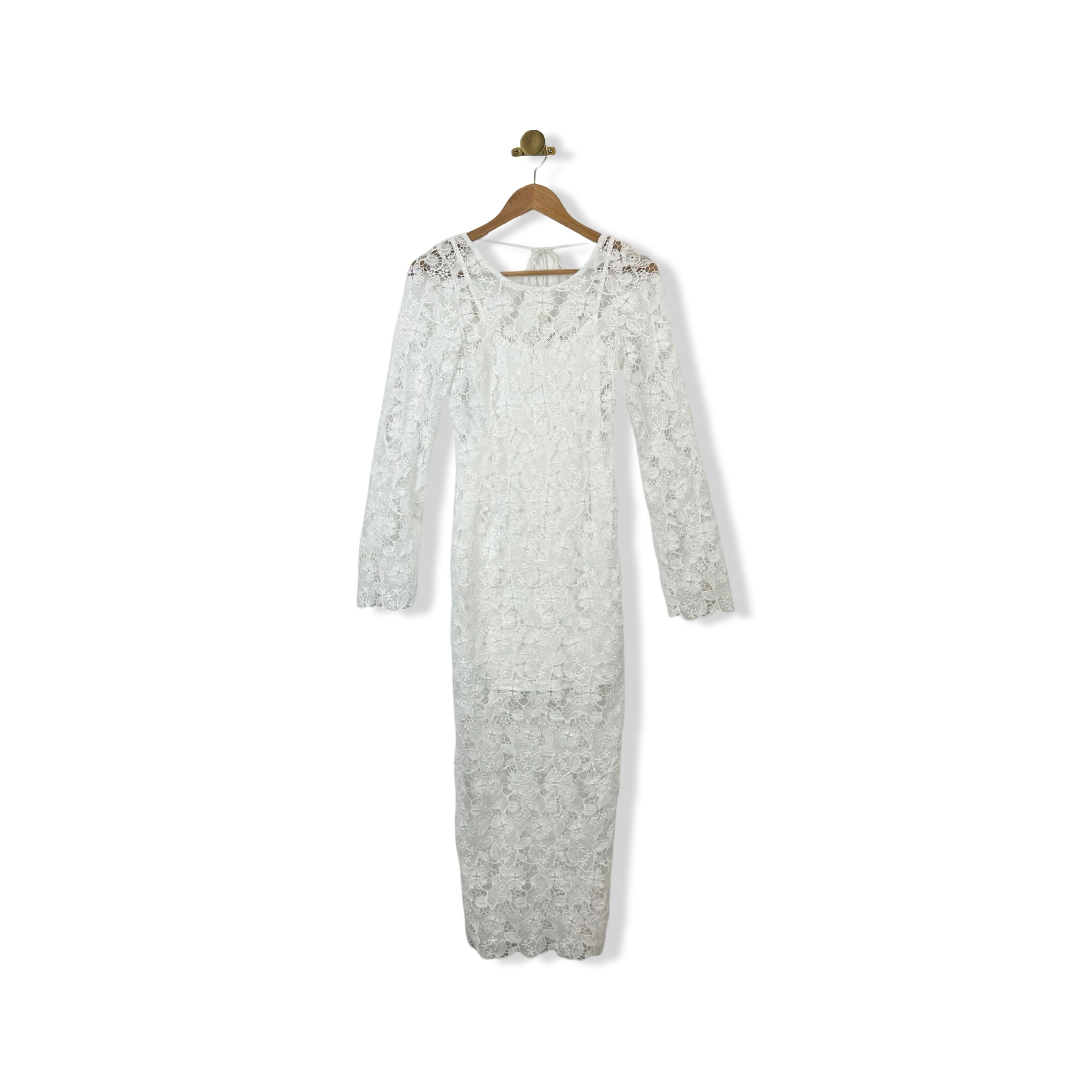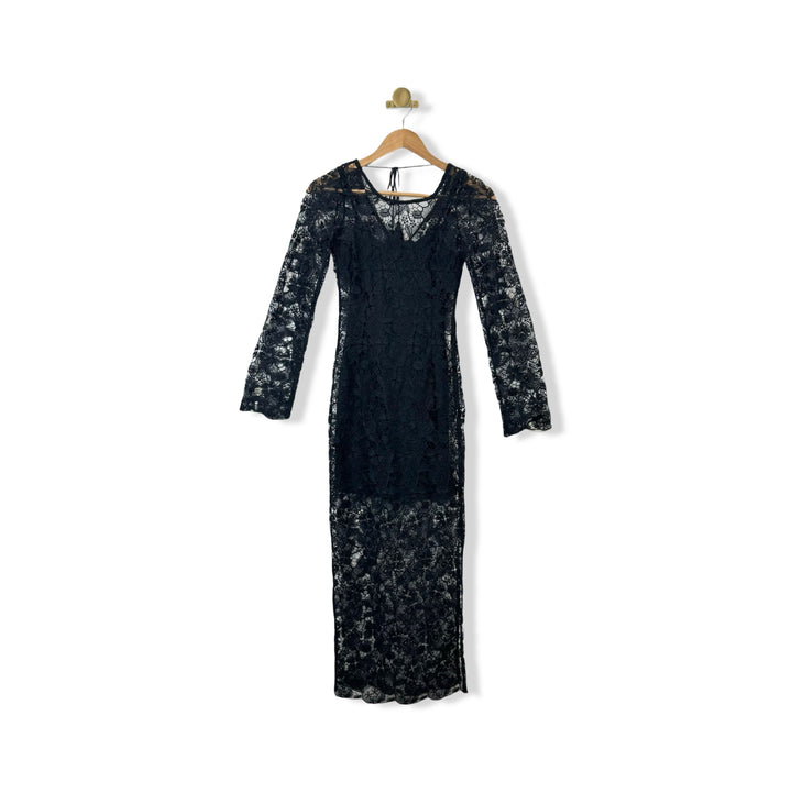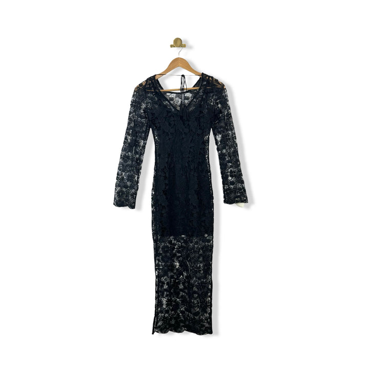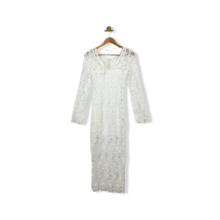 - Long sleeve lace maxi dress with slip layer and self tie detail on back. Back zip closure.