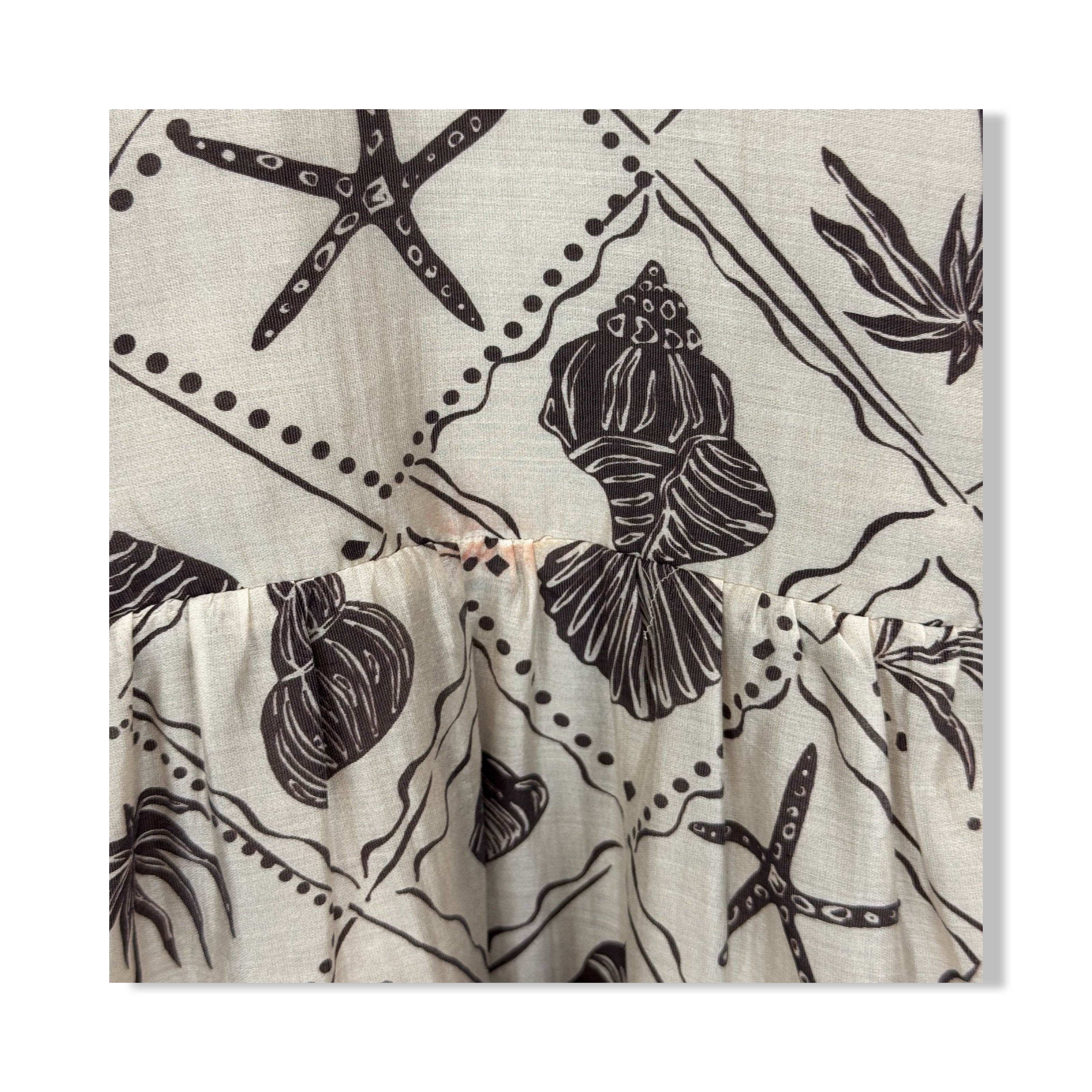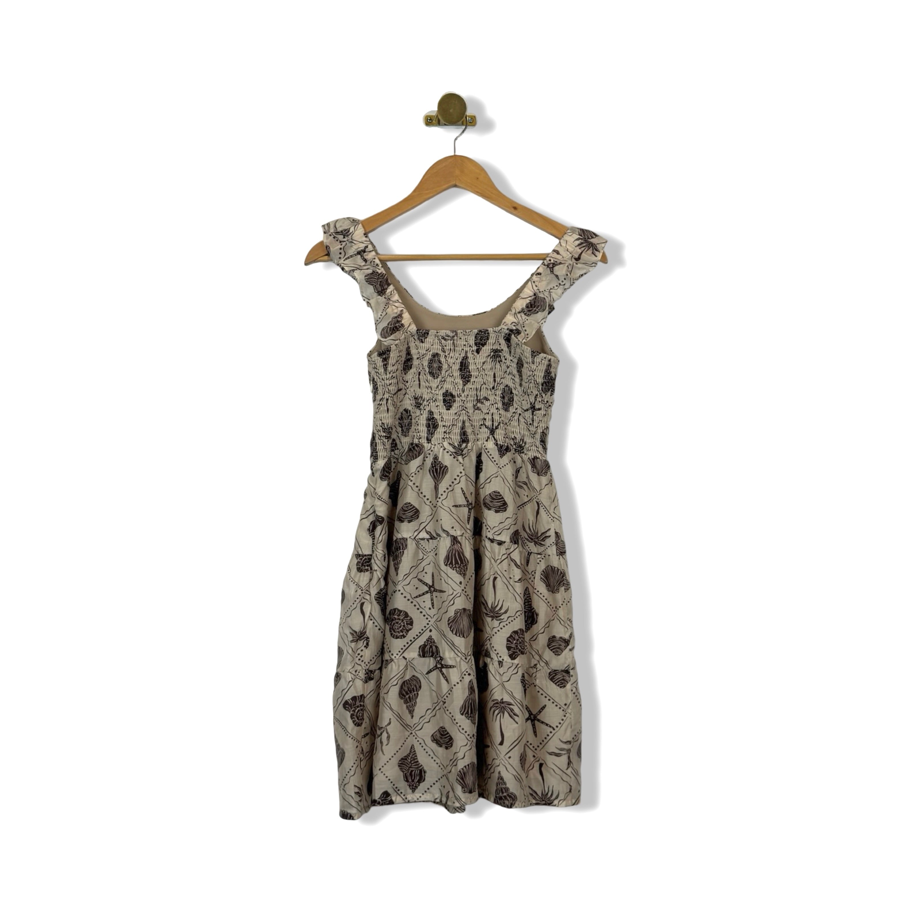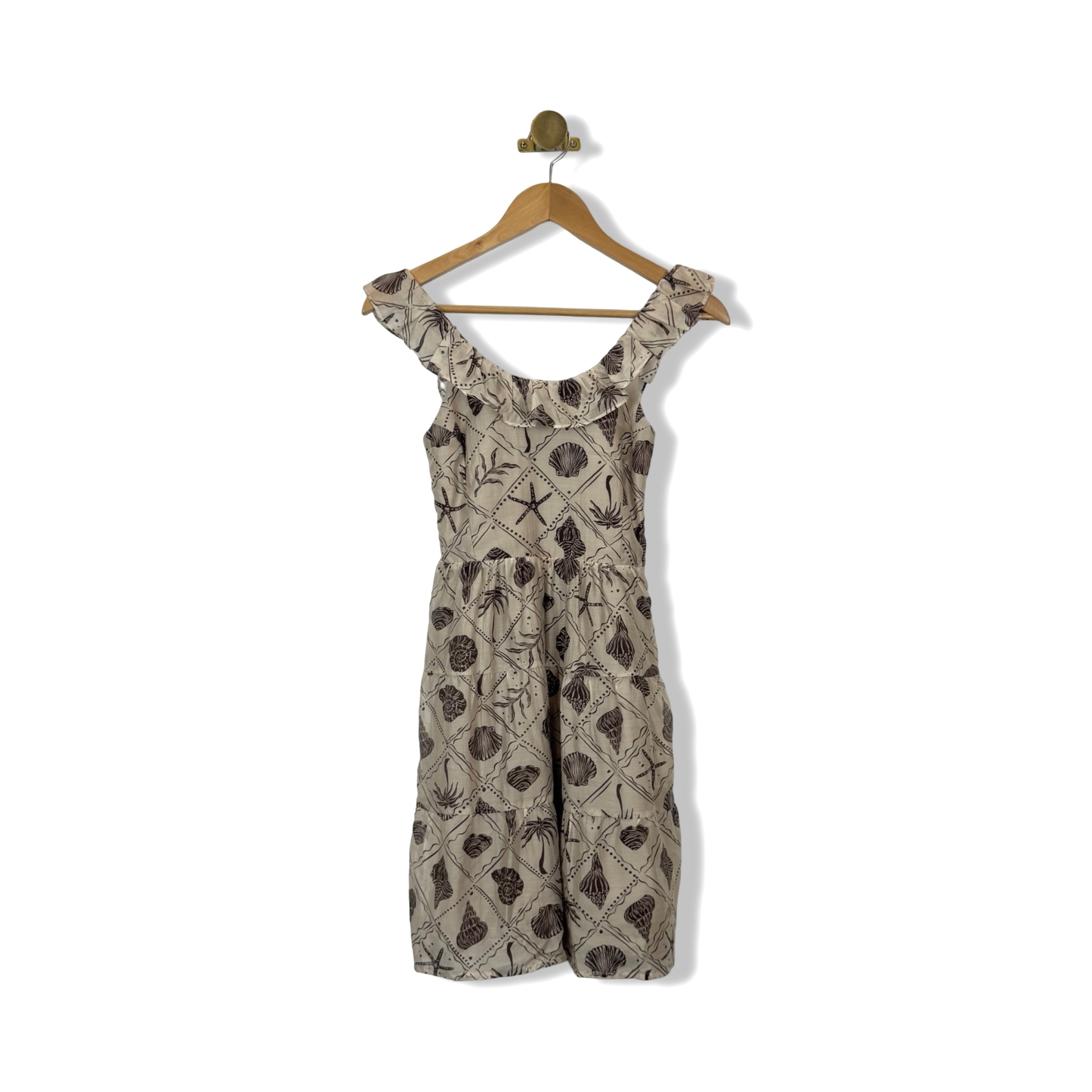 - Mini dress crafted from a printed crepe de chine. It has a tiered skirt, ruffle detailed straps, smock panel on back and side zip closure. Sign of wear on front (pictured)