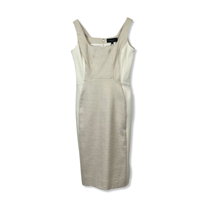 - Sleeveless dress with houndstooth panel and zip closure on back. Labeled size 0 and 4, approx. size US X-Small and Small