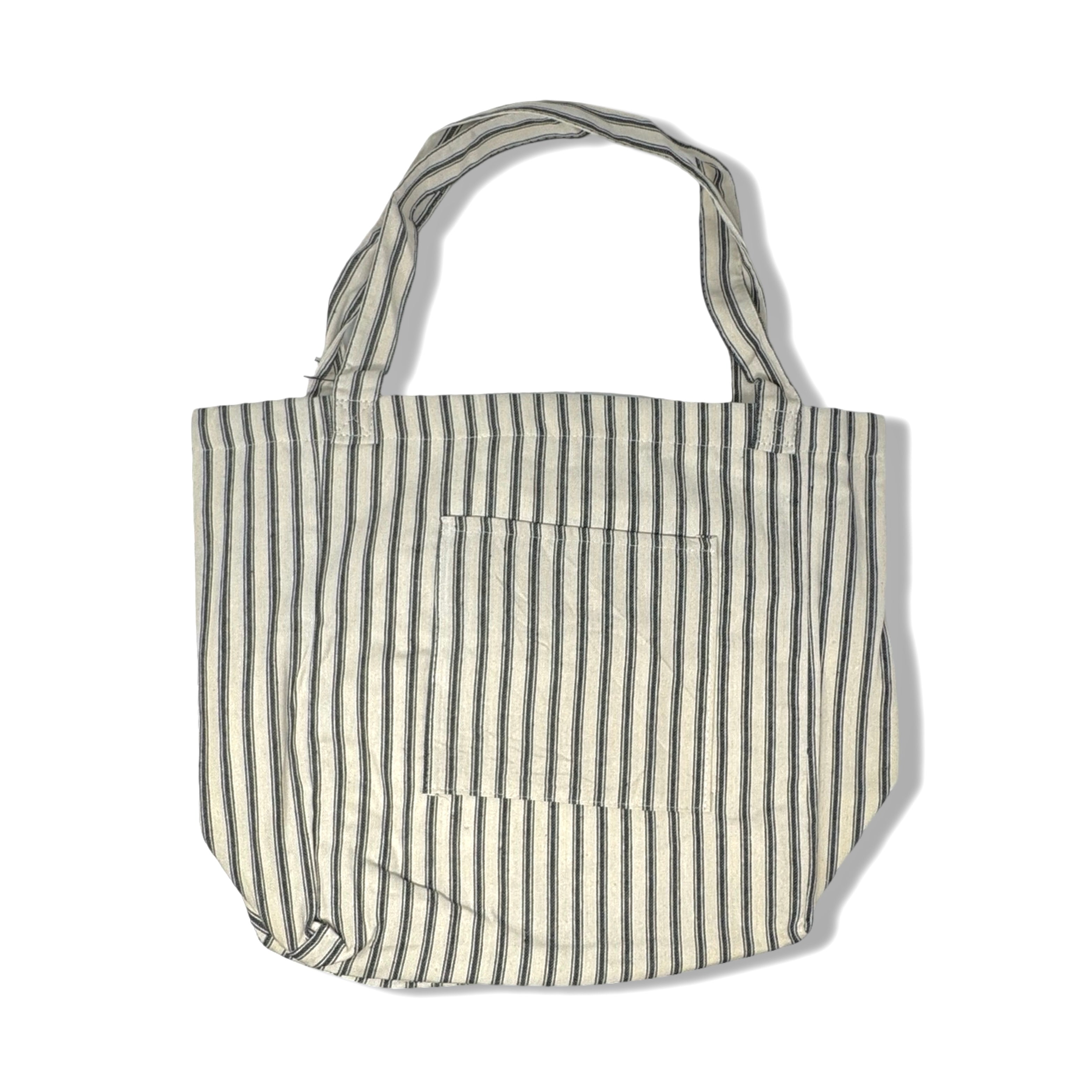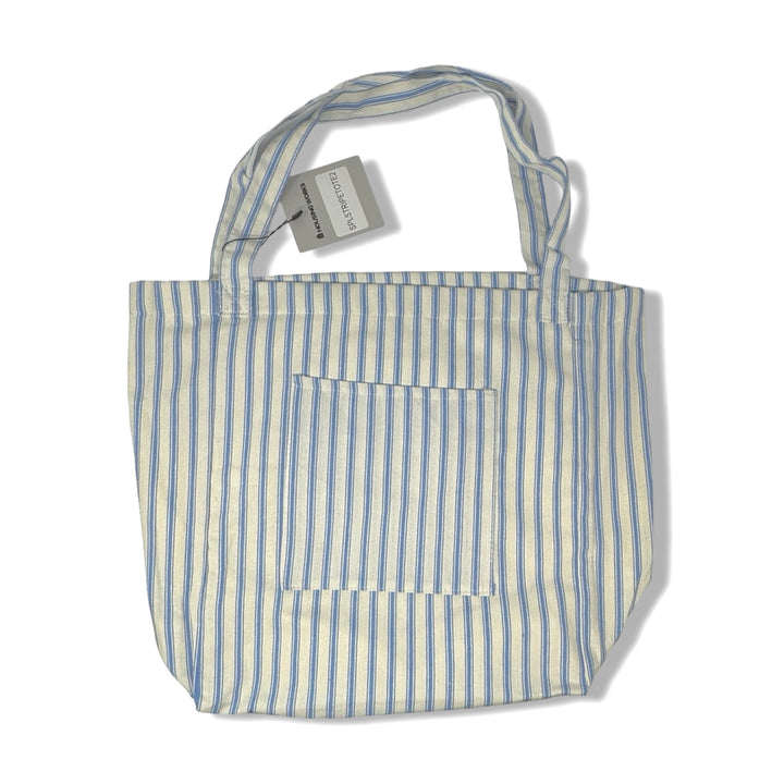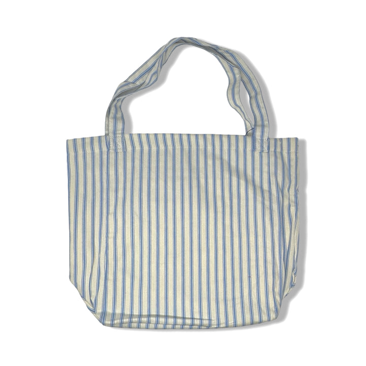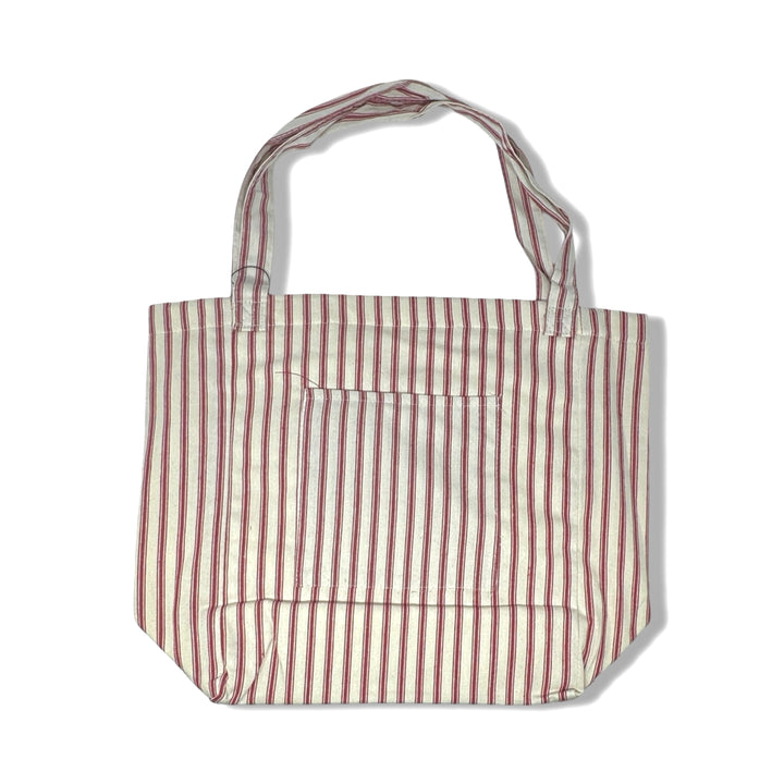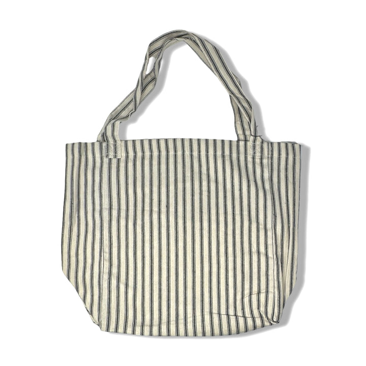 - Lightweight tote bag with interior/exterior pocket and stripe pattern throughout.