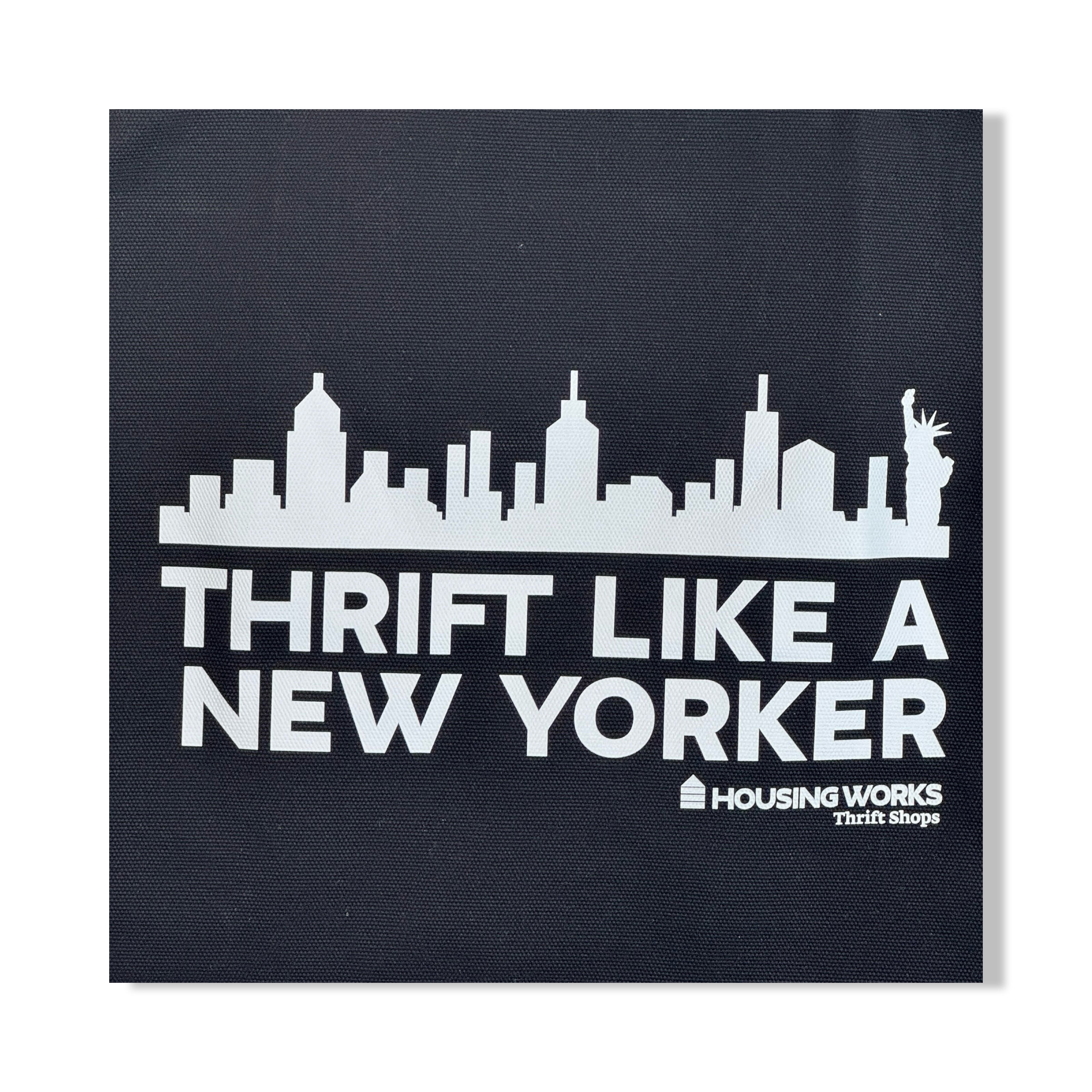- Zip closure heavy canvas tote bag with skyline decal on front, and interior zip closure pocket.