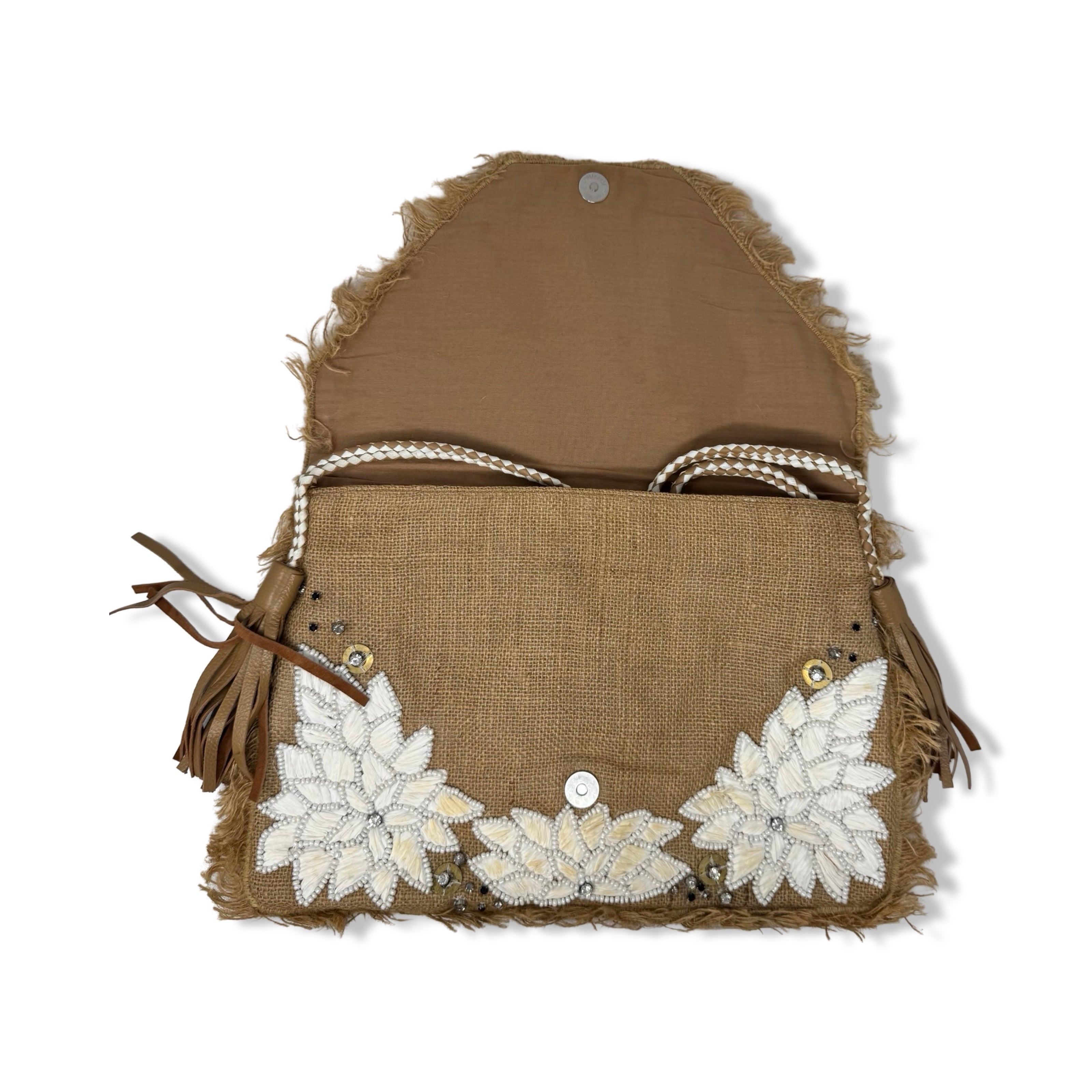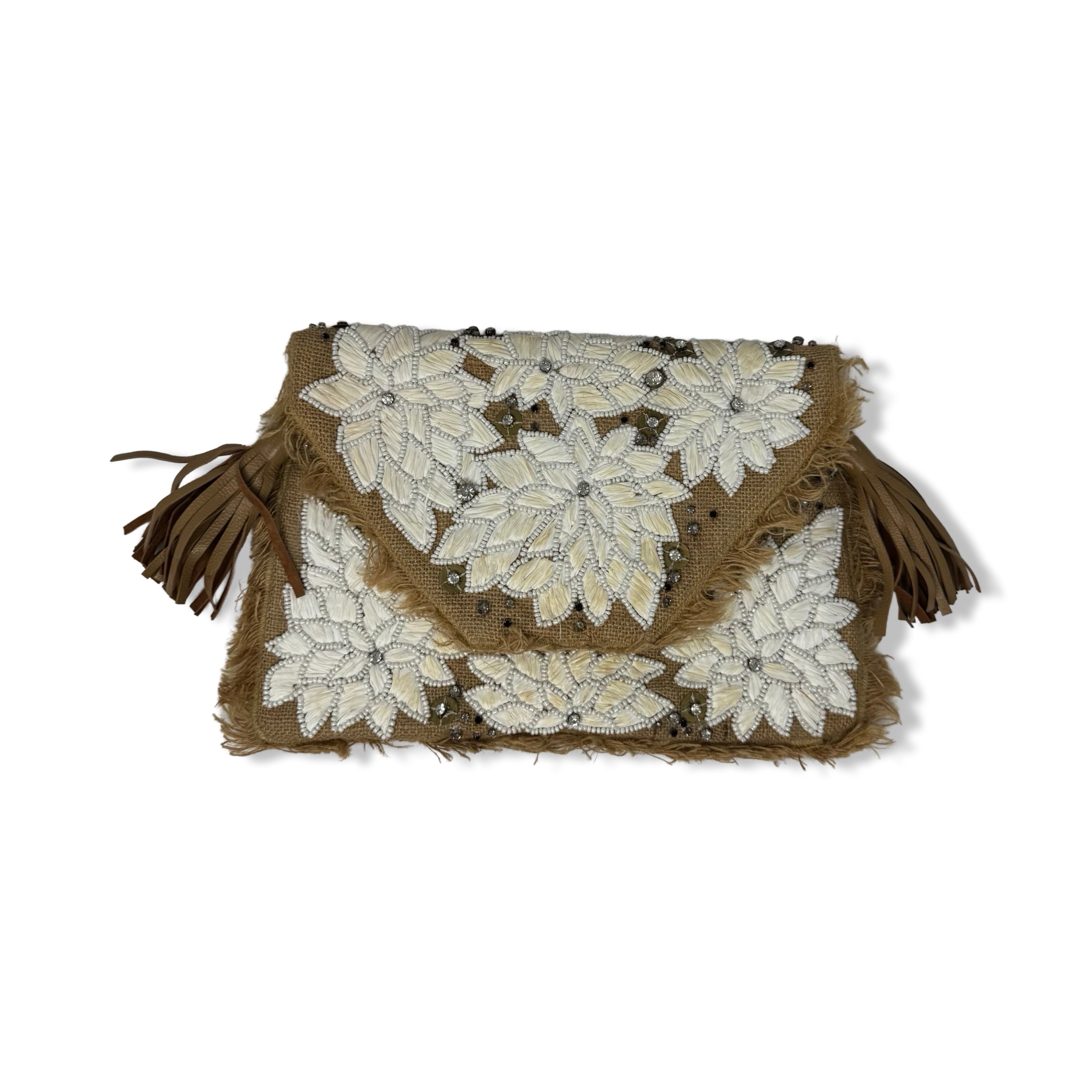 - This envelope style clutch features a magnetic closure and attached crossbody strap for easy carrying. Complete with leather tassels and a beautiful floral detail, it also boasts an interior pocket to keep your essentials organized.