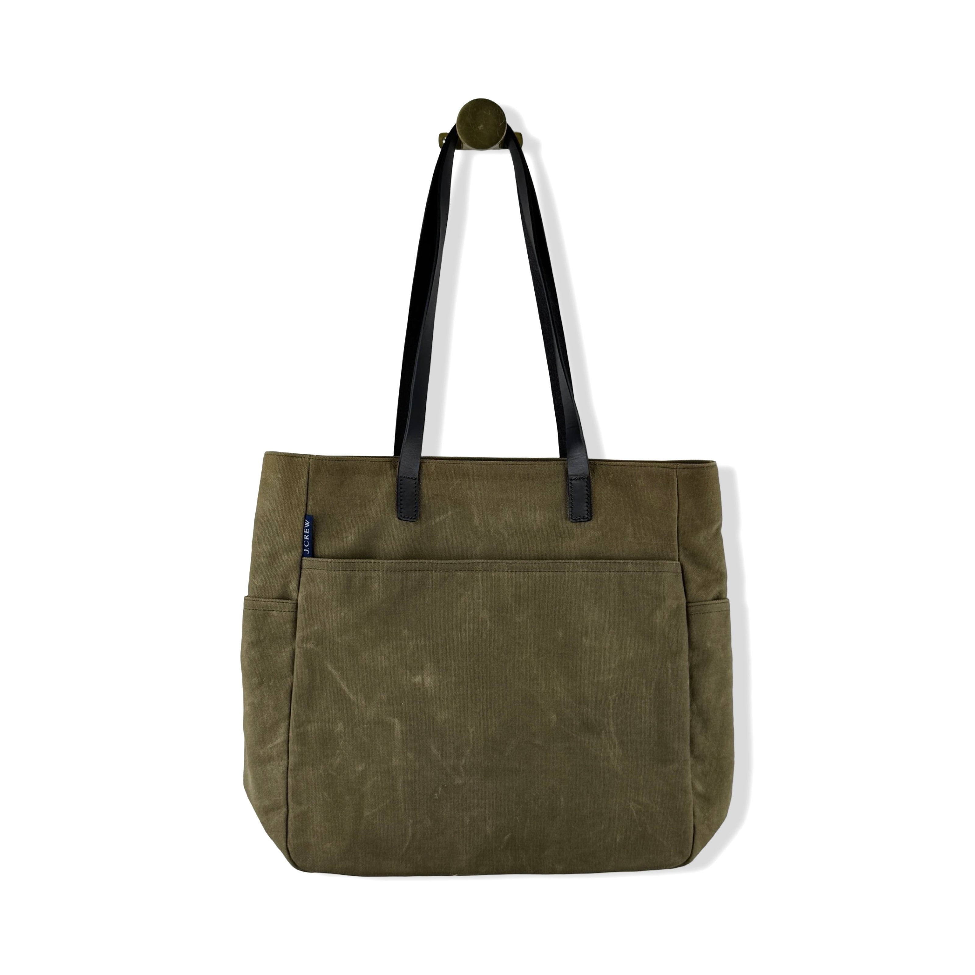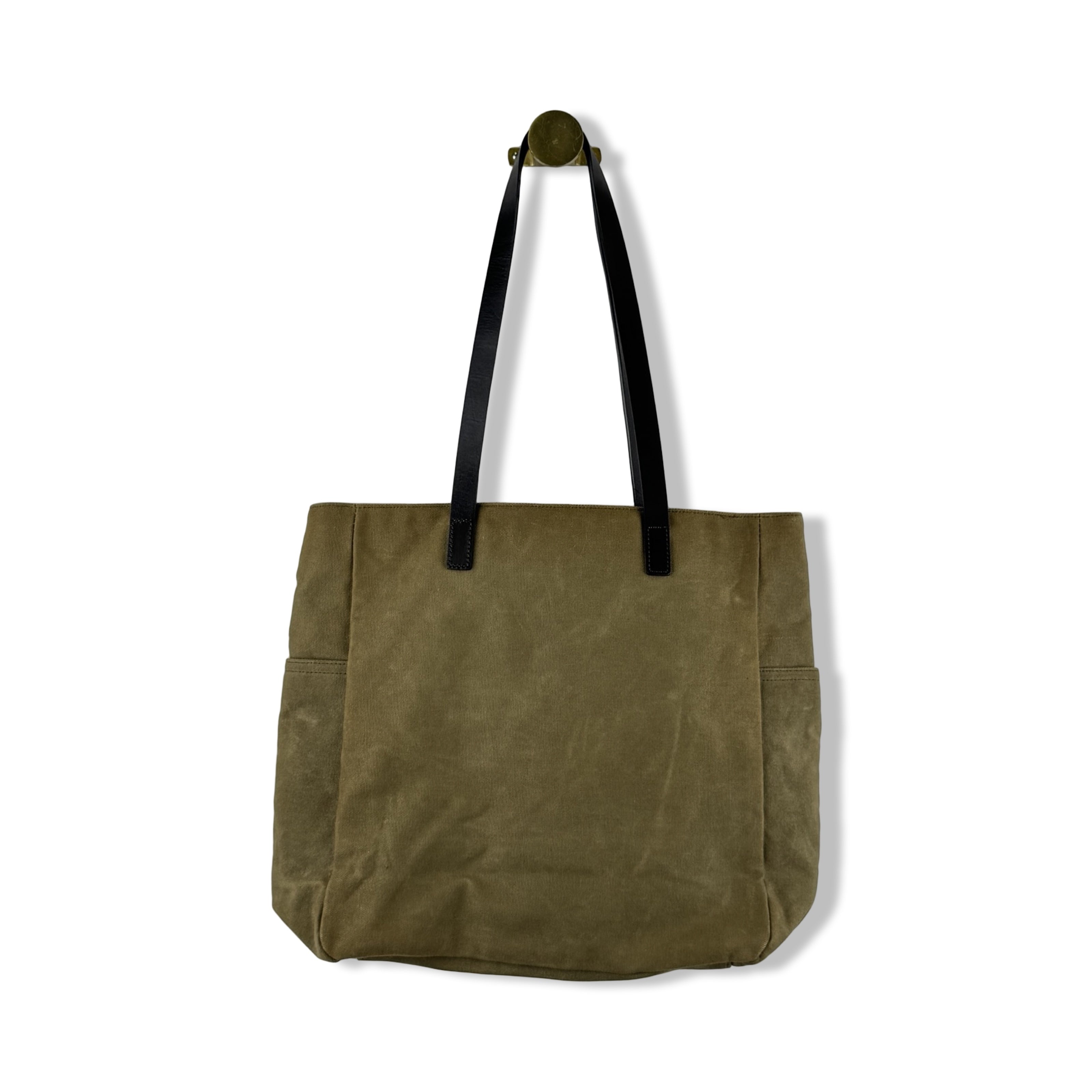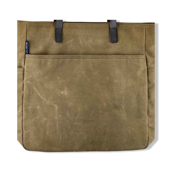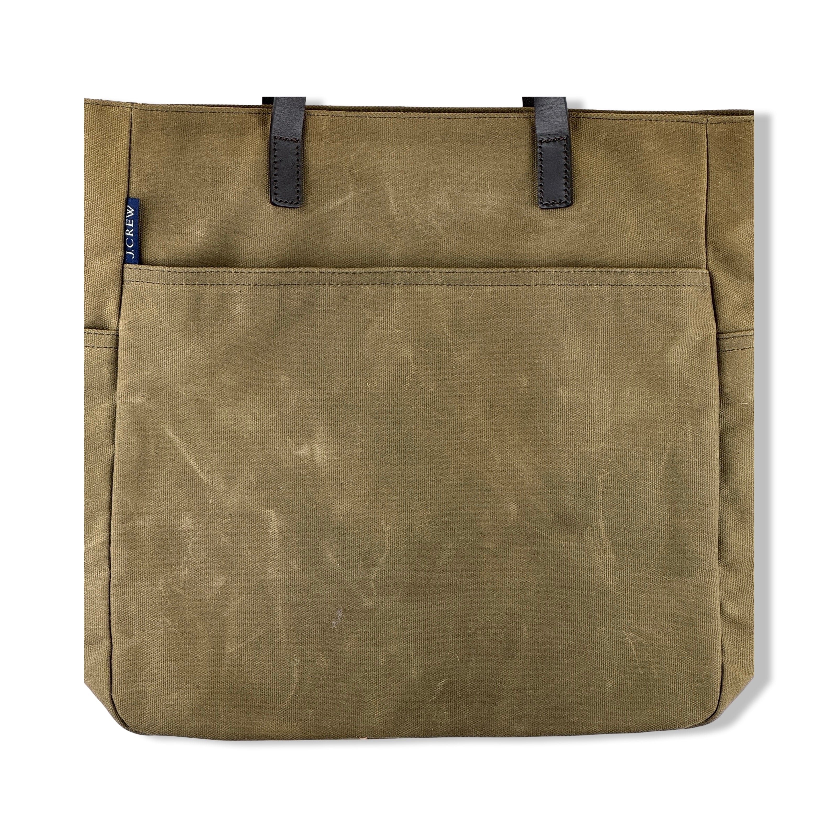 - Canvas tote bag with leather straps, exterior snap closure pocket and side pockets. Some signs of wear