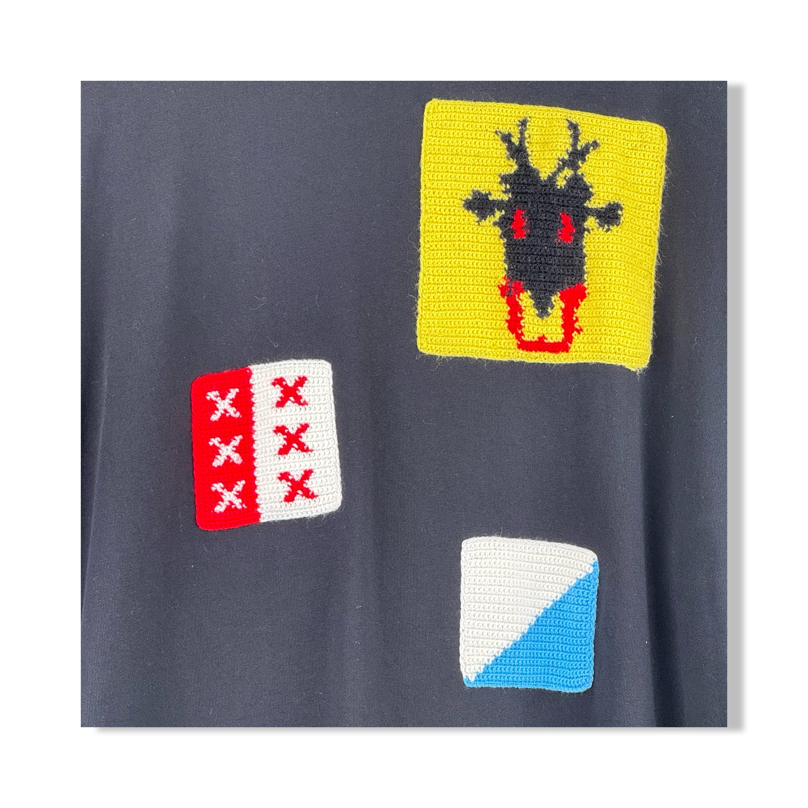- Long sleeve pull over with crochet patchwork on front. Rib knit trim on neckline, cuffs, and hem. Labeled one size. Please check measurements for reference